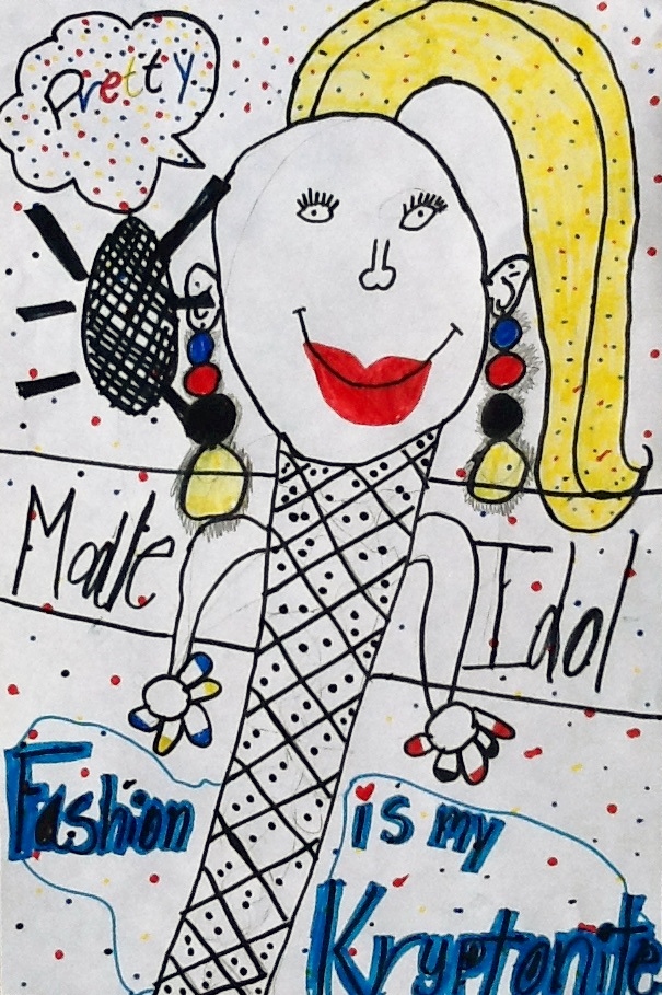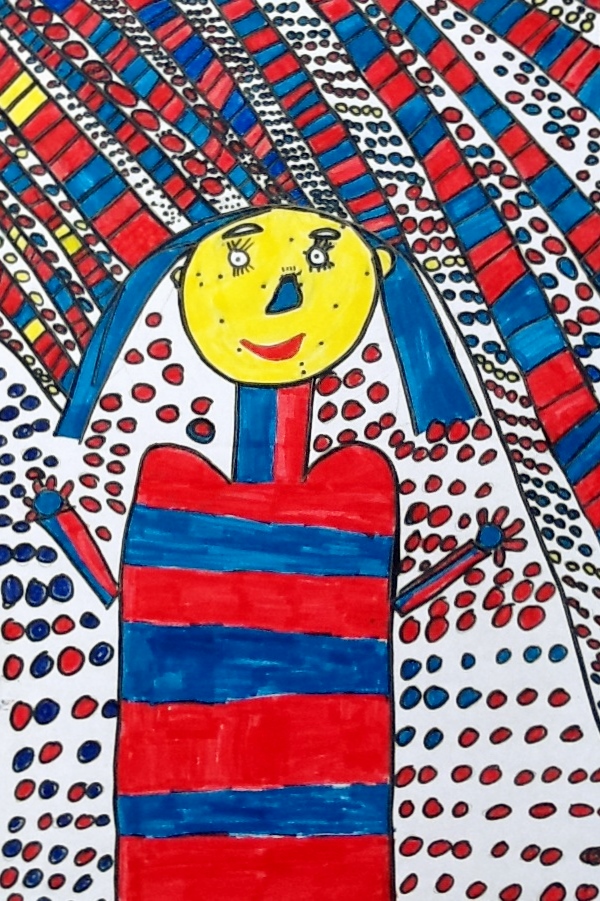 The goals for this portrait were to use only primary colors plus black and white, incorporate their own version of Lichtenstein Ben-Day dots in one or more parts of their portrait (…seeing several students banging their pencils as fast as they could staccato-style on their portraits let me know that I needed to clarify several right ways and one wrong way to Ben-Day dots – ha!…), and add stripes like Roy Lichtenstein used in his paintings.
