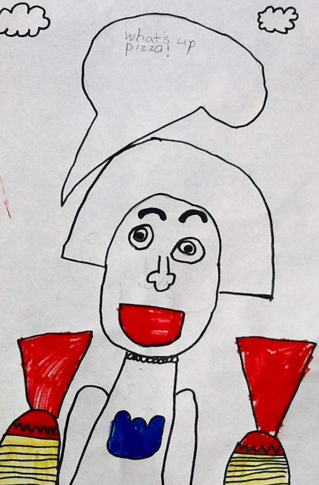 Once the art students completed drawing their portraits, they added a word bubble of their choosing with a word that described them. We talked about how a thought bubble and an excited word explosion bubble would look very different. As the project progressed, we talked a lot about how a self portrait features the person’s face and part of their body, but that the background is just as important for adding details.