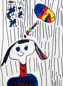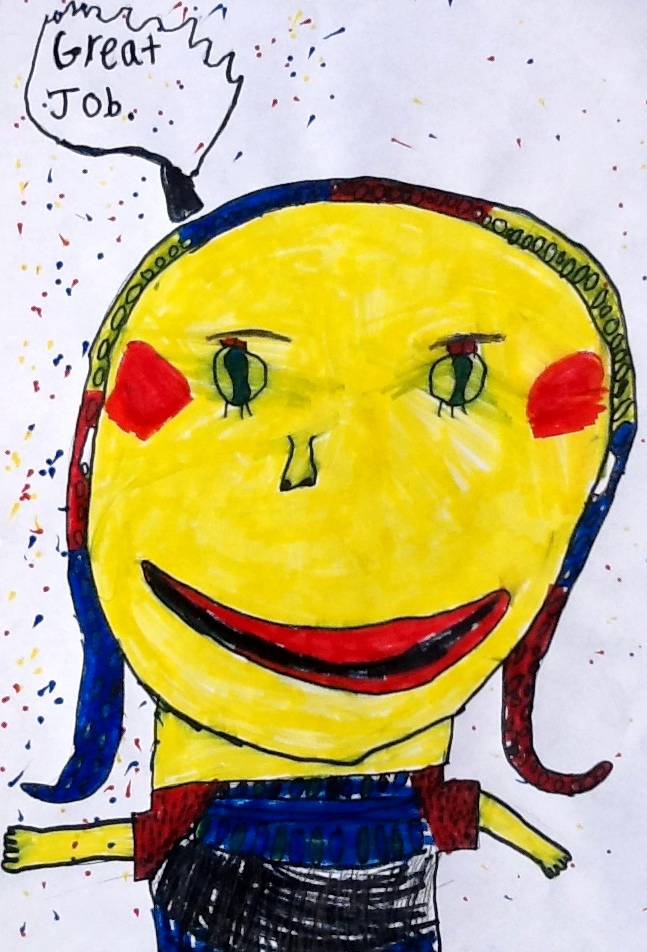 I passed out the drawing paper, the pencils, the primary-colored markers, and a new art tool – a mirror. Each student got a mirror and drew their reflections as seen from the mirror. They were fascinated!