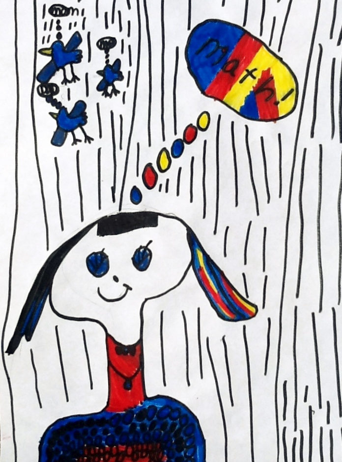 We talked about how dots and stripes can be colored or patterned differently, and how you could make something solid or give it a pattern. We also talked about how you can choose to leave parts of your artwork white. Balance was discussed frequently with each student as we talked one on one about their artwork.