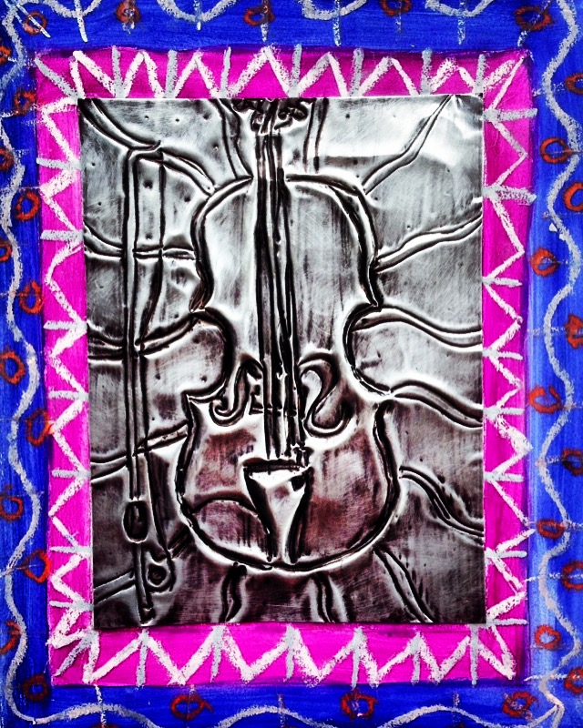 This project is layered – drawing from observation, engraving aluminum sheeting, painting with tempera paint, drawing patterns with oil pastel, and learning about then immediately applying color theory.
