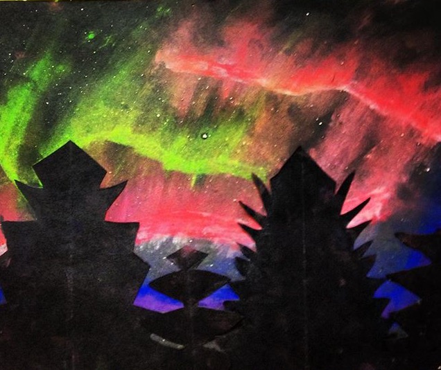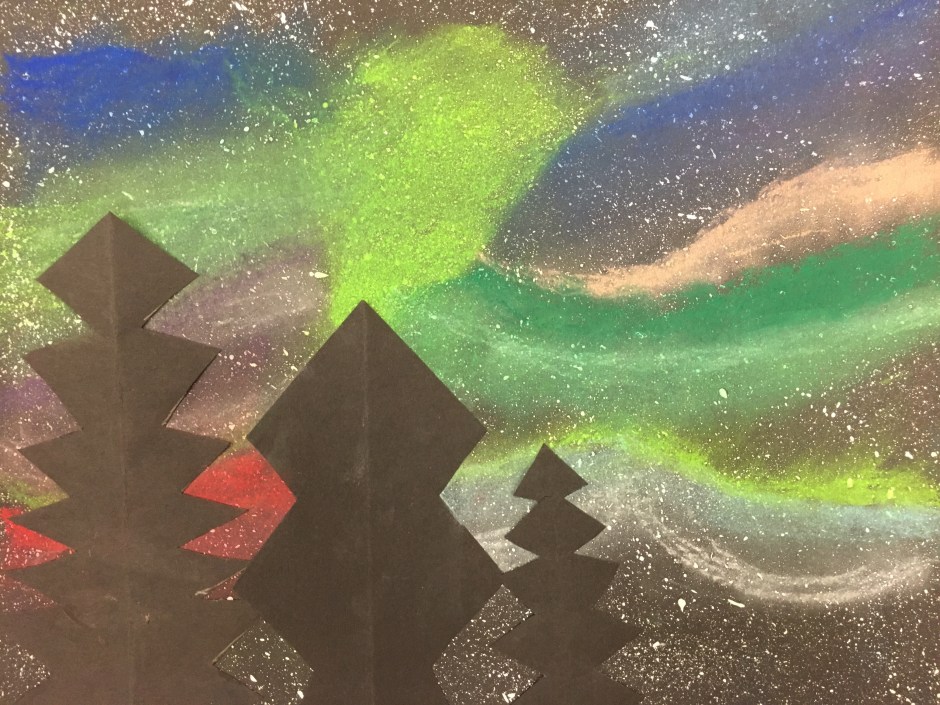 Once they cut about 4-6 trees, they glued them onto their Aurora Borealis drawing and voila!