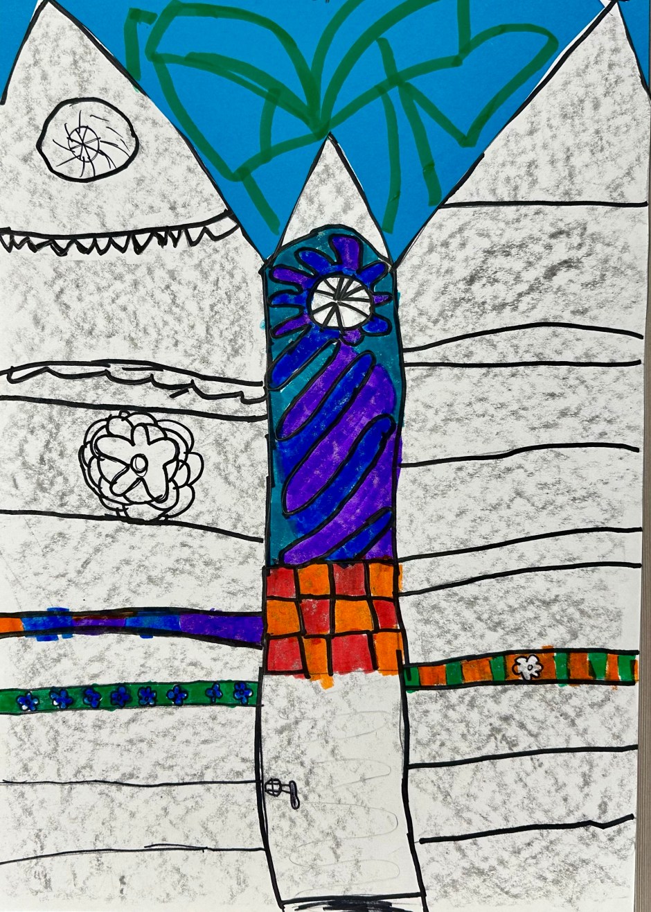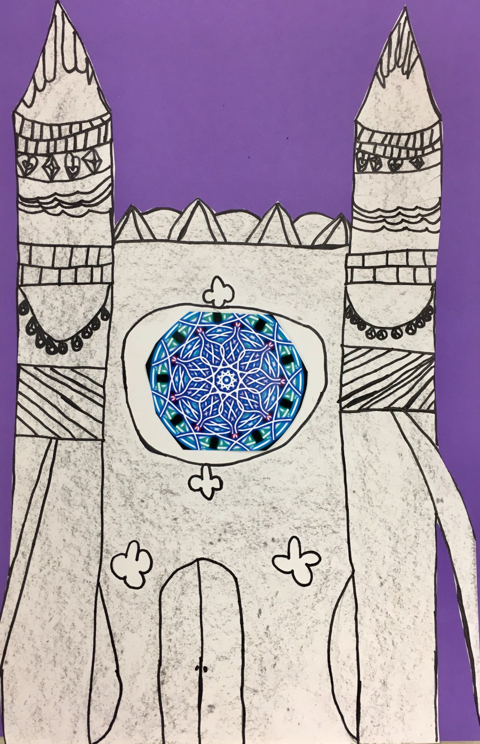 We drew freehand a “placeholder circle” (like “zero” is a placeholder in math) for our Rose Windows. I told them not to worry if it’s not a perfect circle – just draw the best circle you can. I told them to make sure there’s a door on their cathedral and lots of windows. They just went for it and came up with some amazing cathedrals.