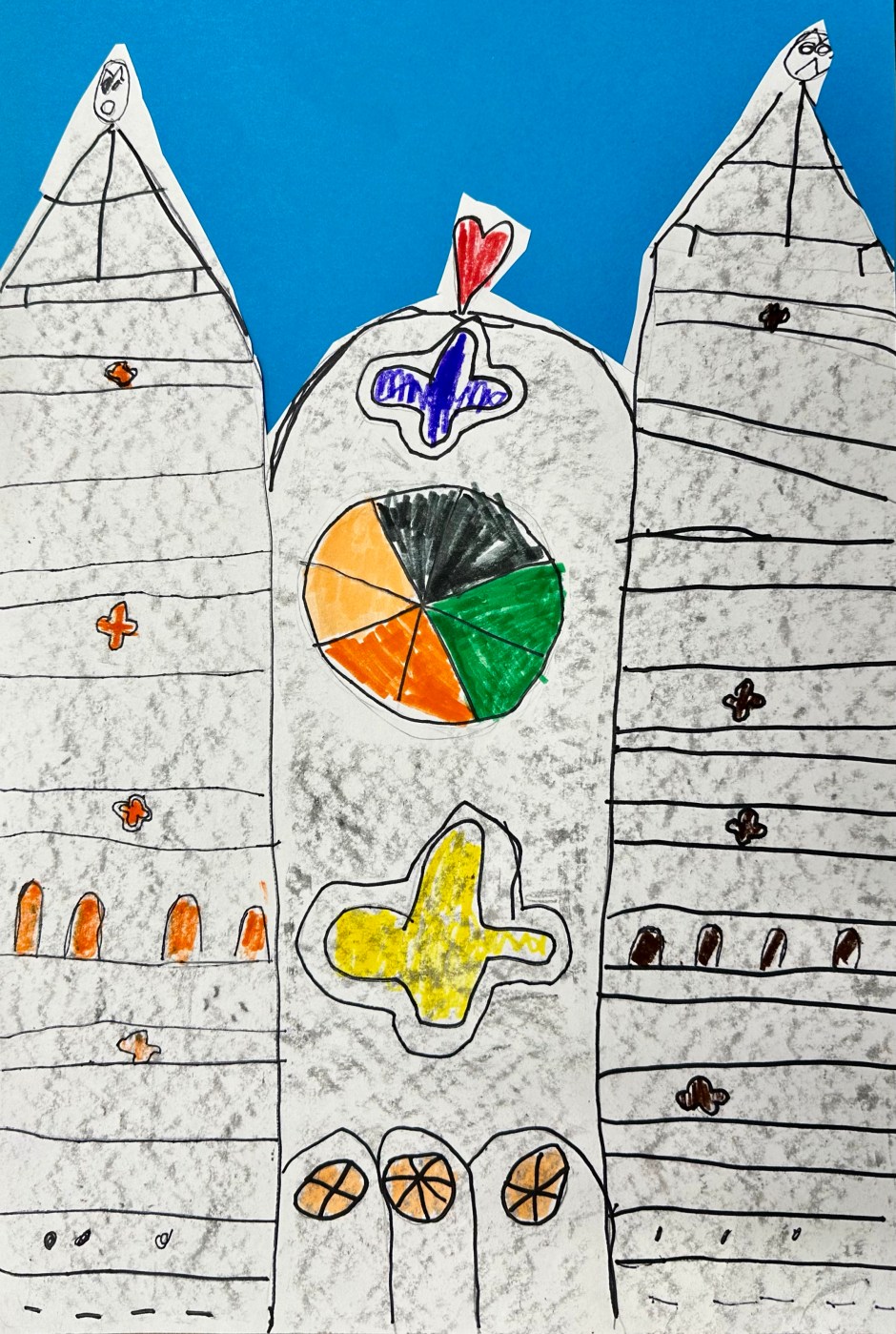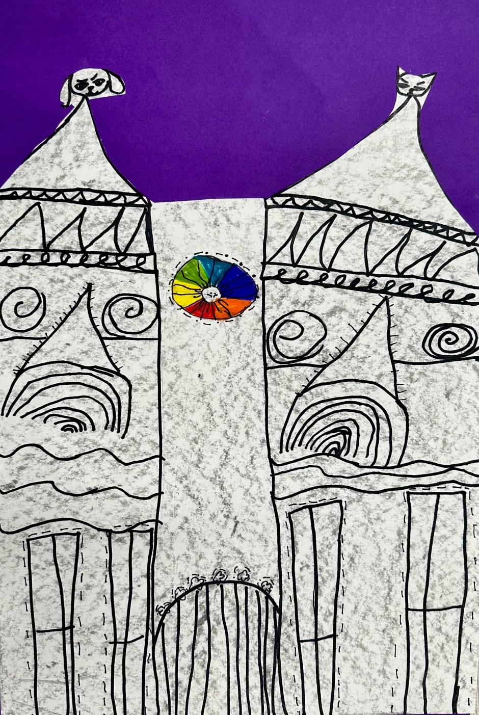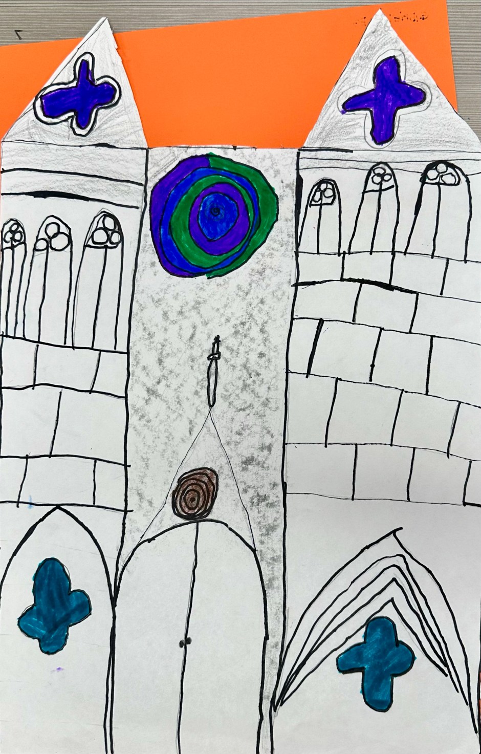 Then we traced out pencil-drawn cathedrals with Sharpies. After erasing any stray pencil marks, we used a peeled gray crayon sideways and created a stony texture on our cathedral. Then we cut it out and glued it onto construction paper.