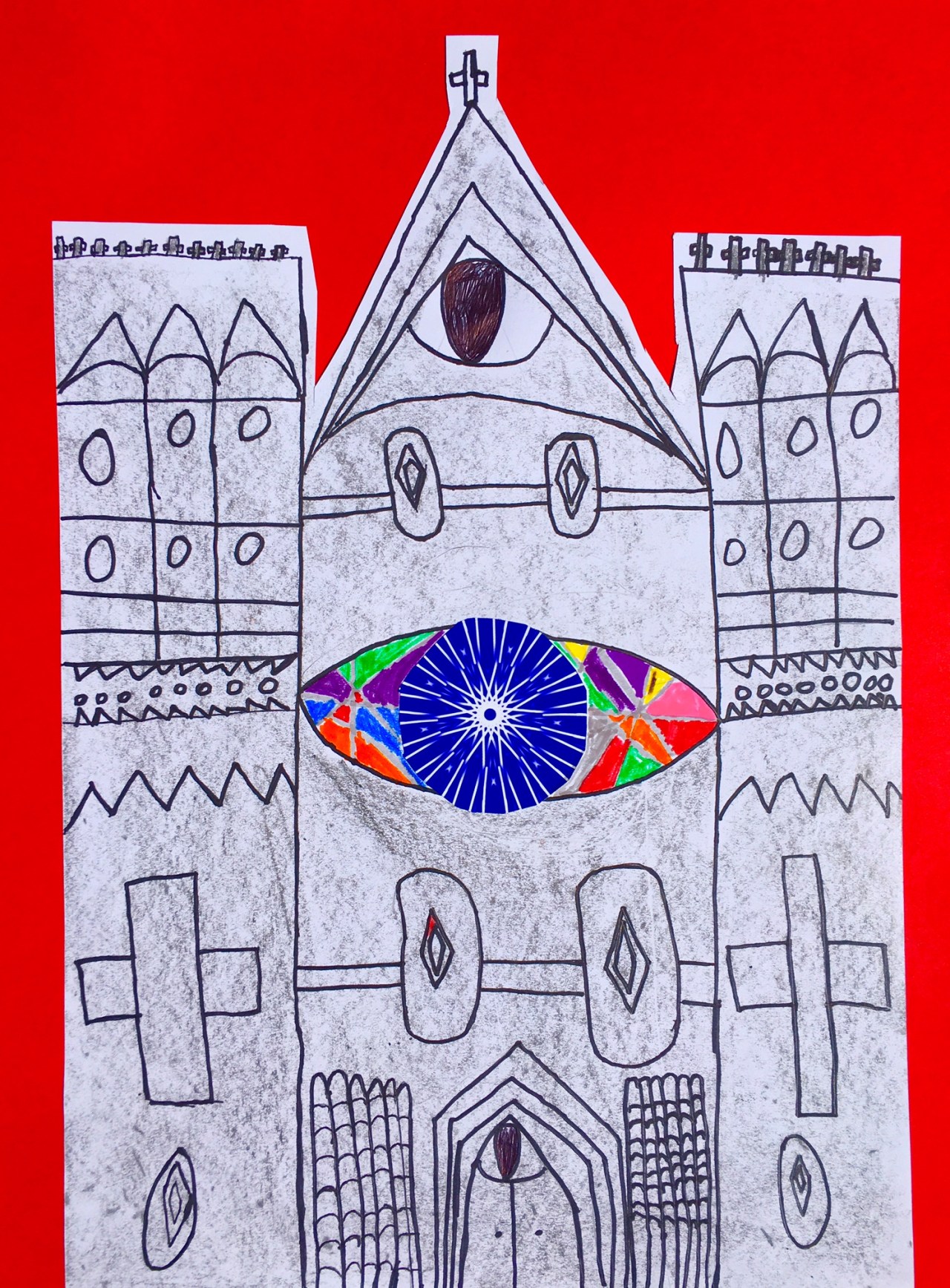 Then we traced out pencil-drawn cathedrals with Sharpies. After erasing any stray pencil marks, we used a peeled gray crayon sideways and created a stony texture on our cathedral. Then we cut it out and glued it onto construction paper.