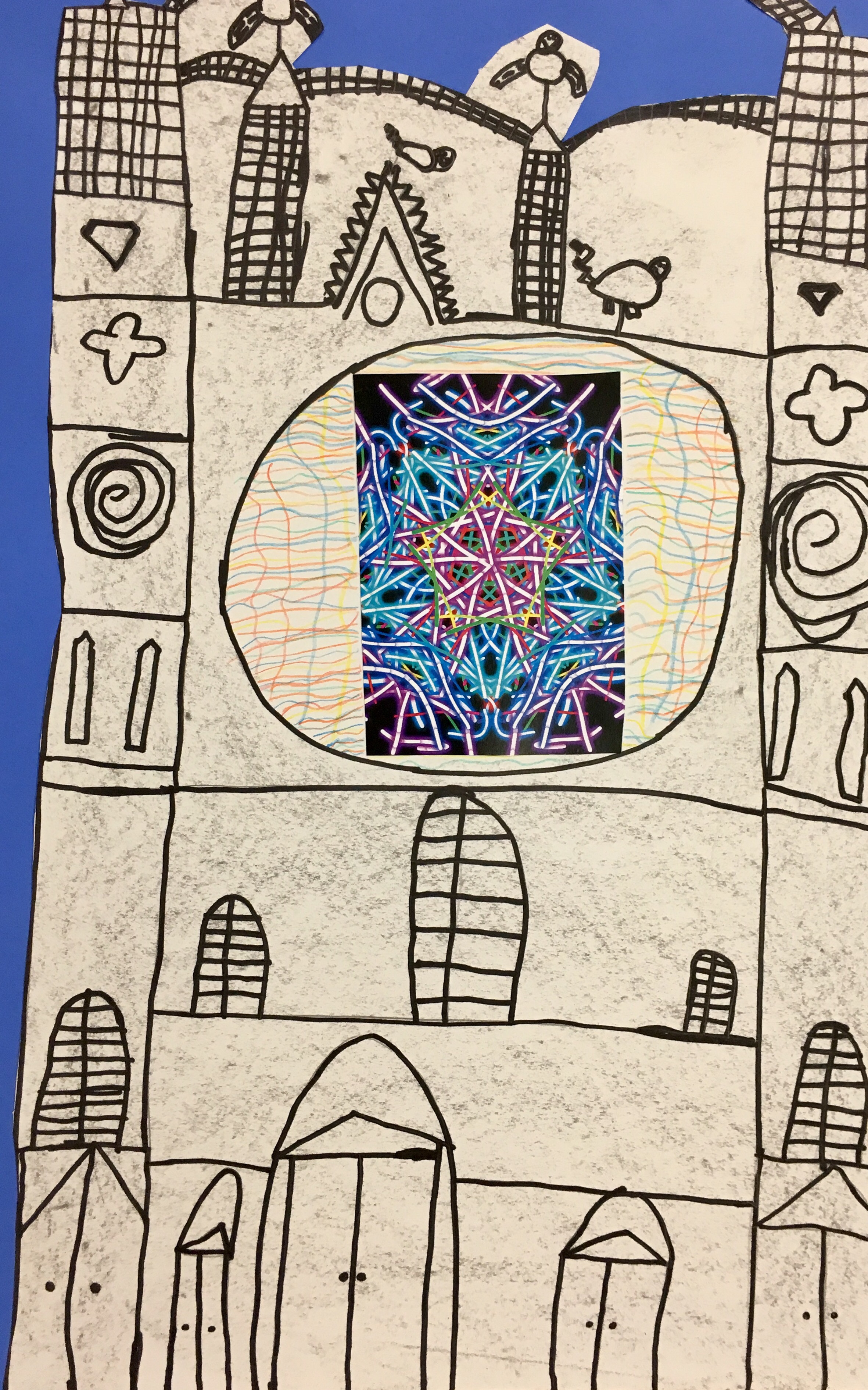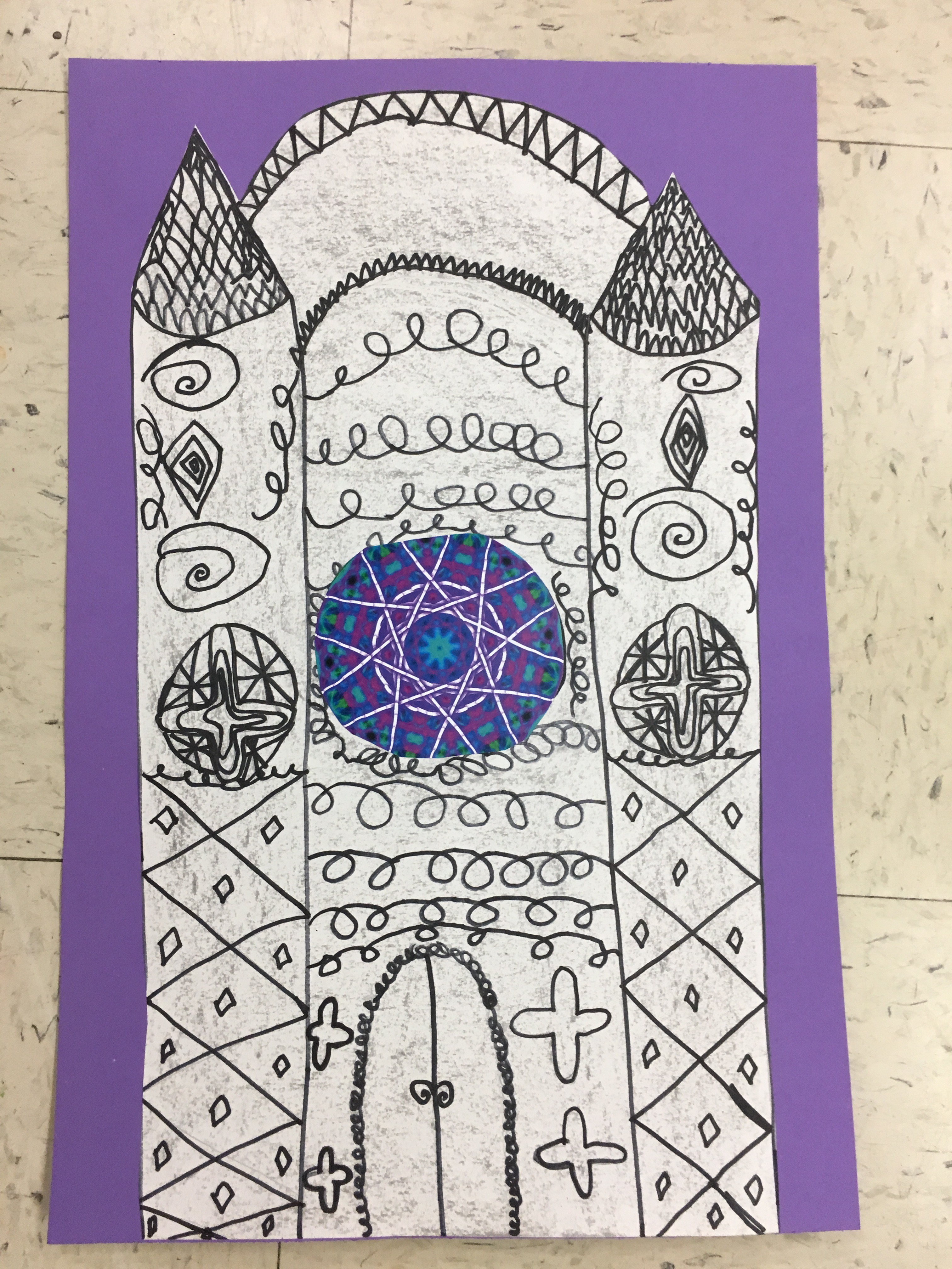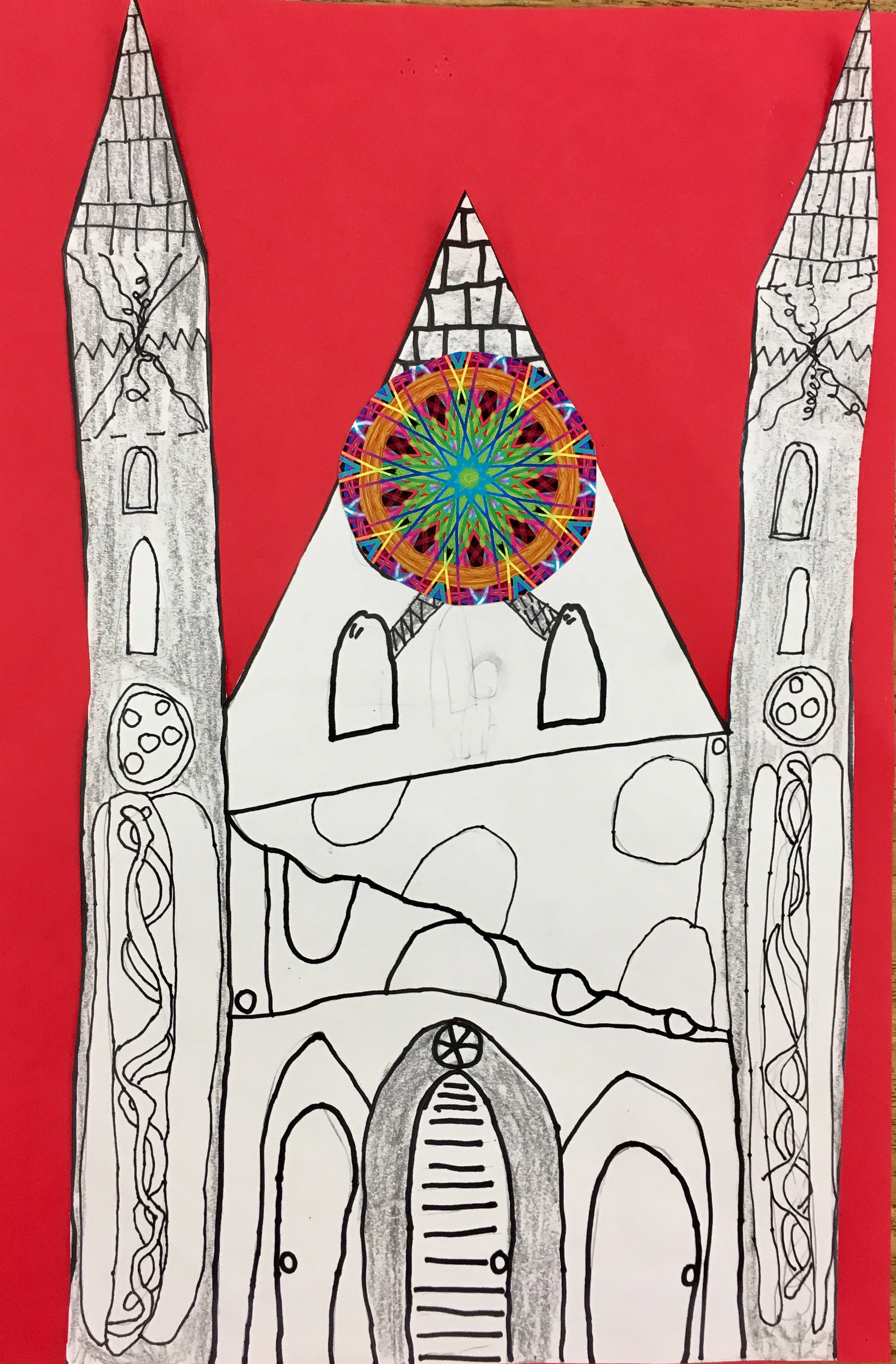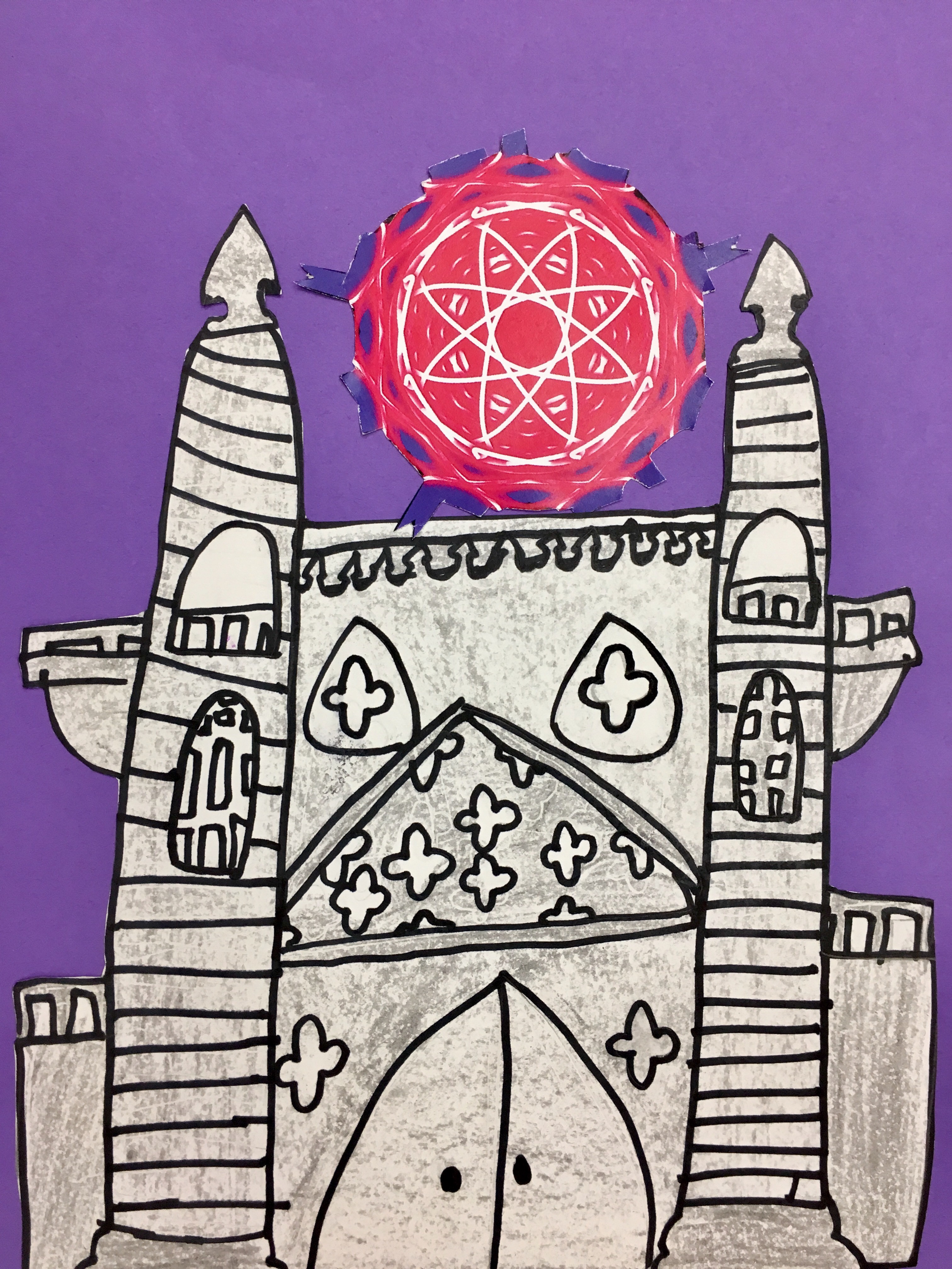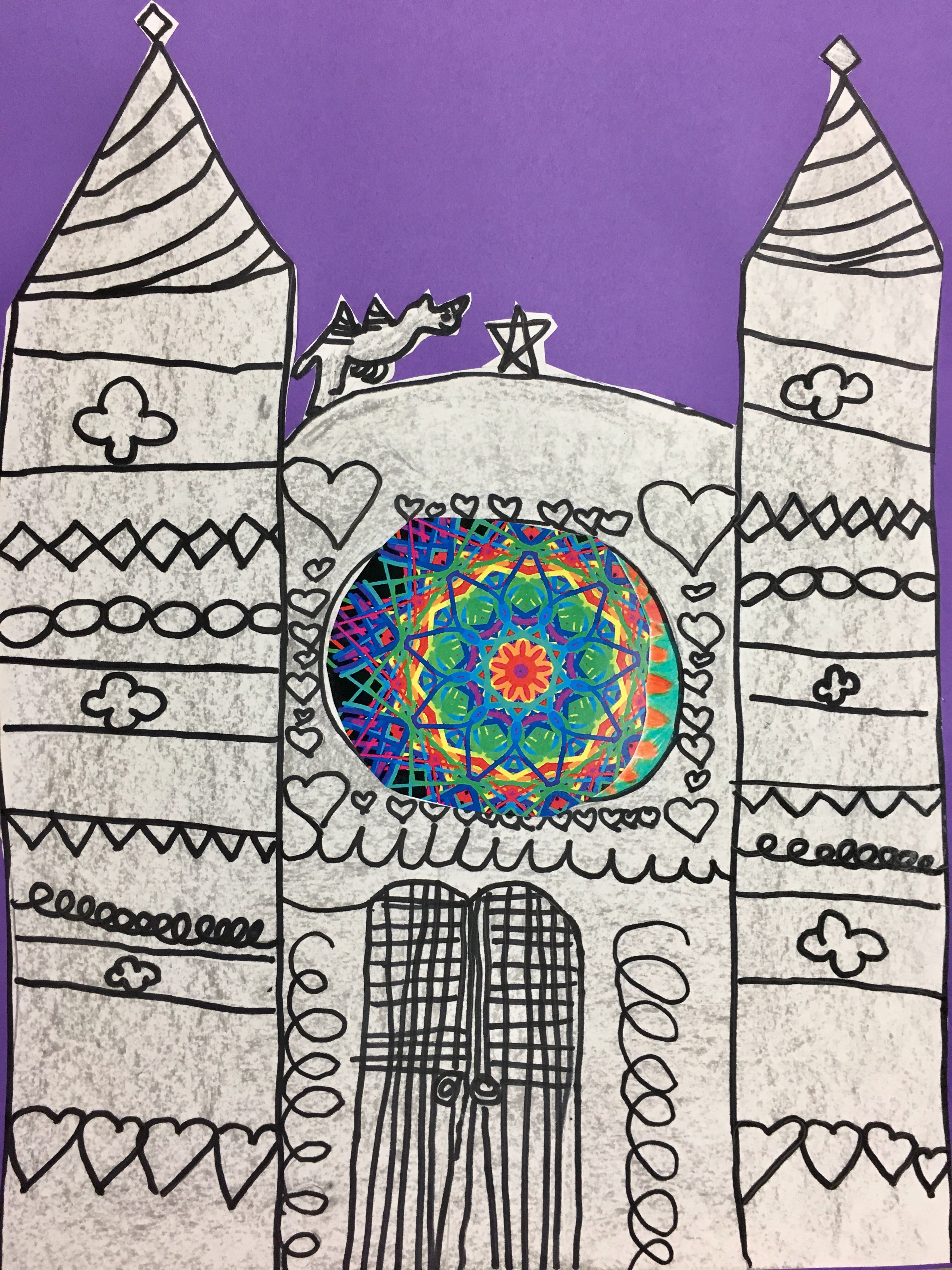 We drew freehand a “placeholder circle” (like “zero” is a placeholder in math) for our Rose Windows. I told them not to worry if it’s not a perfect circle – just draw the best circle you can. I told them to make sure there’s a door on their cathedral and lots of windows. They just went for it and came up with some amazing cathedrals.