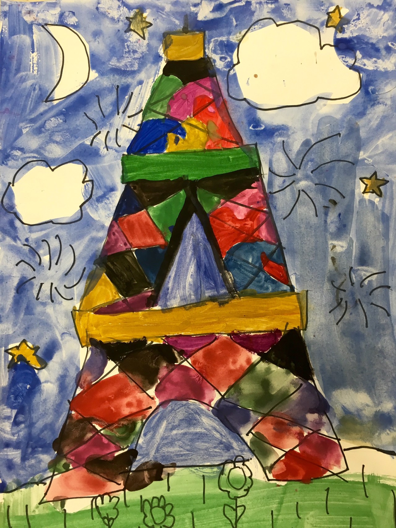 I show them how to avoid having their Eiffel Tower float away by grounding it in the drawing, and then I show them how to add color by painting it with tempera paint (after they’ve re-drawn their pencil lines with Sharpie.) Lots of color! It’s fun to see them amaze themselves by drawing a really cool Eiffel Tower, then adding the color layer.