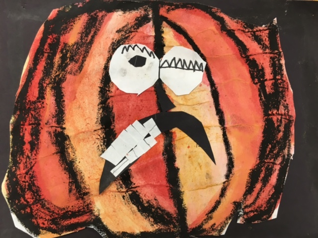 I dare you to take a look at these Kindergarten pumpkins and not fall in love with them! I got the idea from Patty Palmer’s Deep Space Sparkle lesson, Funny Face Pumpkin Project. Our pumpkins were made like hers but we used the Richeson solid tempera paint (hockey pucks) instead of liquid tempera paint, and then went over our pumpkin segment lines with black chalk pastel.
