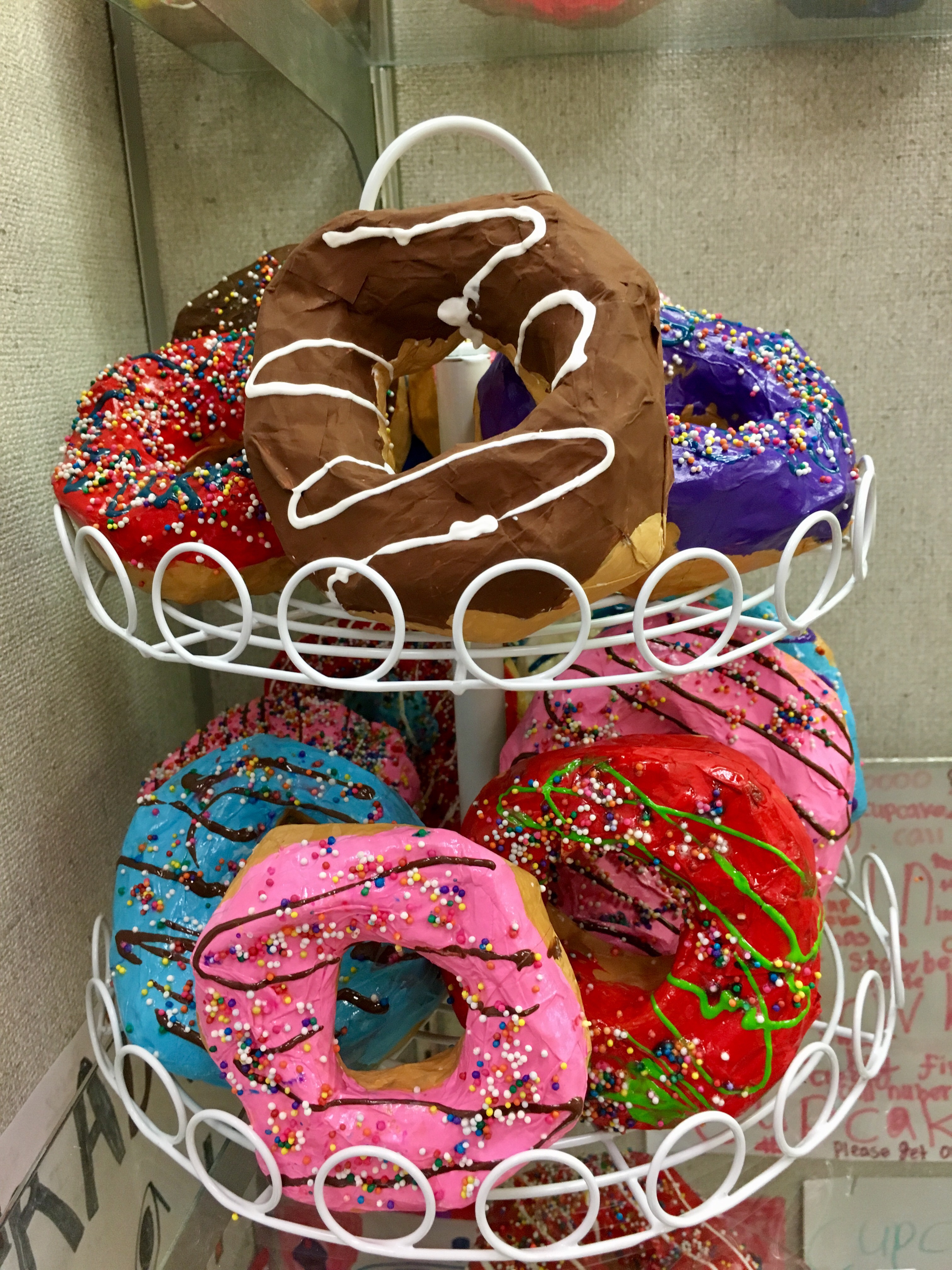 Finished paper maché donuts!I divided up some dollar store foil cookie sheets into either 6 or 9 squares with masking tape that we labeled with each artist’s name and art address. We just put them back into their own spots throughout all the steps until we finished the whole donut-creating process. I then wrote their names and art addresses on their donuts with a Sharpie and displayed them proudly in our glass case. They stopped traffic in the hall and were a big hit! We got so much positive feedback from teachers, administration, parents, and all the other grades. We’ll be doing this every year. 🍩🍩🍩