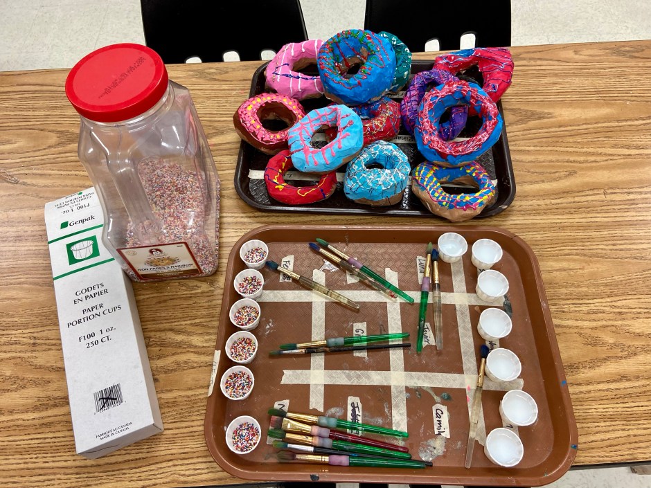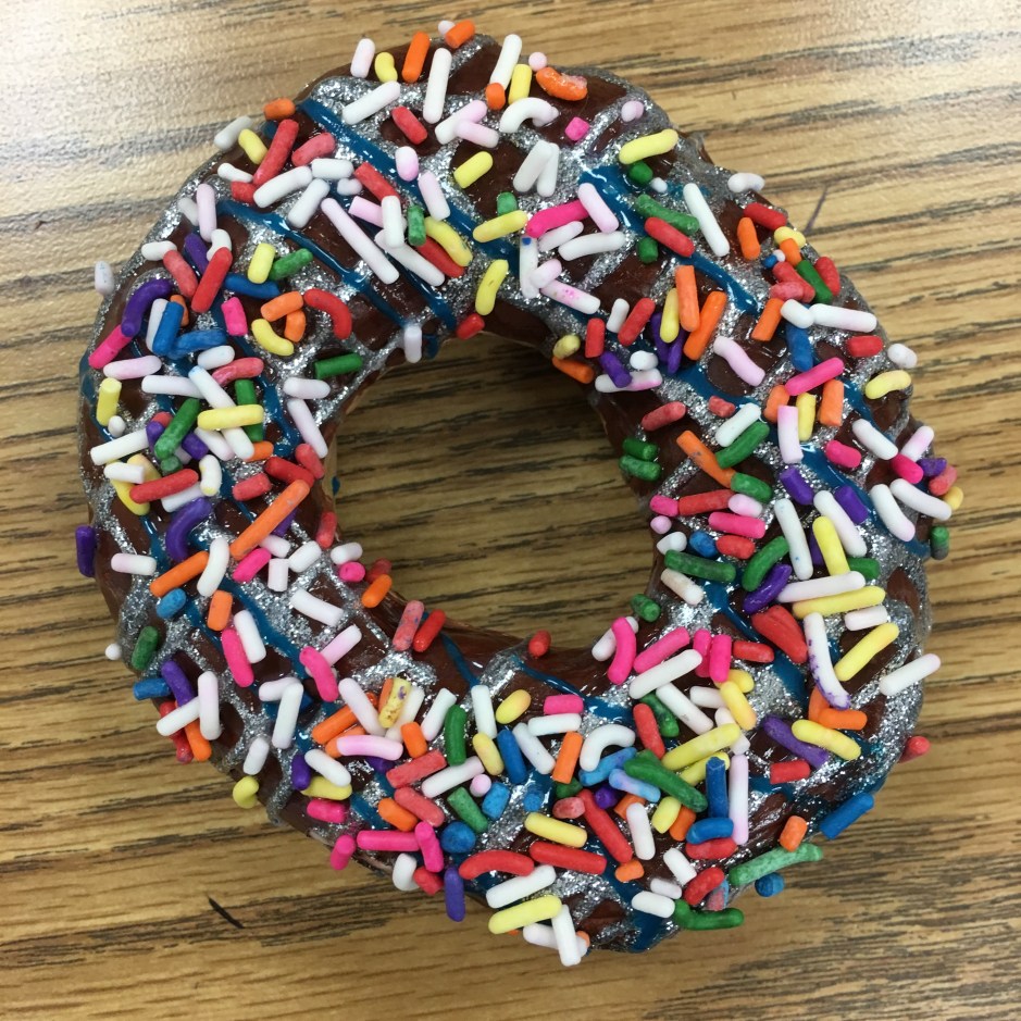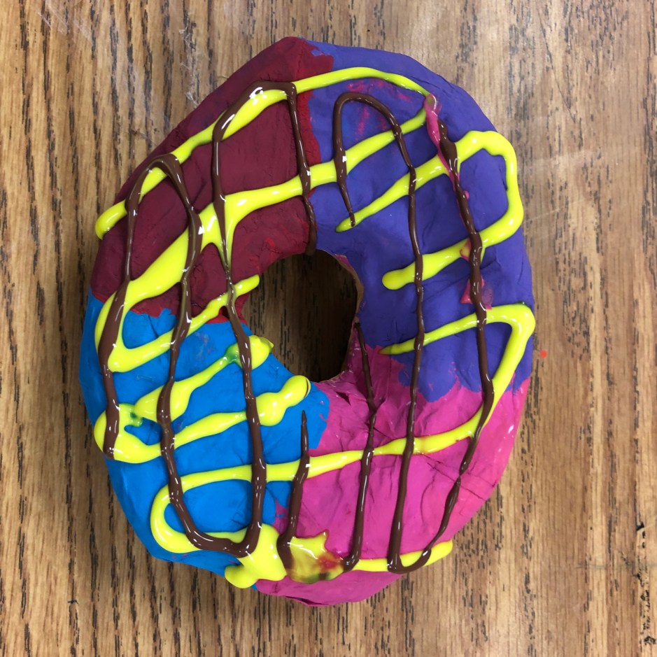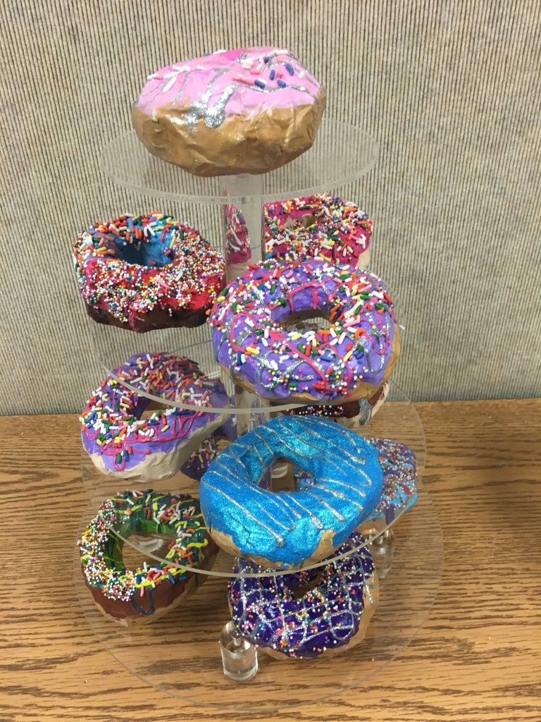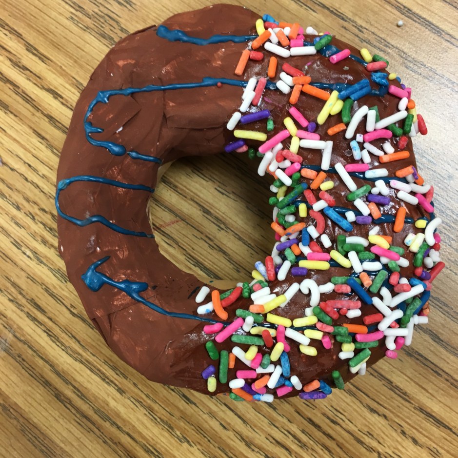Class period 6: (the last day) – We painted clear shiny fence stain protector (polyurethane) on our painted donuts. I demonstrated how to paint a rainbow-type stroke that starts inside the donut, curves across the top of the donut, then ends where the bottom of the donut begins. We talked about NOT painting the bottom of the donut since it would stick to our trays. Then we sprinkled just a very light dusting of sprinkles on our wet shiny clear coated donuts.