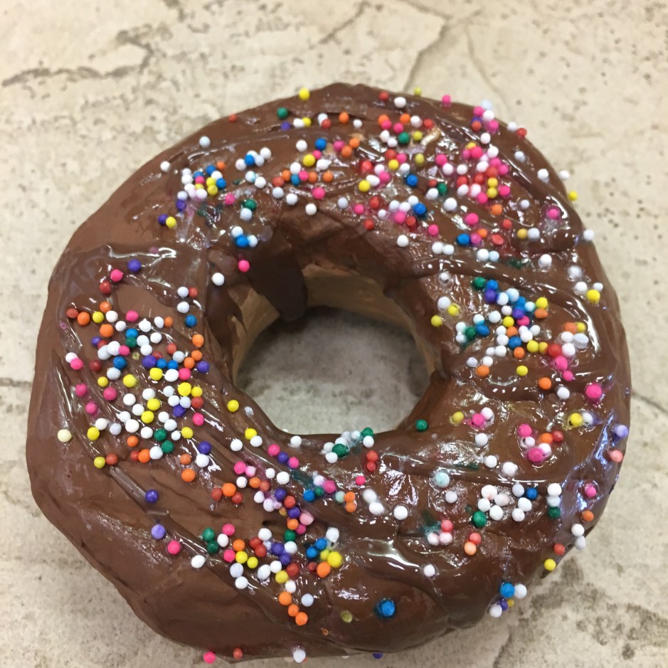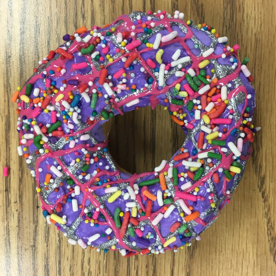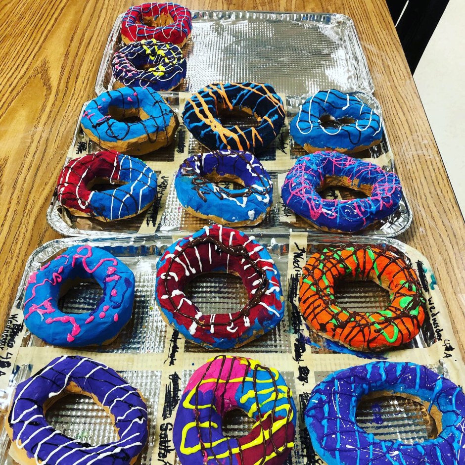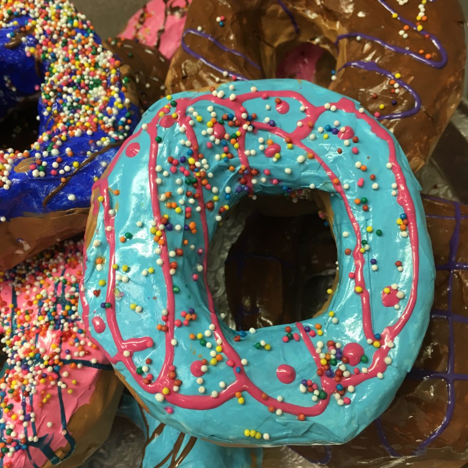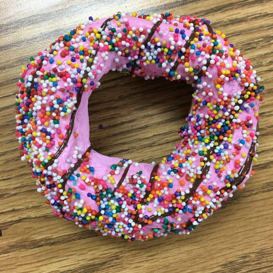 Class period 6: (the last day) – We painted clear shiny fence stain protector (polyurethane) on our painted donuts. I demonstrated how to paint a rainbow-type stroke that starts inside the donut, curves across the top of the donut, then ends where the bottom of the donut begins. We talked about NOT painting the bottom of the donut since it would stick to our trays. Then we sprinkled just a very light dusting of sprinkles on our wet shiny clear coated donuts.