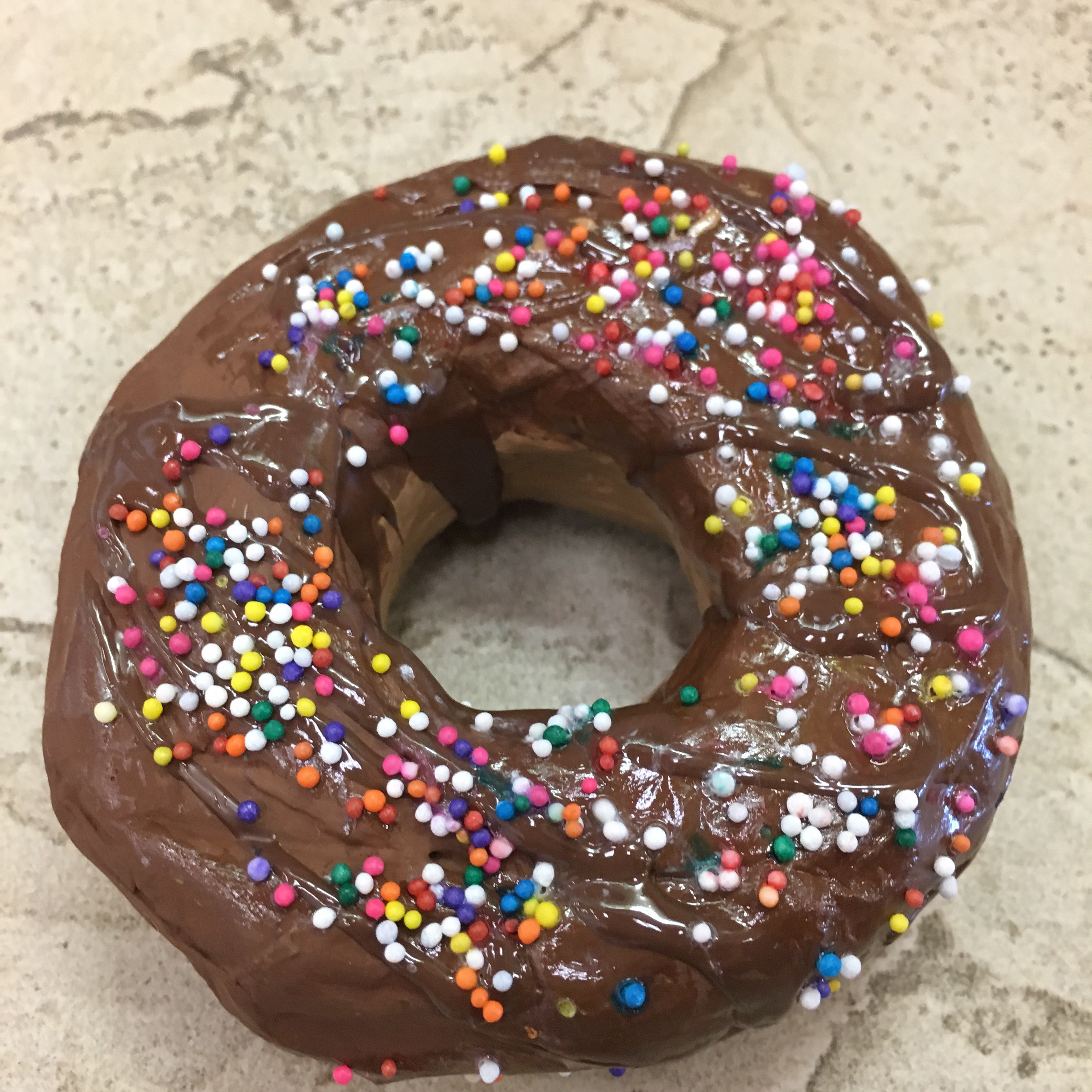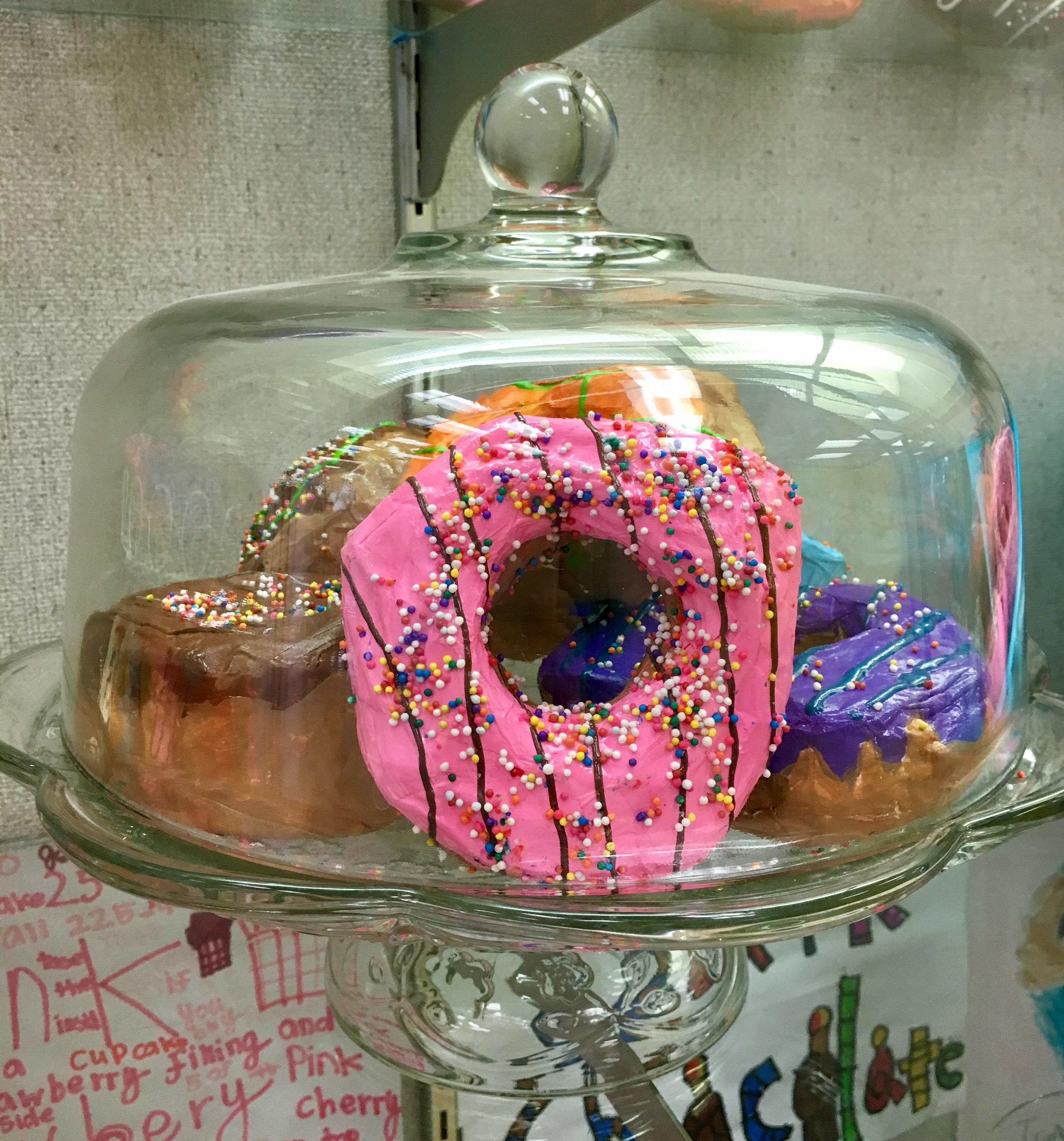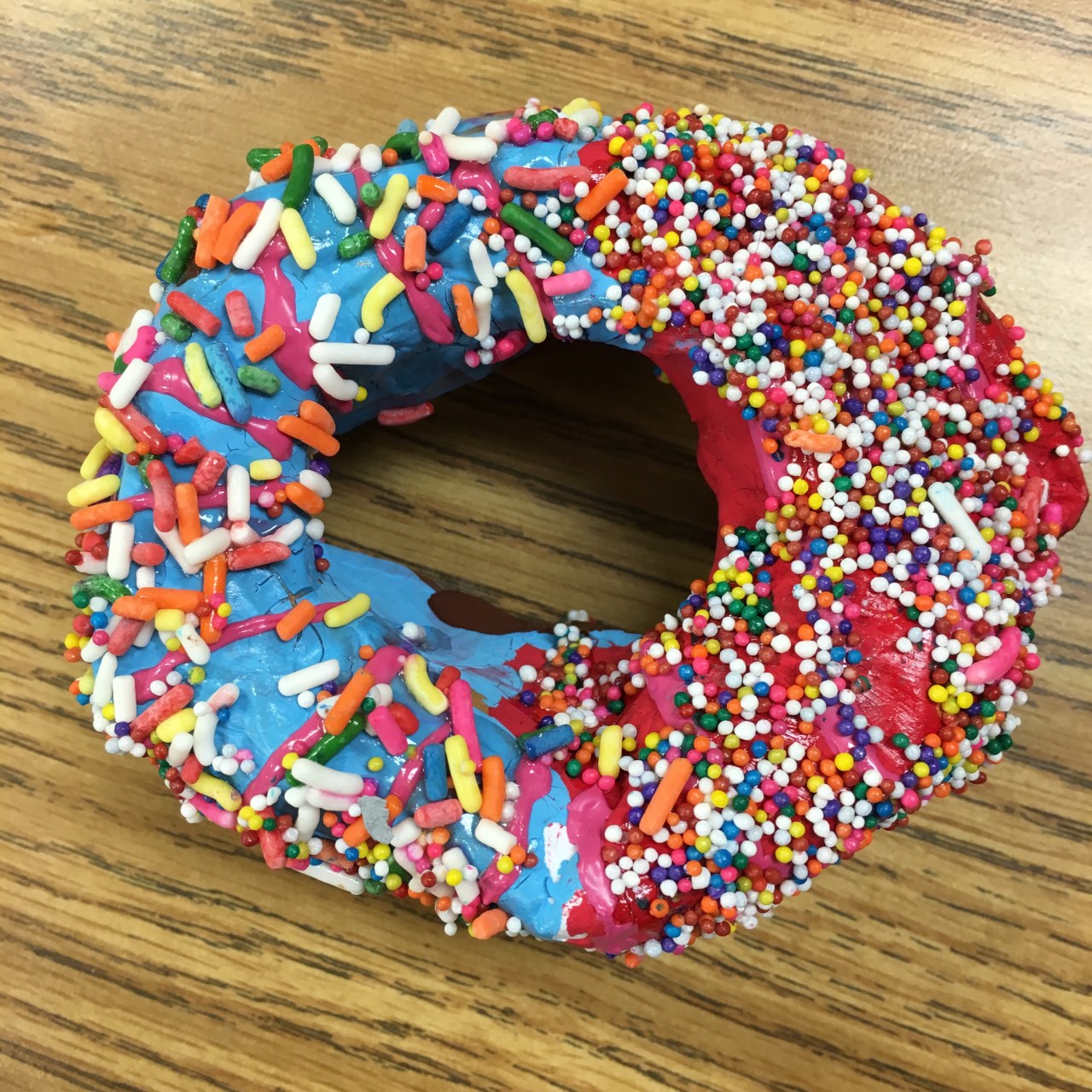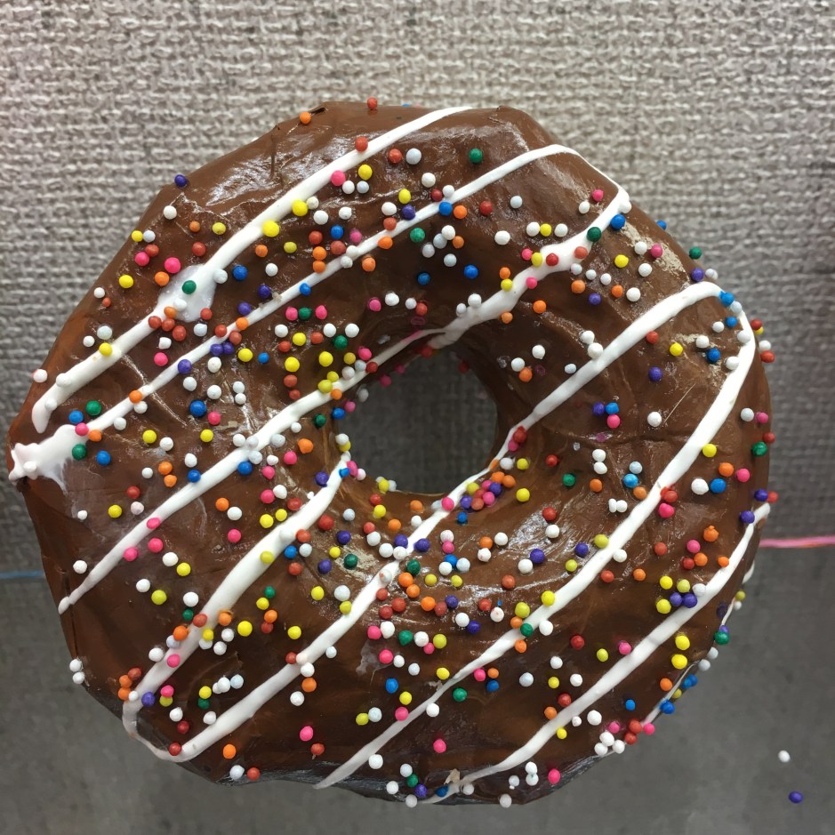 Class period 6: (the last day) – We painted clear shiny fence stain protector (polyurethane) on our painted donuts. I demonstrated how to paint a rainbow-type stroke that starts inside the donut, curves across the top of the donut, then ends where the bottom of the donut begins. We talked about NOT painting the bottom of the donut since it would stick to our trays. Then we sprinkled just a very light dusting of sprinkles on our wet shiny clear coated donuts.
