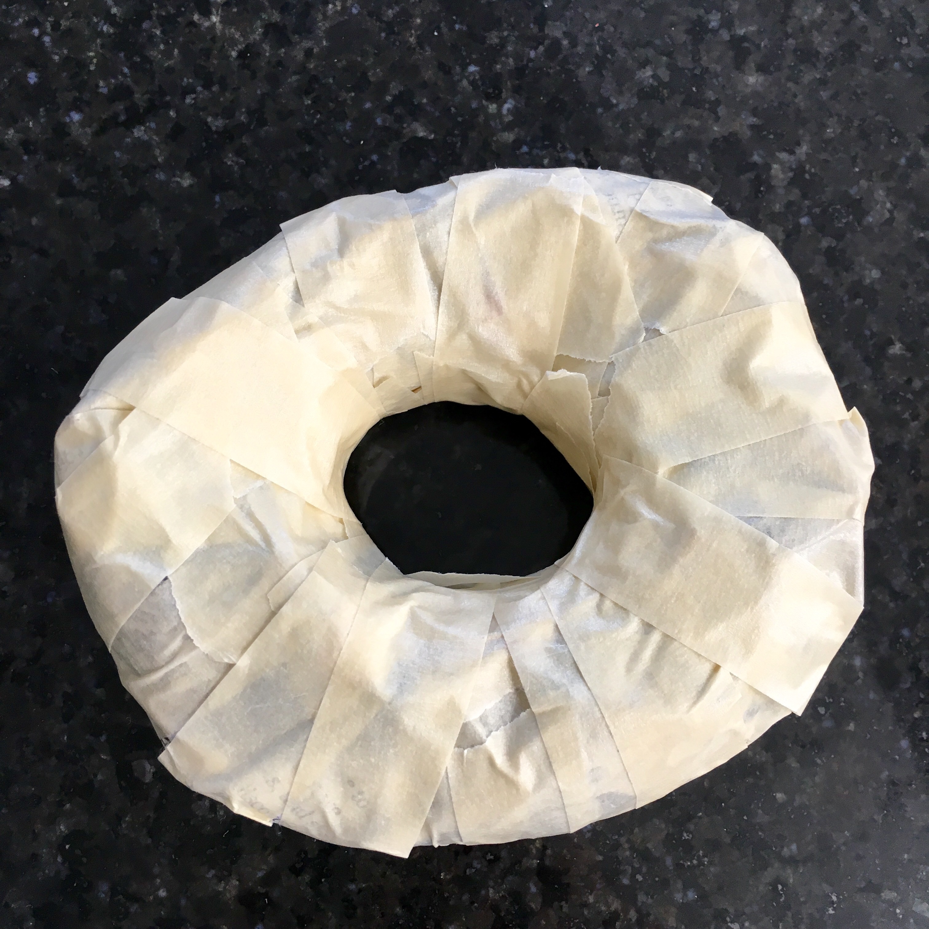The newspaper part of paper maché donuts before they’re completely covered with masking tapeThen we taped our entire rolled, twisted cylinders into a donut shape with a couple of layers of masking tape.