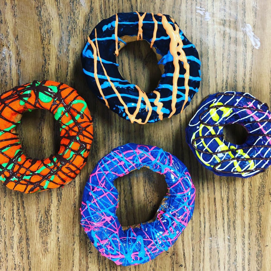 Class period 5: I demo’ed how to apply the puffy paint drizzle in a smooth narrow wavy line across the entire top surface of the painted donuts.