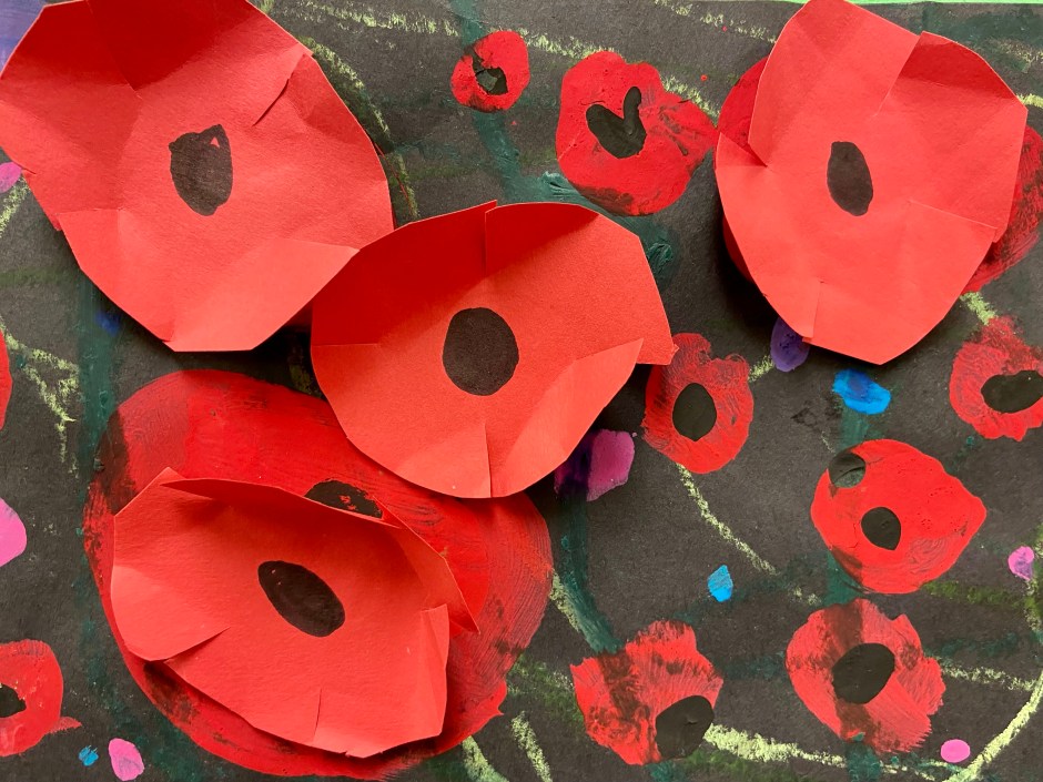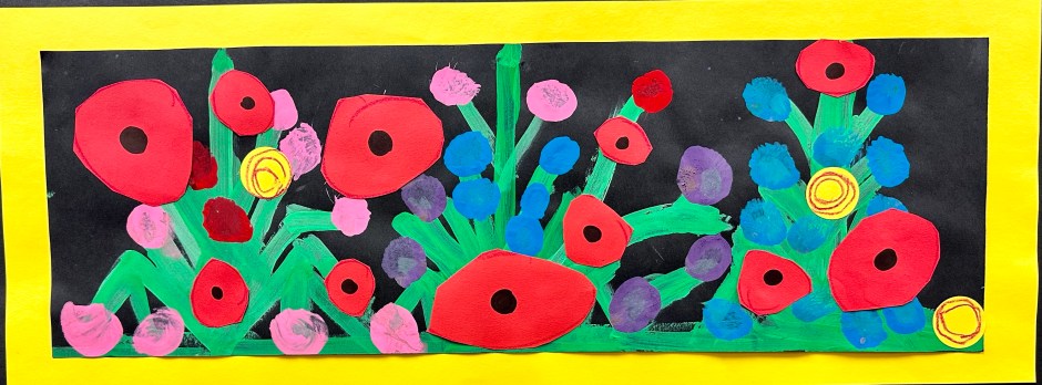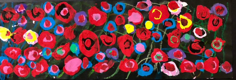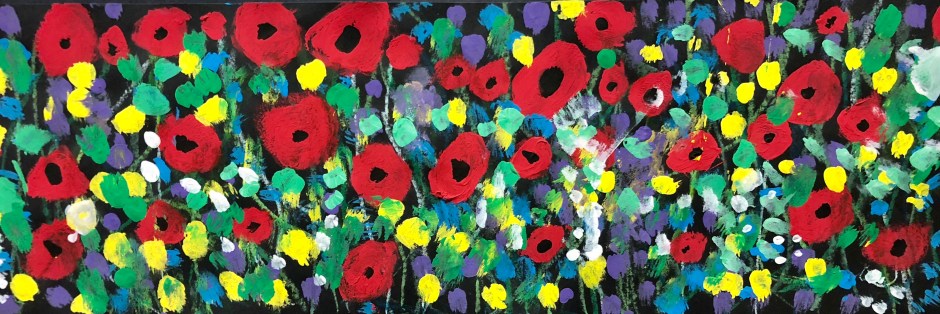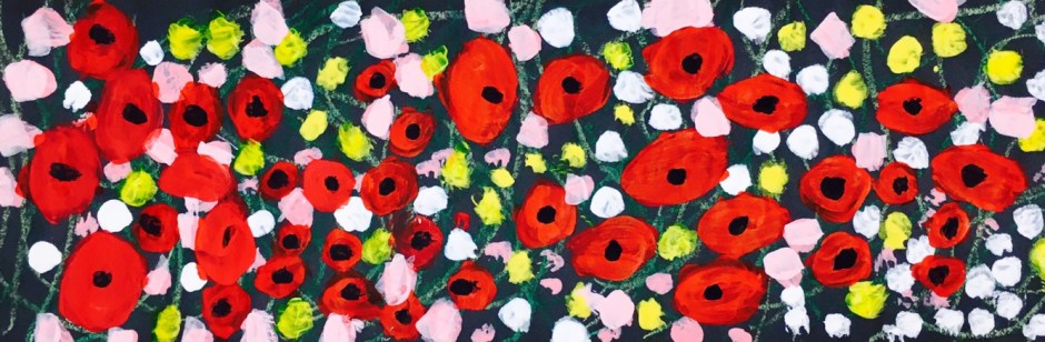 Once they had their stems and grass drawn out, paint the large and medium red circles on the paper. Then paint the wildflowers around the poppies. Add black circles to the middle of your poppies and you’re done!