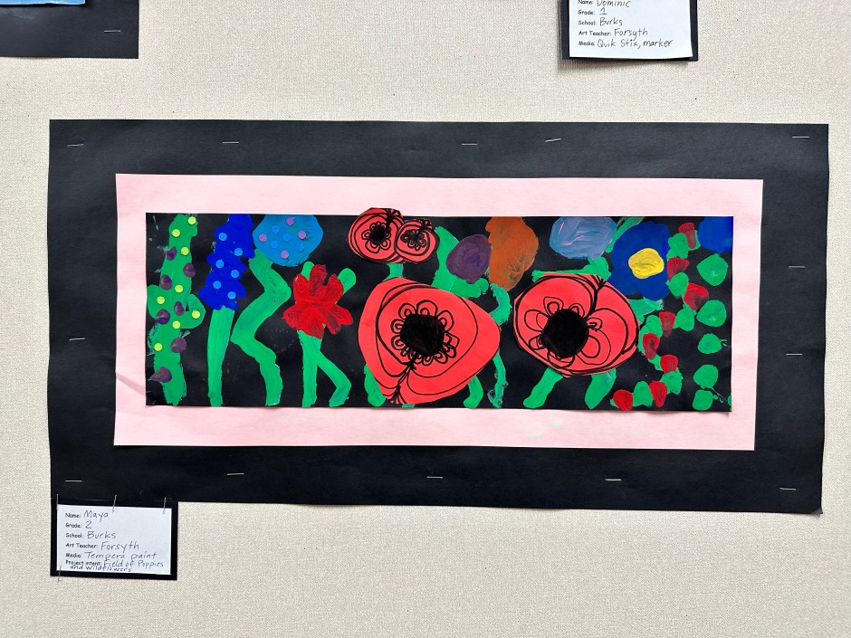 A student asked me why we didn’t paint on white paper instead of black paper. I thought about that and realized that would have been even better. The challenge when painting on black paper is that the red needs to be painted twice to get the brightest red. So next year we’re going to paint either a blue sky or a sunset sky before we do the rest.