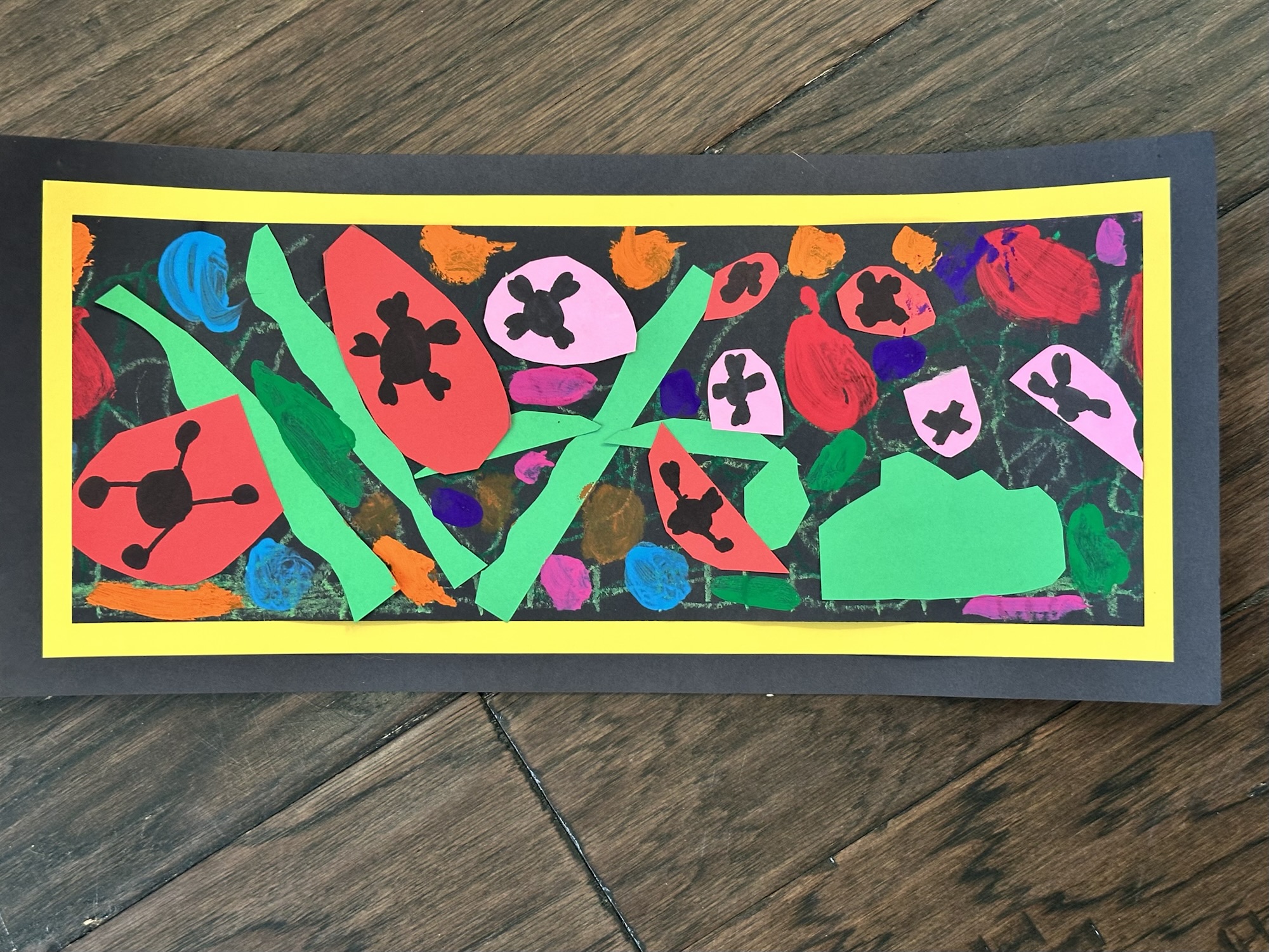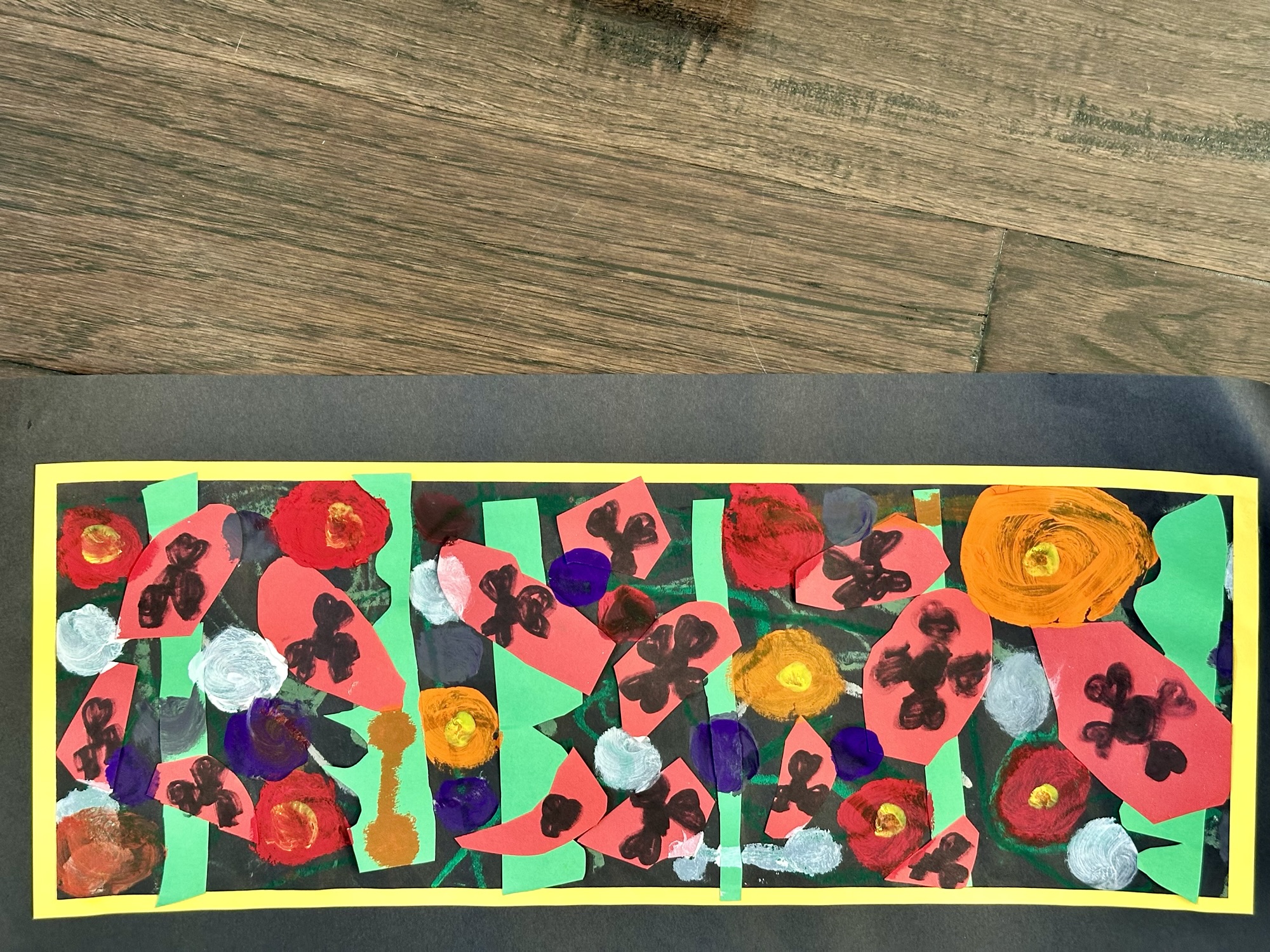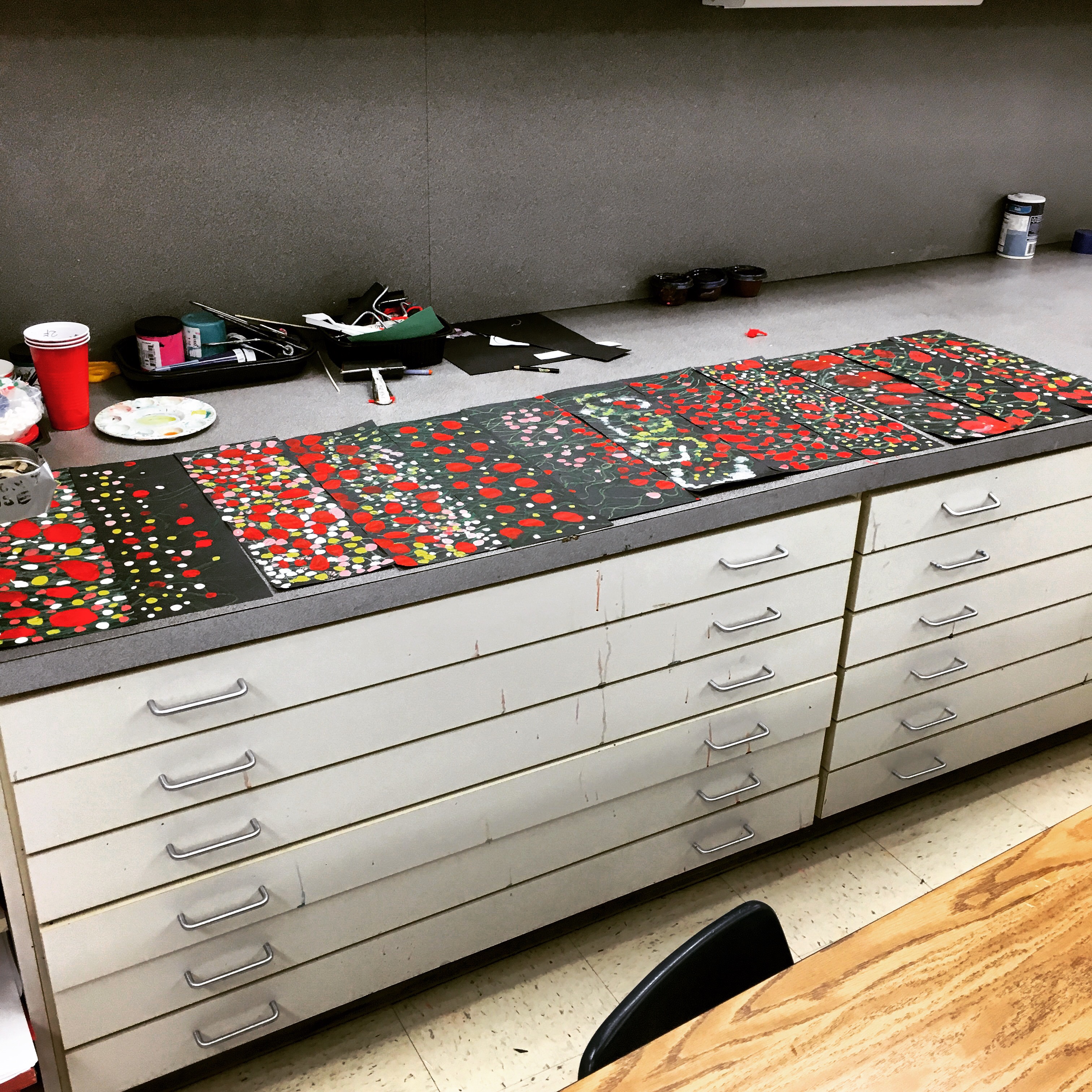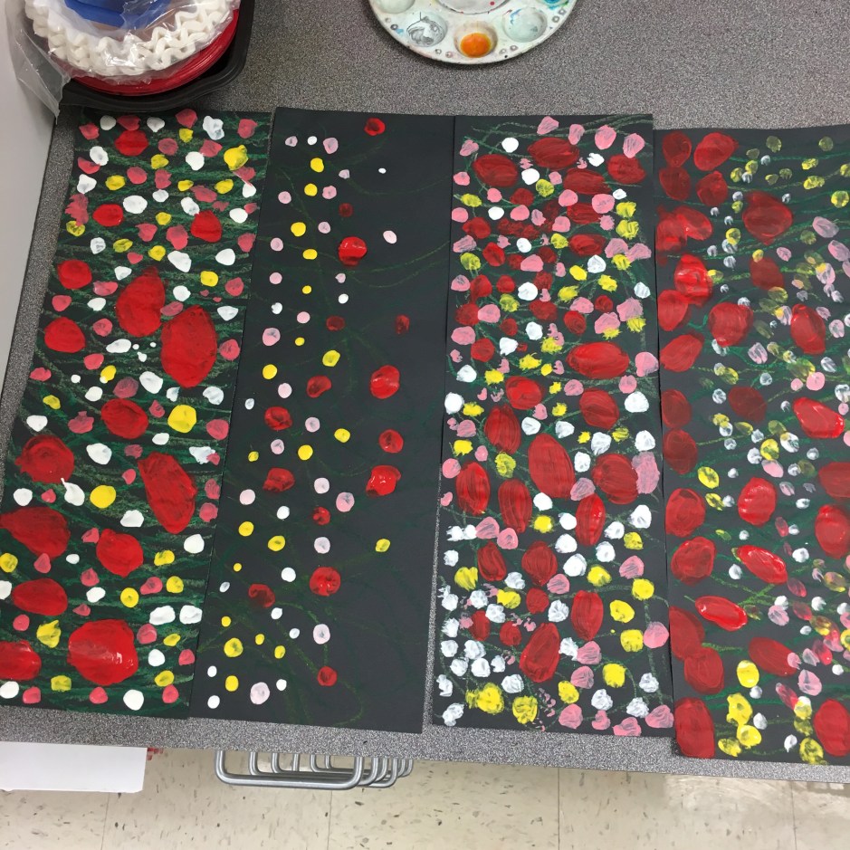 A student asked me why we didn’t paint on white paper instead of black paper. I thought about that and realized that would have been even better. The challenge when painting on black paper is that the red needs to be painted twice to get the brightest red. So next year we’re going to paint either a blue sky or a sunset sky before we do the rest.