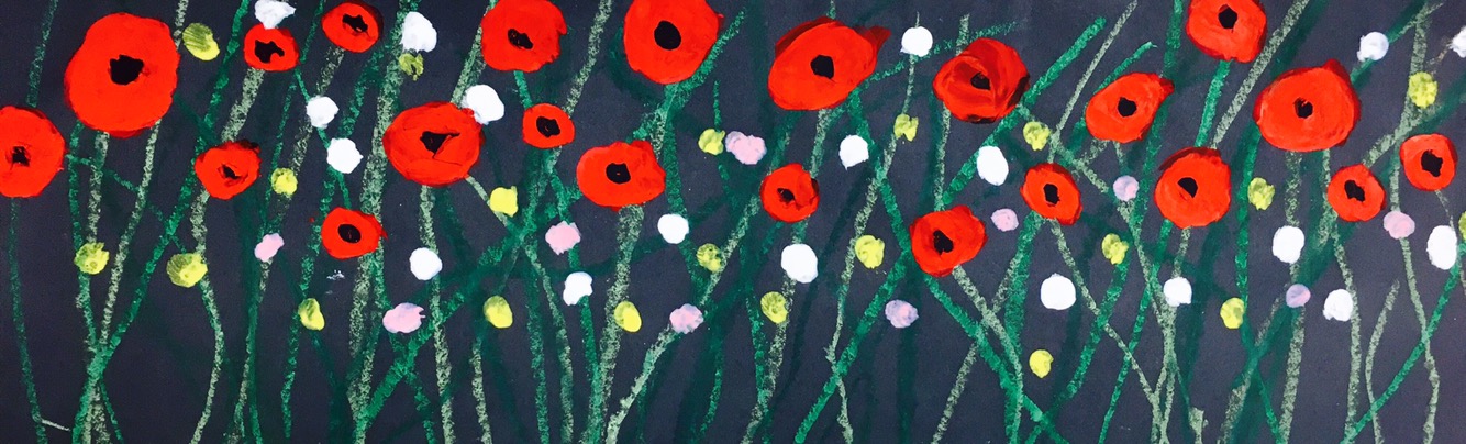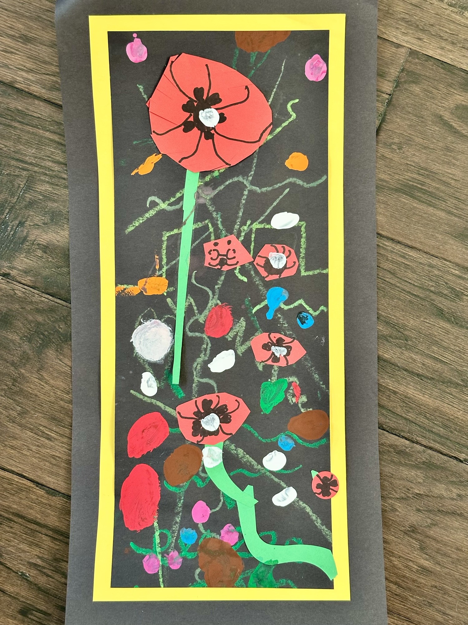 Once they had their stems and grass drawn out, paint the large and medium red circles on the paper. Then paint the wildflowers around the poppies. Add black circles to the middle of your poppies and you’re done!