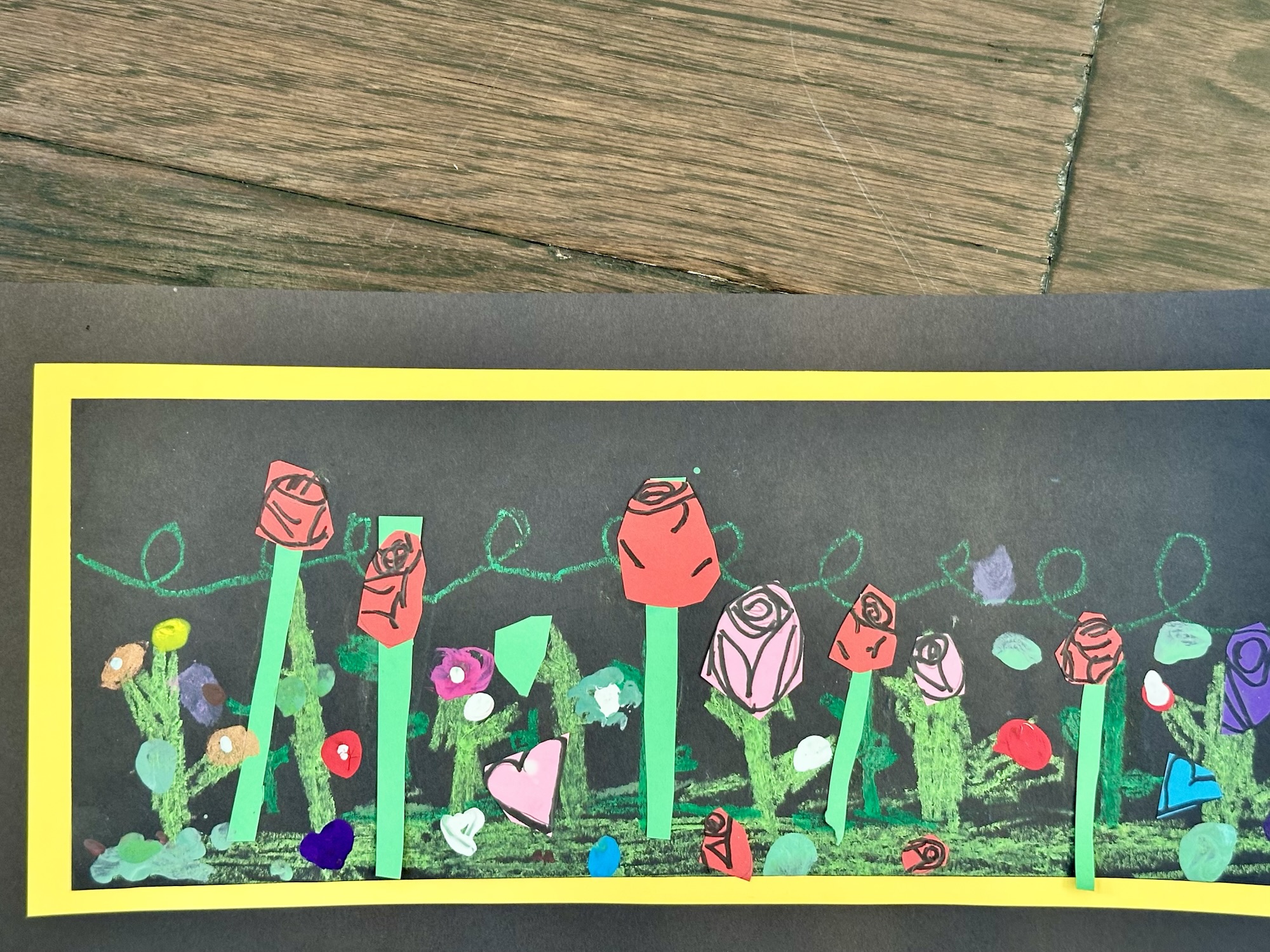 We cut out 12″ x 18″ paper in half to make a skinnier composition at 6″ x 18″. The students used 3 different shades of green oil pastels to draw their stems and grass. Stress to them to start at the bottom of the paper and draw up.