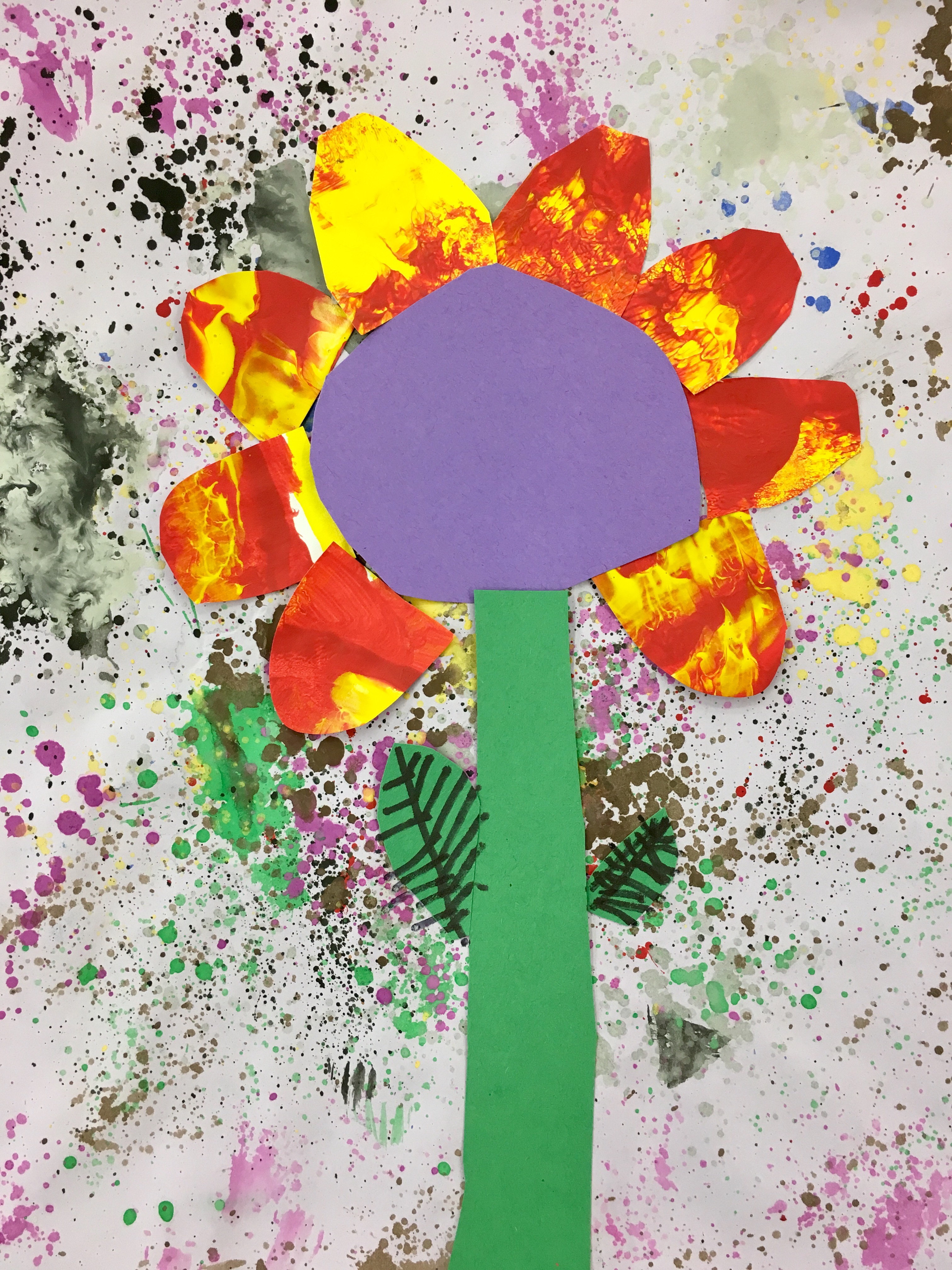 After it dried, I drew the petals on the back for them and showed them how to cut them out. I planned on using painted paper for the green stem and the flower centers, but we ran out of time at the end of the year. We substituted construction paper and it worked fine and saved time.