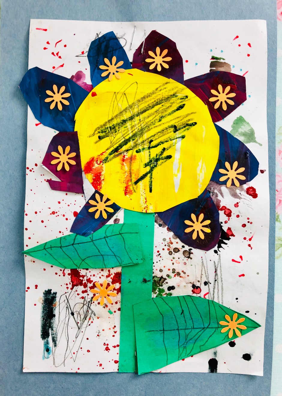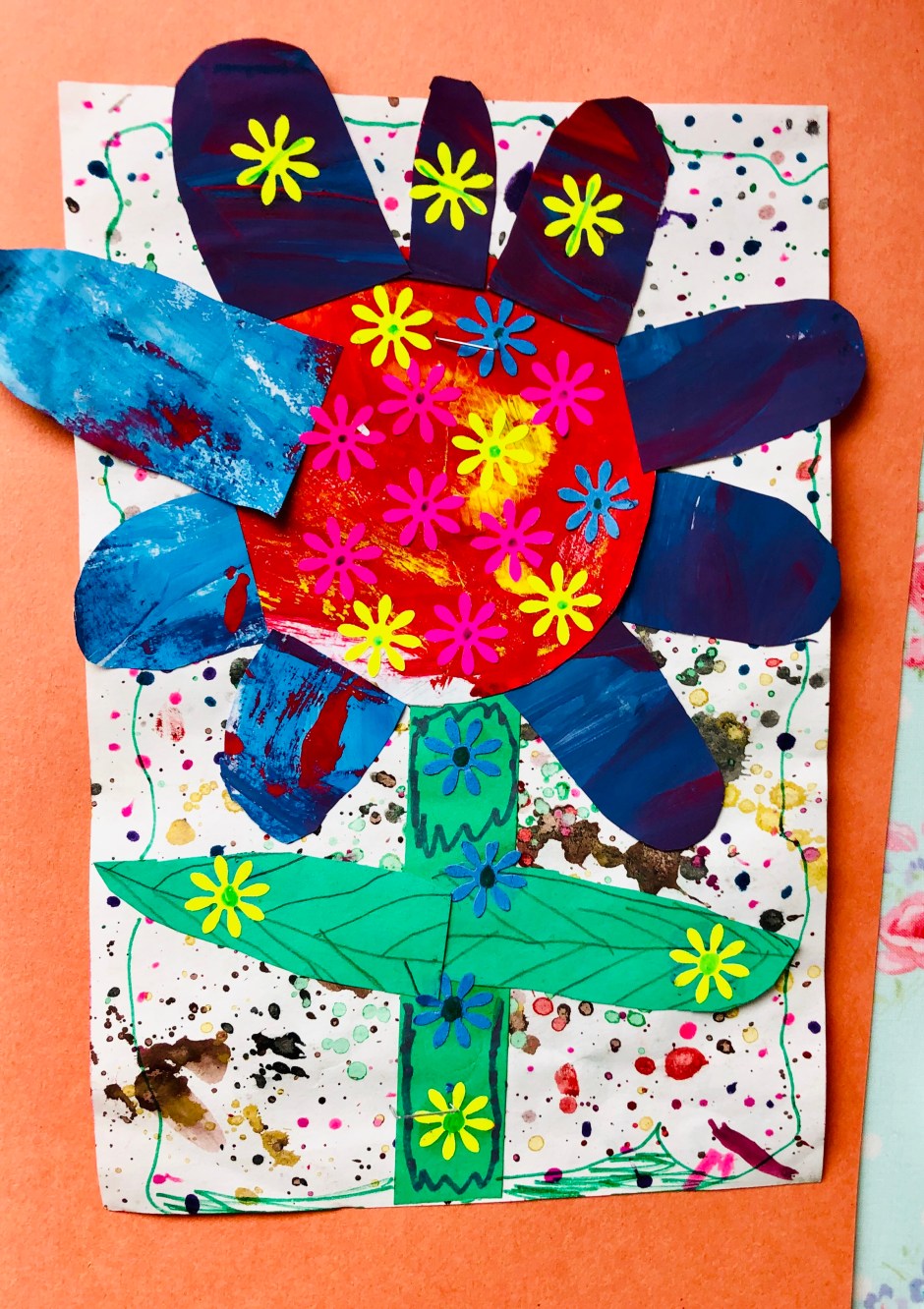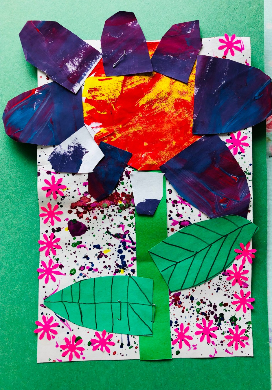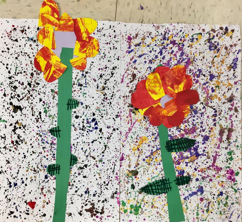 They were proud of their flowers! It took only about 3 weeks start to finish. I’m glad I was asked to give this a try because that was the nudge I needed to try acrylic painted paper and splatter paint with kindergartners. Next year, early finishers will add some sort of collaged border.
