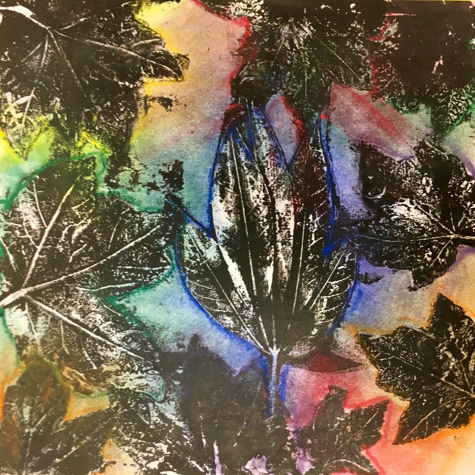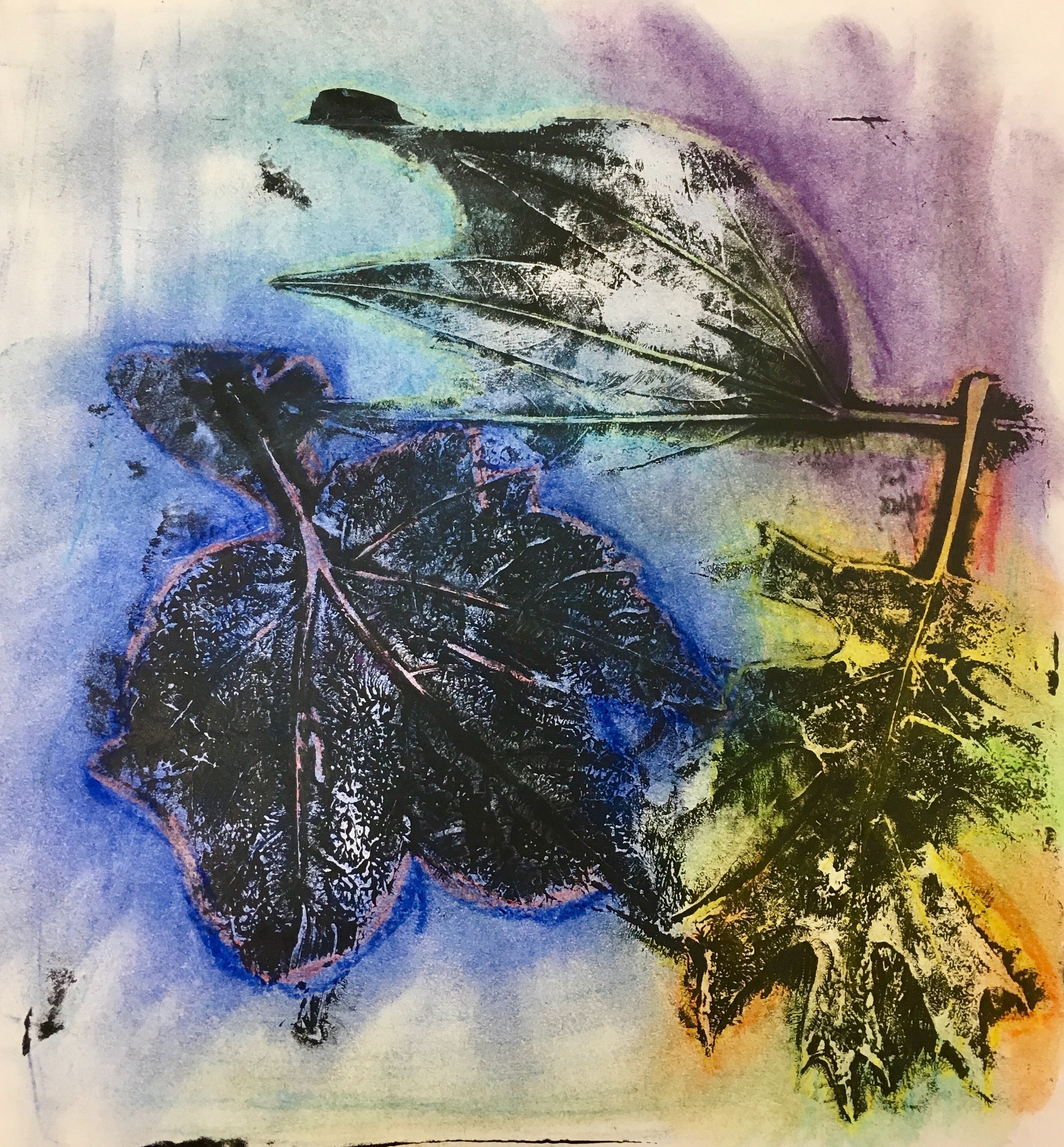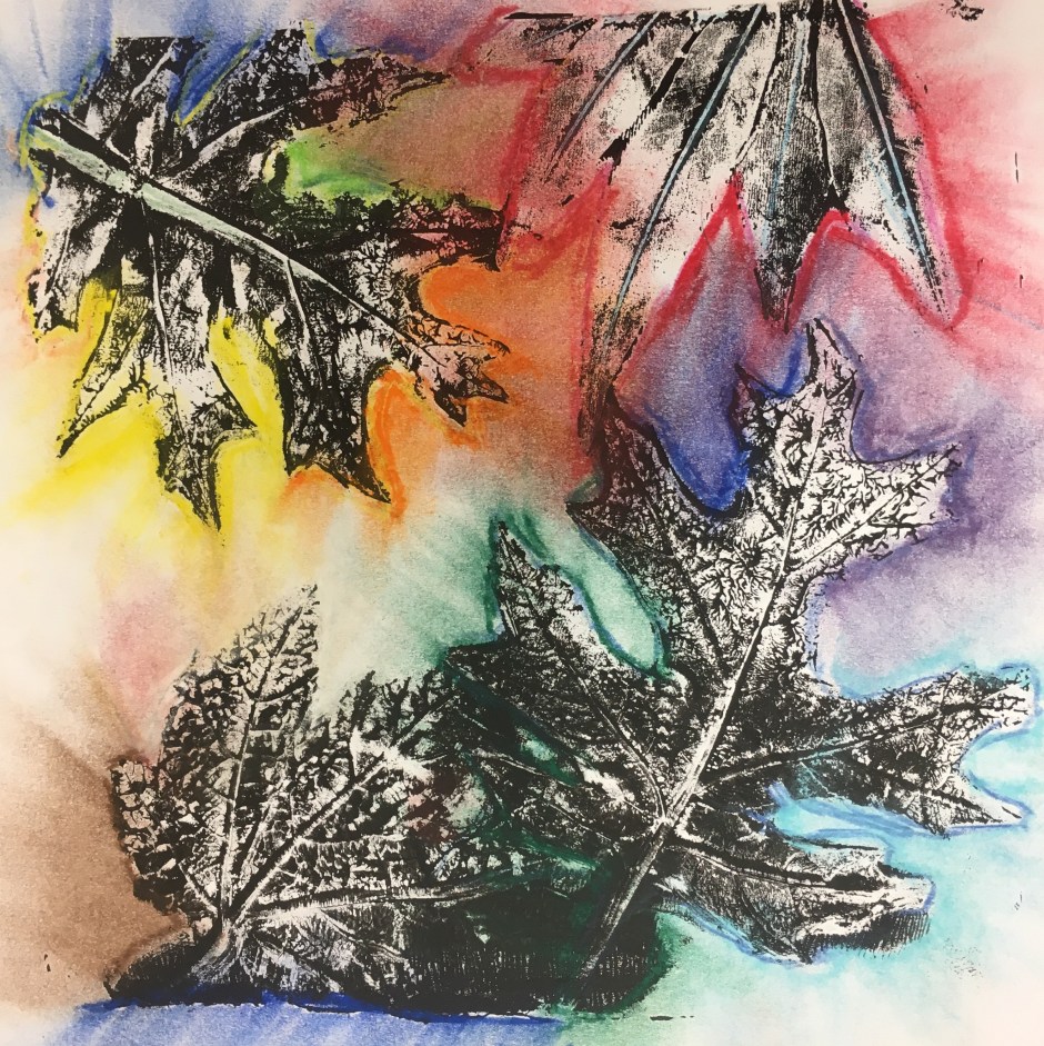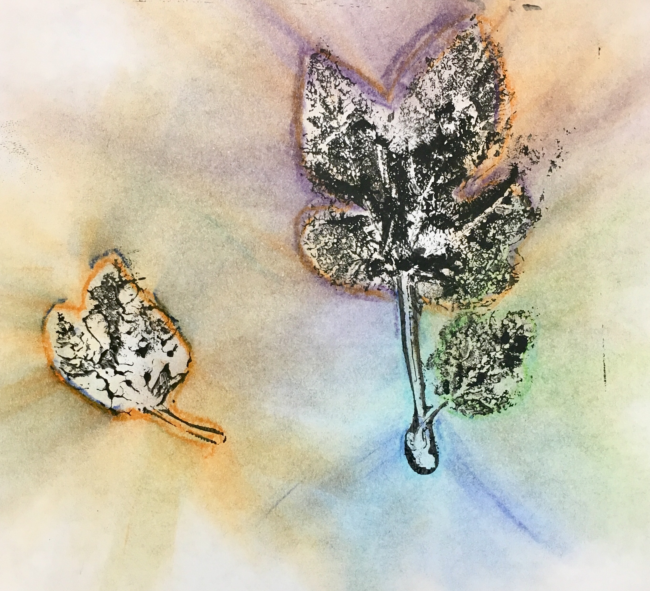 I demo’ed how much acrylic to squirt on your plate, how to create a composition with your leaves, how to press the paper down to create your print, and how to capture the ghost print after your first print.
