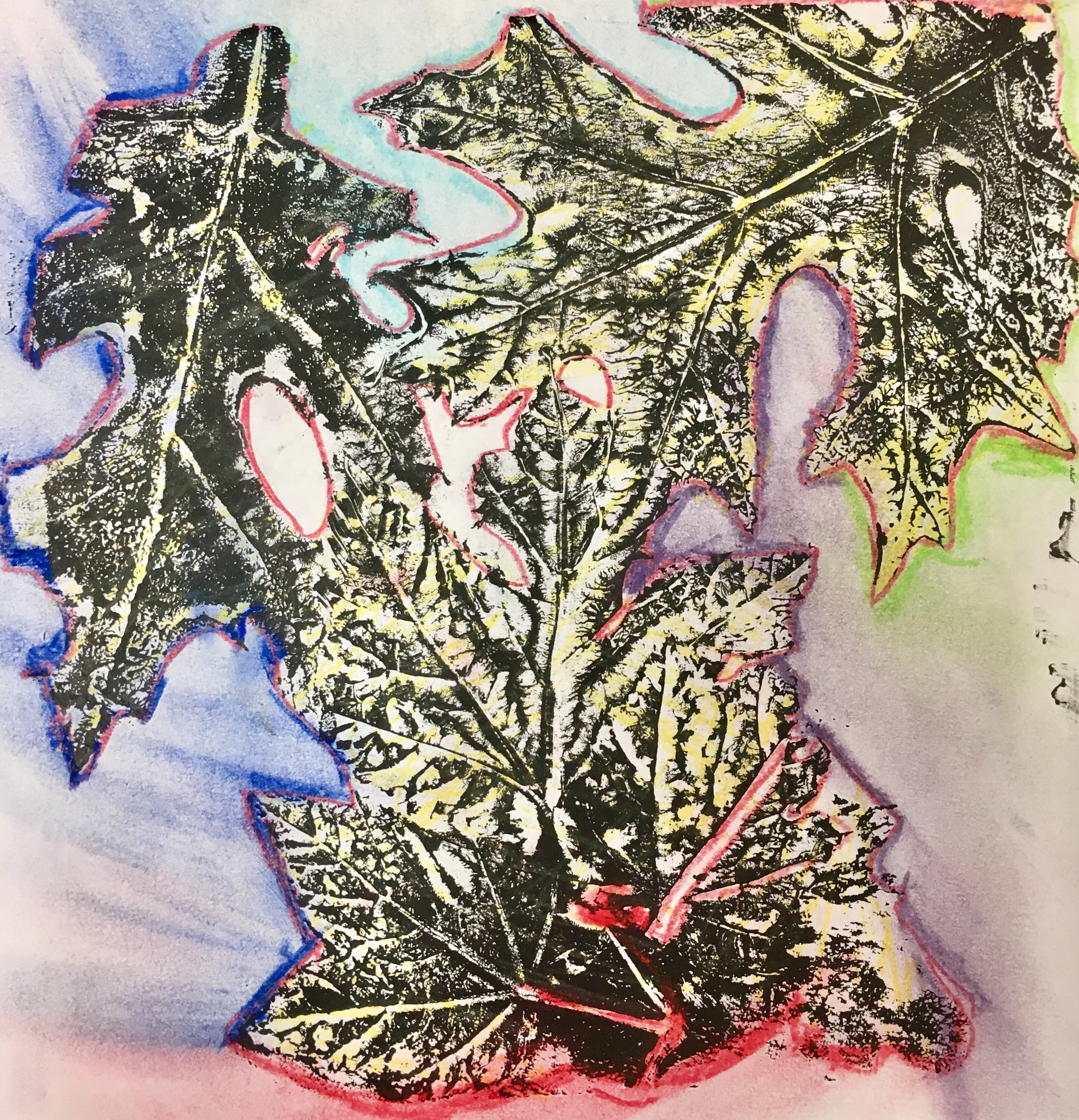 You can print with anything flat-ish. At home, I love layering stencils. I couldn’t figure out how the stencil washing would work with students and the small window of work time, so we went with printing local leaves.