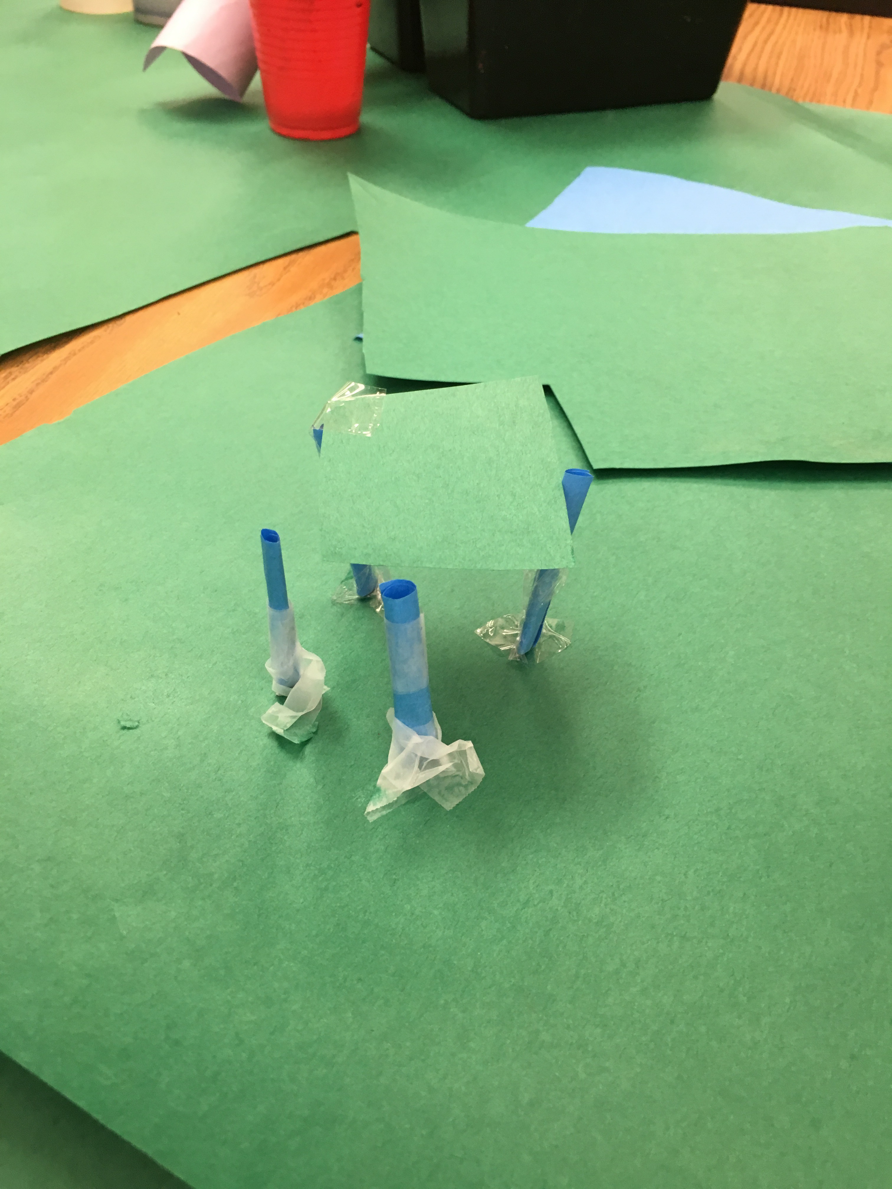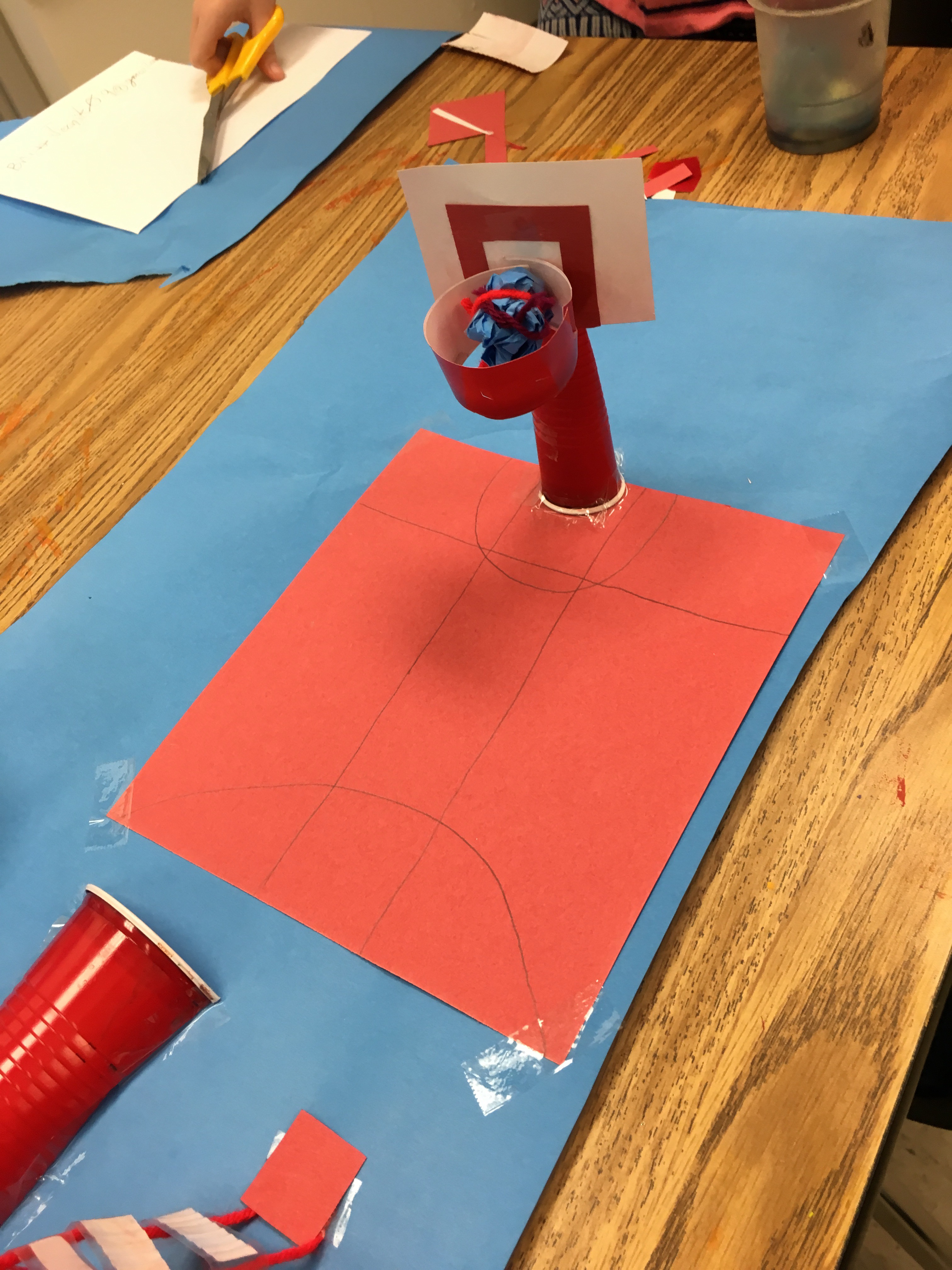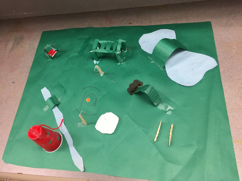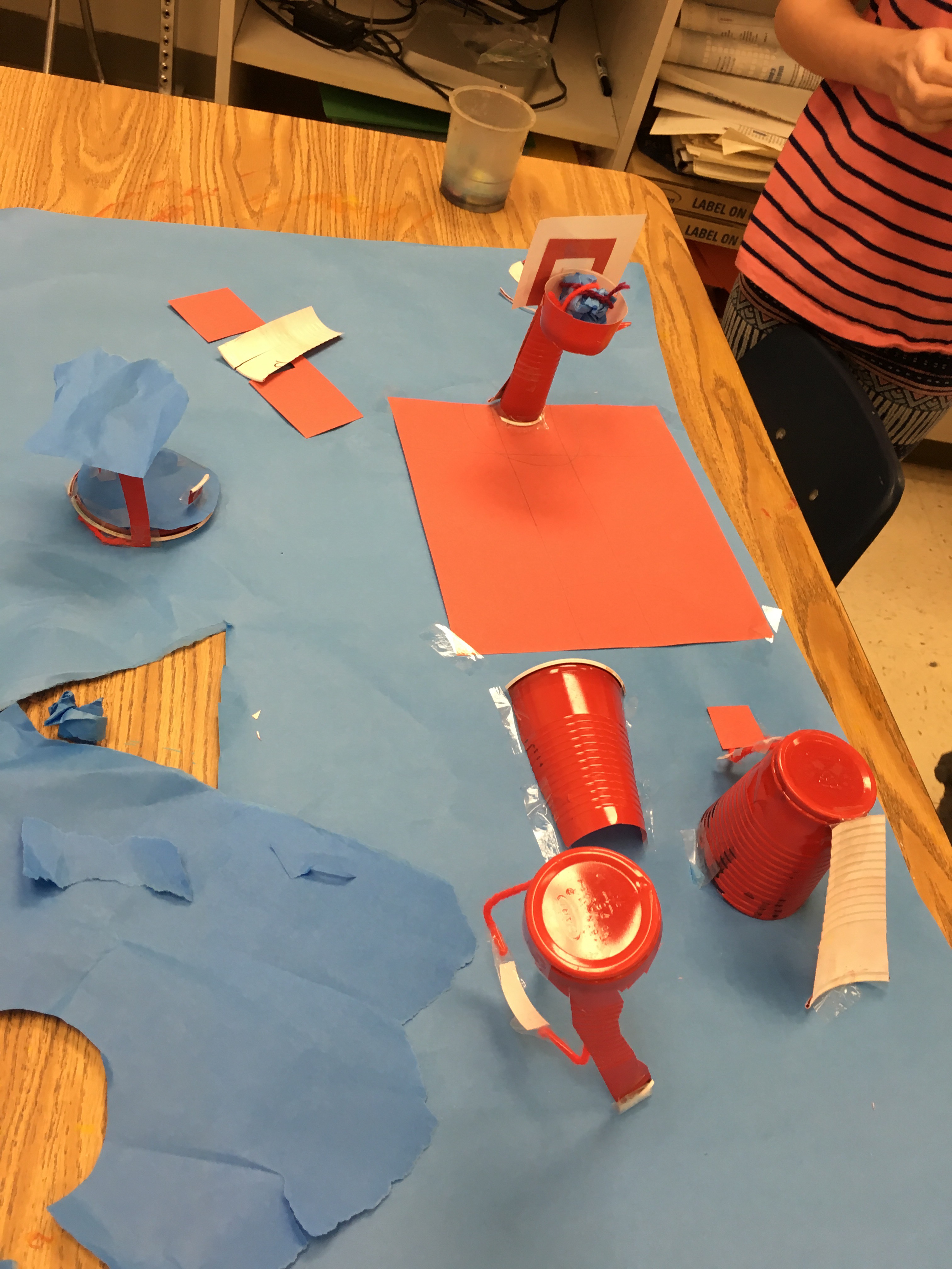 I tore off long sheets of bulletin board paper in every color and provided cups, tape, glue, yarn, and scissors. Each table worked as a team building their playgrounds.