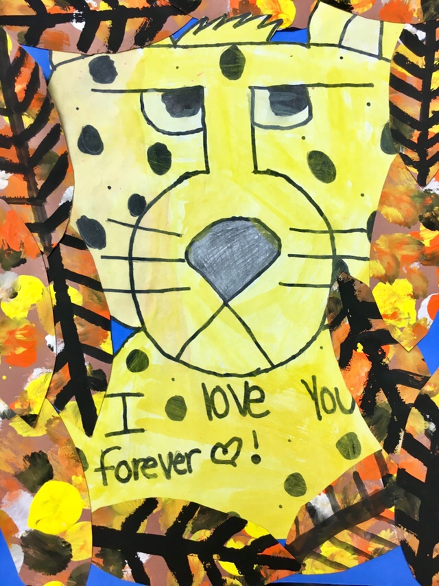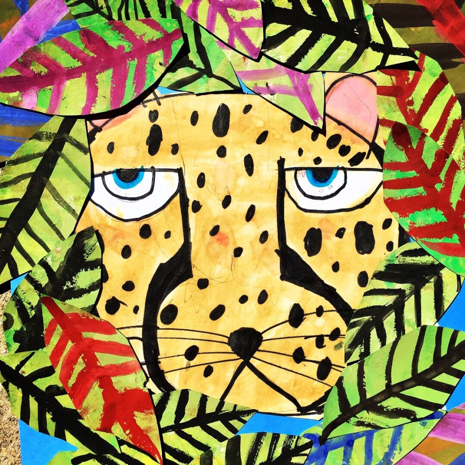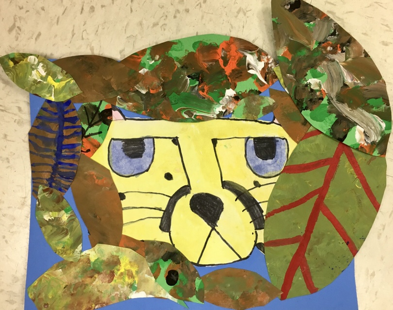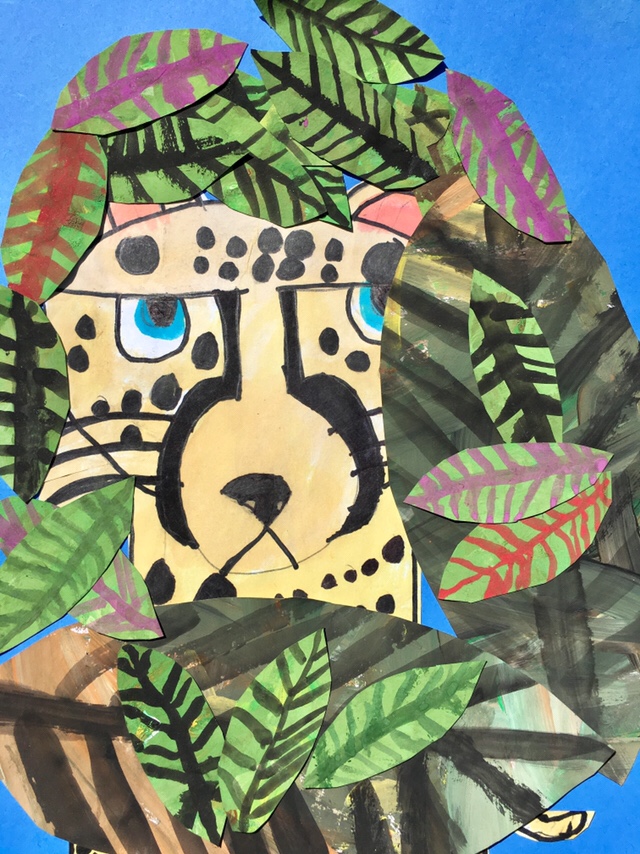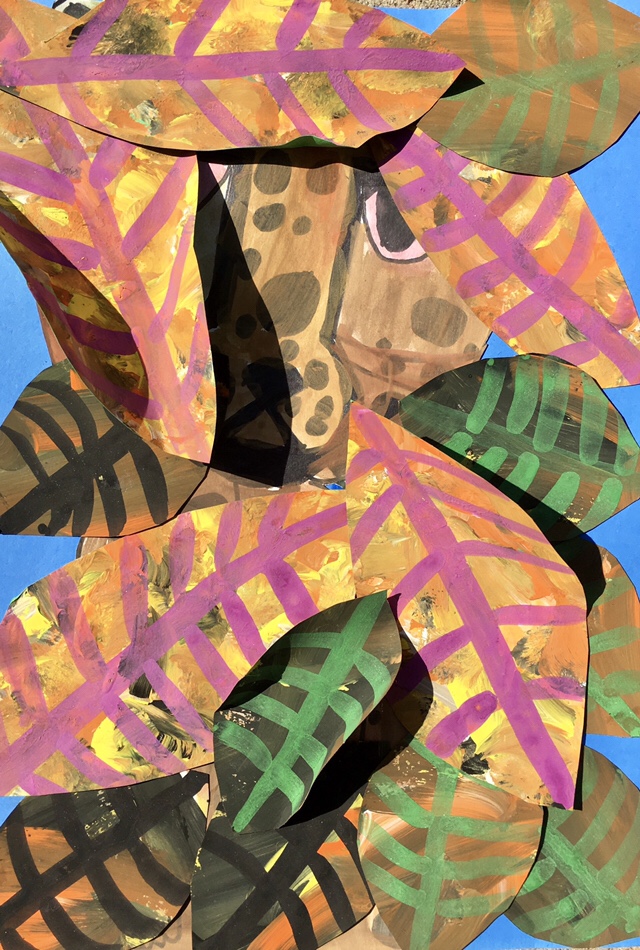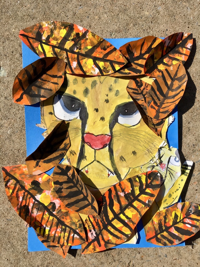 I knew drawing the cheetah would be challenging, so we first created our painted paper for the leaves. I demoed how to paint yellow, orange, black and white tempera together for our painted paper leaves.