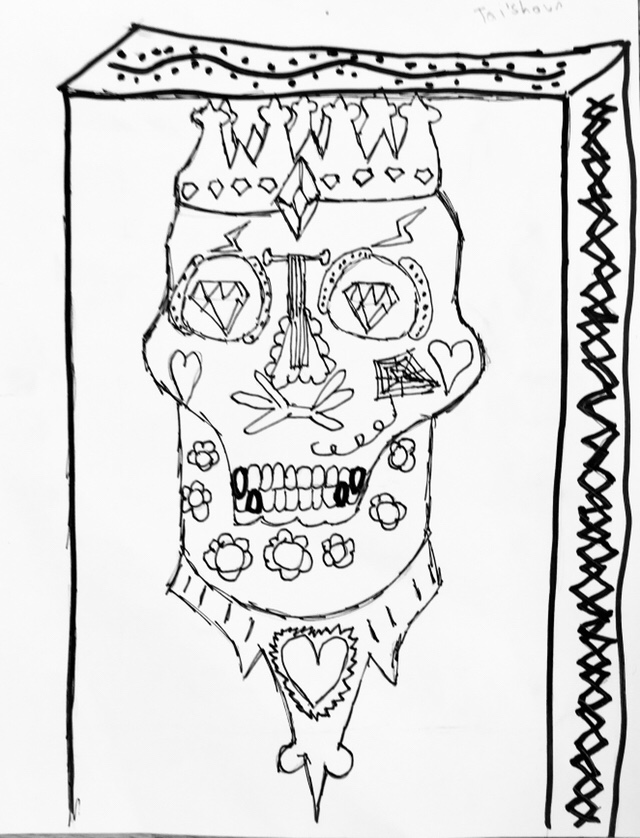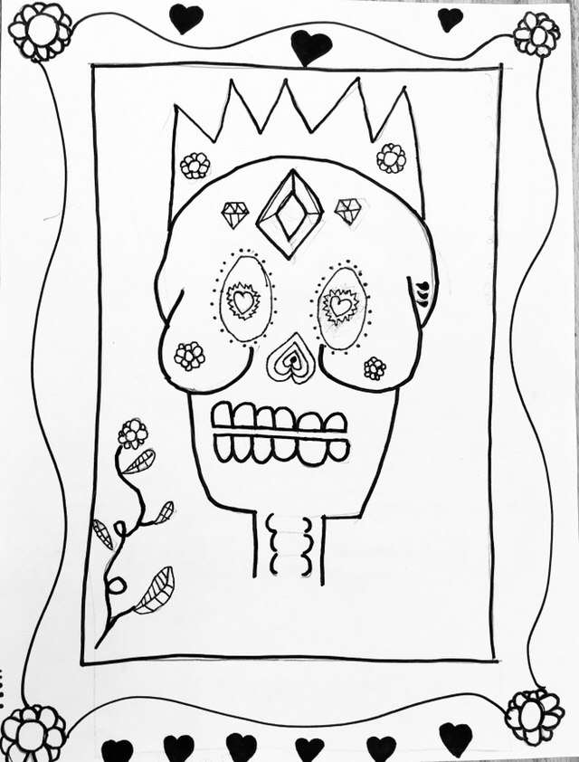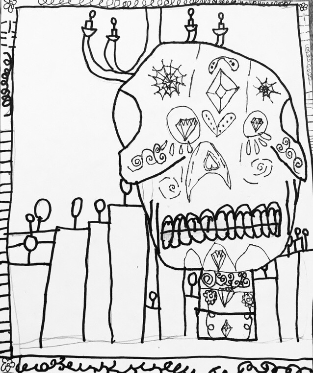 – drawing using any combination of commonly-used sugar skull designs or the artists’ own design creations to add personality to both the skull and their borders