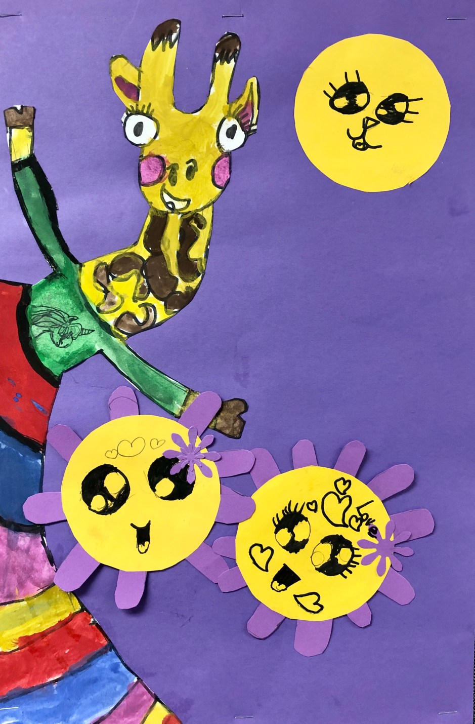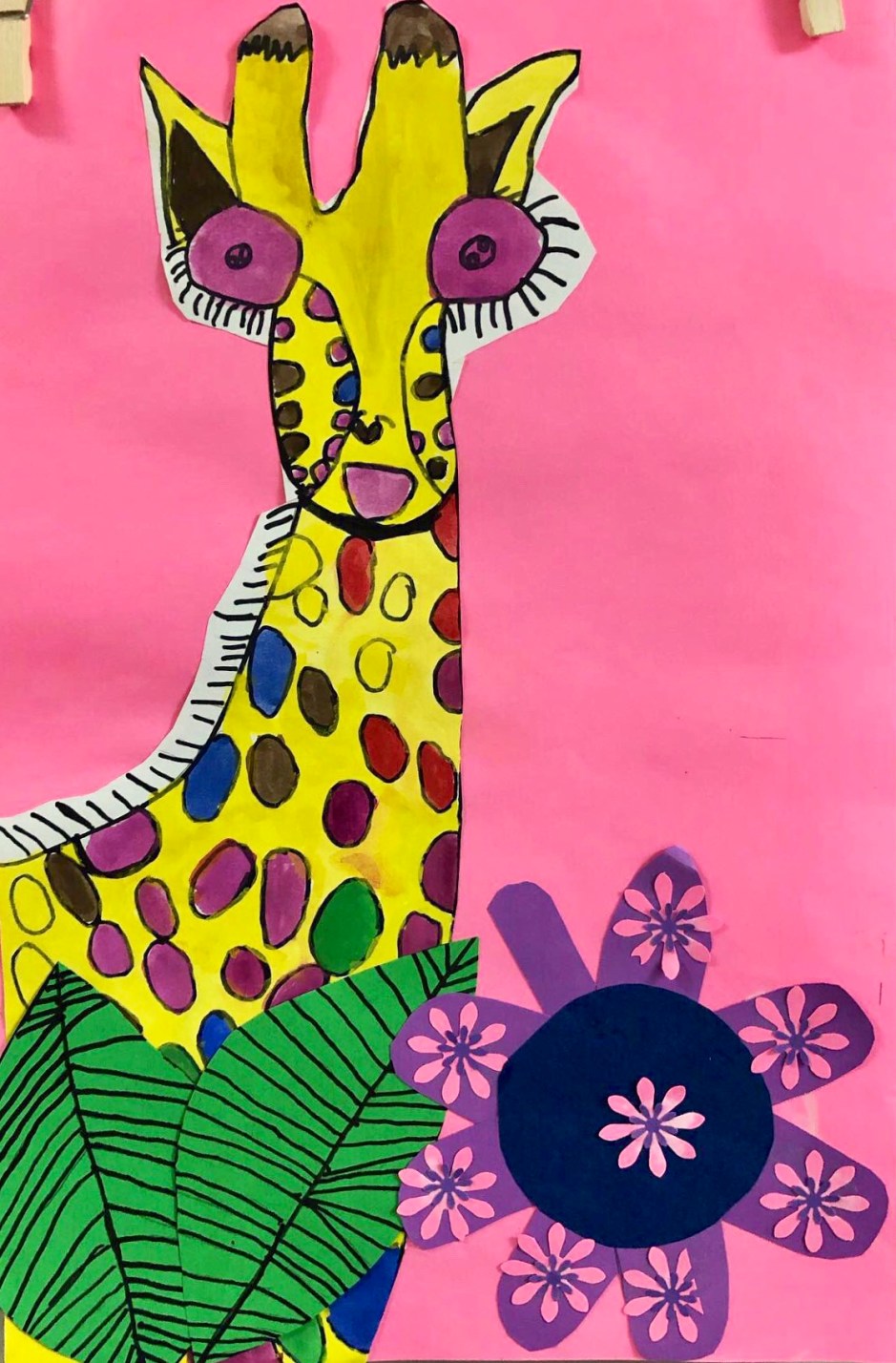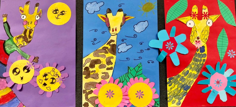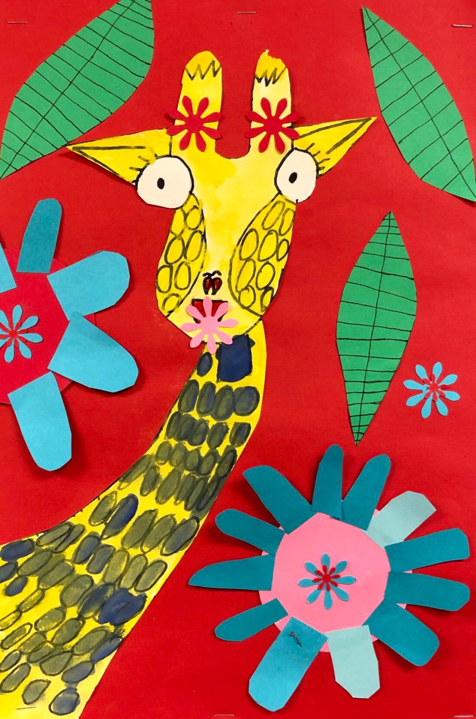 After completing our giraffe drawings in pencil, we then go over everything we drew in pencil with a Sharpie. After that, we erase any stray pencil marks that didn’t get covered by the Sharpie outlines. Then we paint with tempera paint, cut out our giraffe paintings, and glue onto a construction paper background. Our last step is to go over how to draw a leaf shape and how to draw the veins on construction paper leaves. They draw their own leaves, add vein details, cut them out, and glue them to the paper. Early finishers can add a flower or another collaged detail.