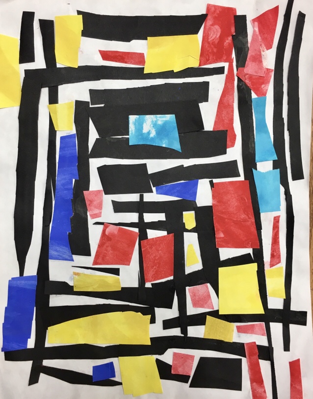 We cut out black strips and glued them horizontally and vertically on our papers, just like Mondrian painted his lines horizontally and vertically in Broadway Boogie Woogie.