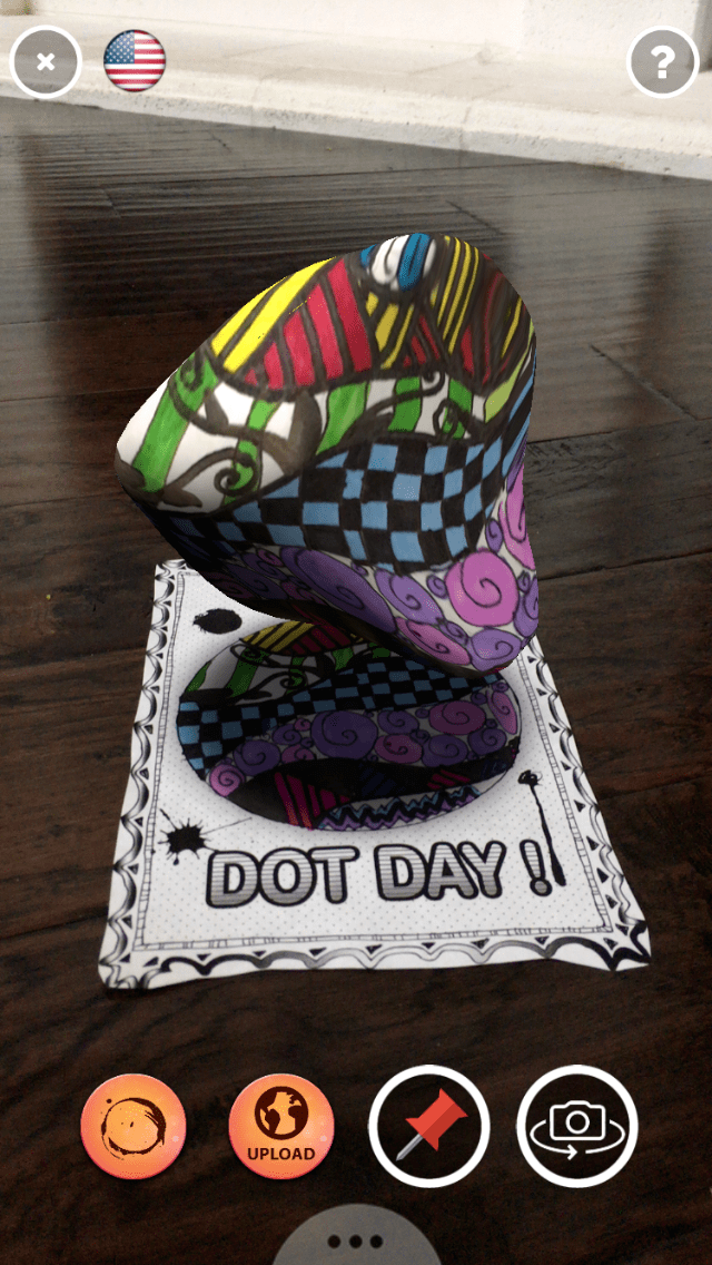 Once we completed our radial Zentangle compositions, we got ready to activate the AR part of it. To do that, we placed our drawings on the desk or the ground, put our iPads above the drawing, and tapped the Quiver app. The Quiver app loads every time it’s used, but then it uses the camera to find your drawing on its paper. Once discovered, you can toggle between 5 different functionalities that transform your design into something even more wonderful.