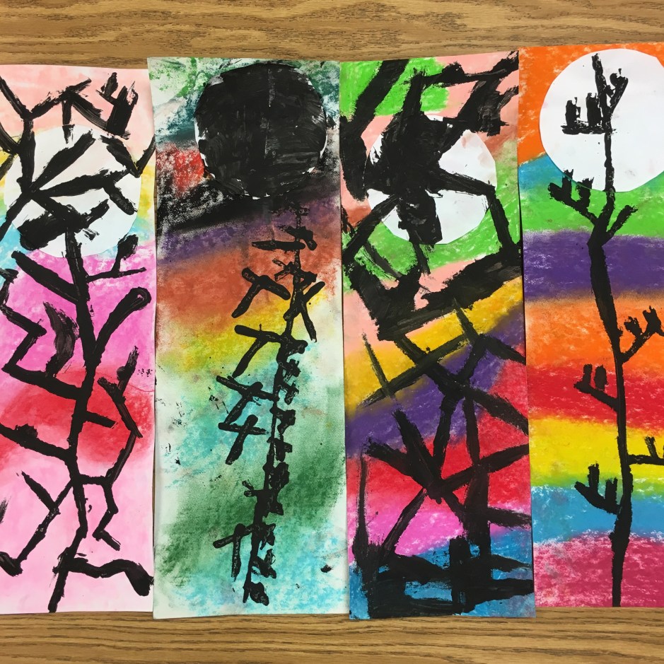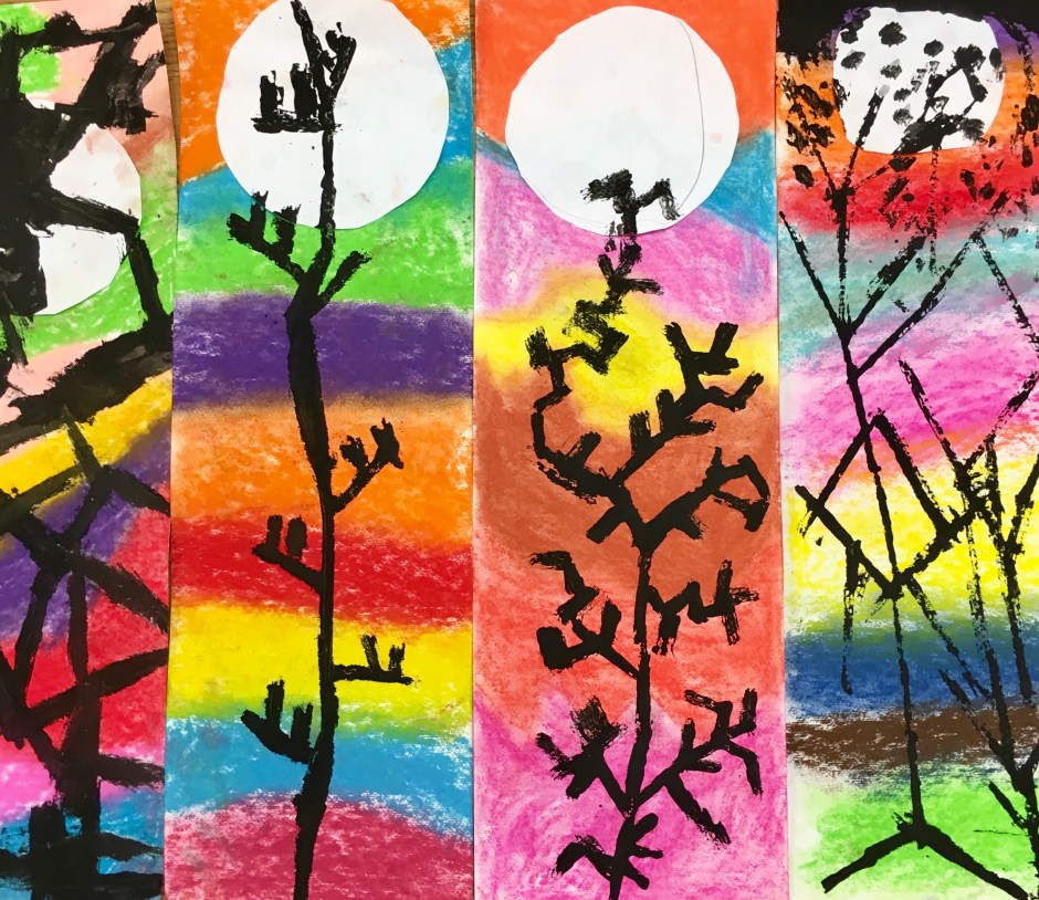 Once they fill their tall thin vertical paper with layer of vertical layer of gorgeous blended chalk pastel, they trace a bowl on a white piece of paper. Then they cut their moon out, glue it on and boom…there’s a moon shining high in a colorful sky.