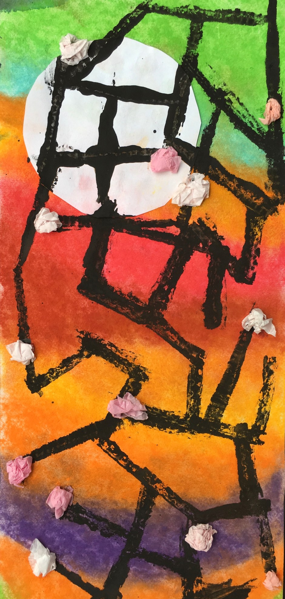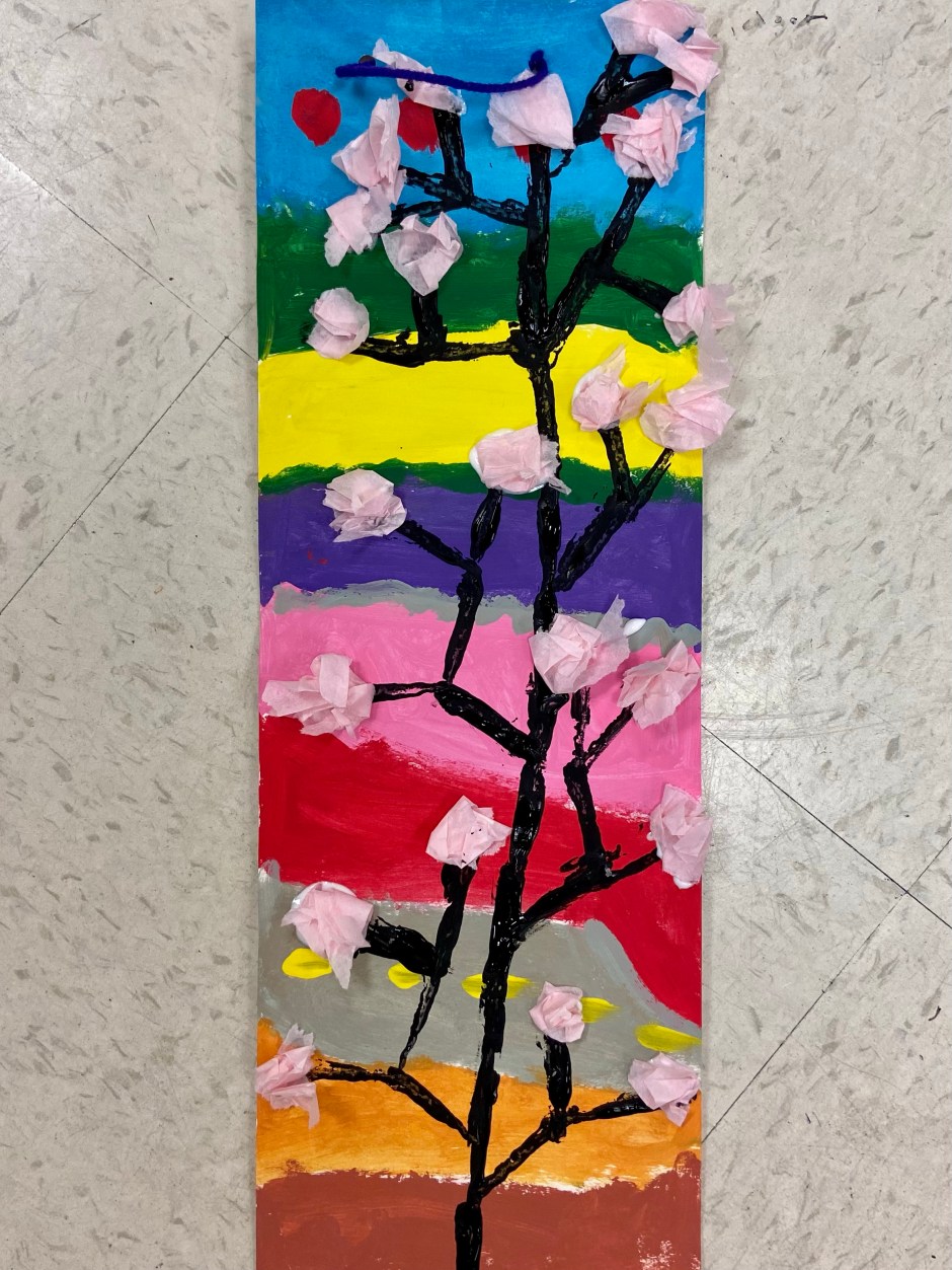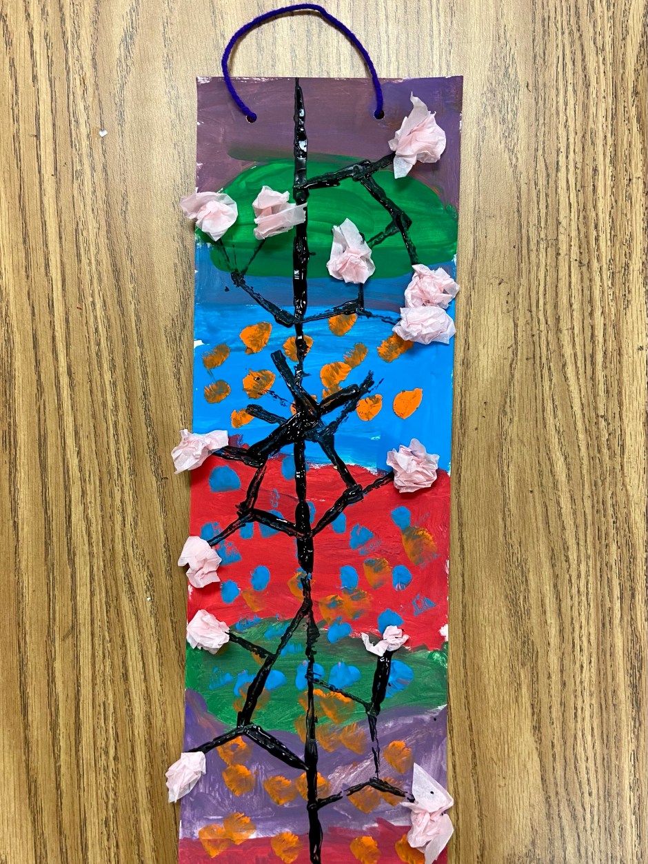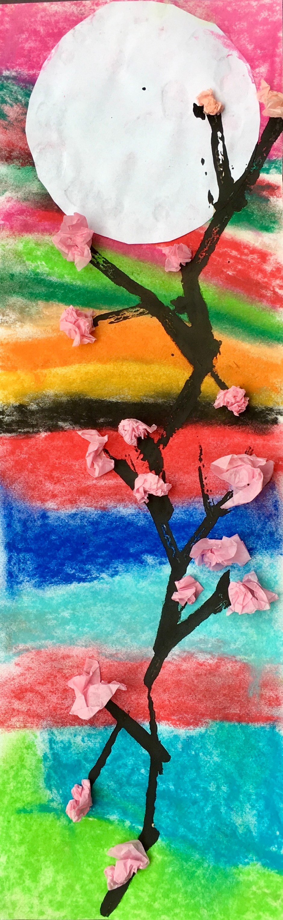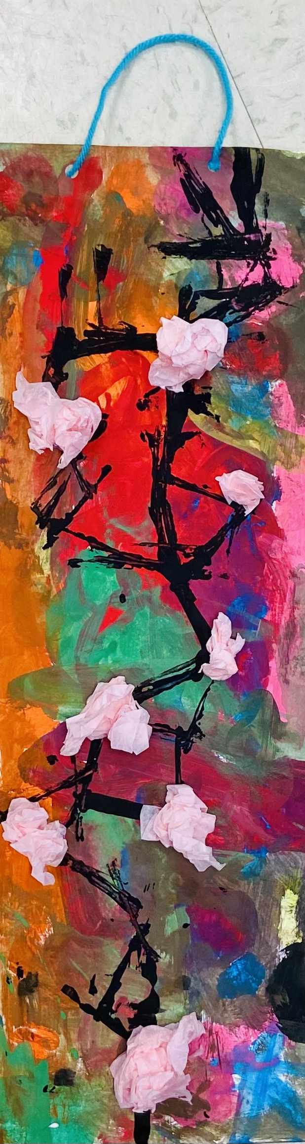For the cherry blossoms, I cut out small sections of pink tissue paper. I show them how to gently roll them up and glue them onto the branches. Then we’re done! Love how they come out, and the artists have fun throughout the process.