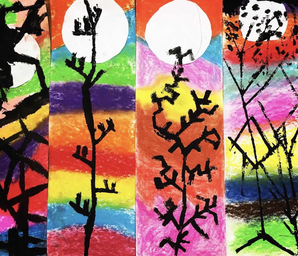 Once they fill their tall thin vertical paper with layer of vertical layer of gorgeous blended chalk pastel, they trace a bowl on a white piece of paper. Then they cut their moon out, glue it on and boom…there’s a moon shining high in a colorful sky.