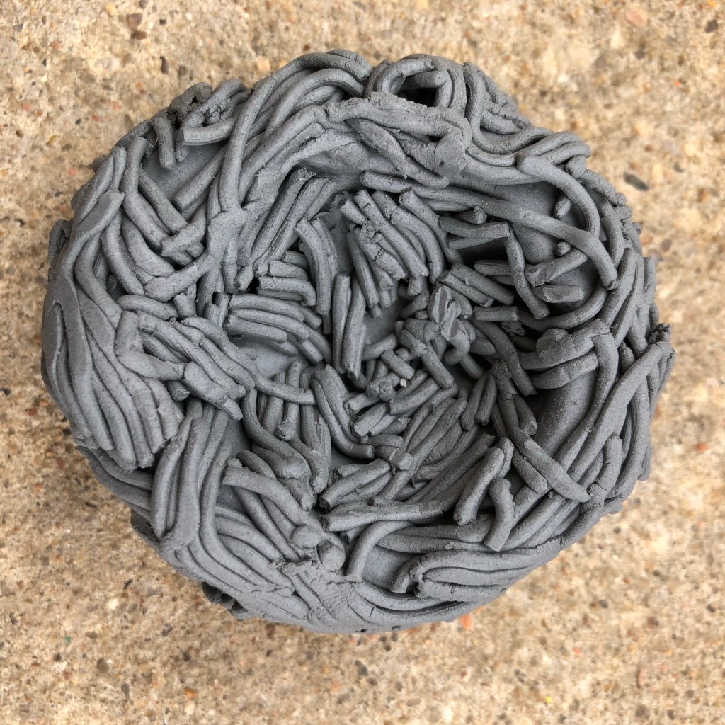 First you make a pinch pot. Then you wet a sphere of clay down and stuff it into a handheld garlic press.