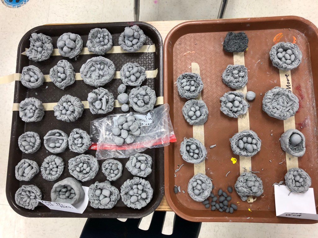 When I loaded all of the student nests into the kiln, there was about 5% clay noodle “shed” for each nest. This shedding dropped into the kiln, so in the future I am going to pick up and put down each dried nest before I put it into the kiln so the shed stays out of the kiln.