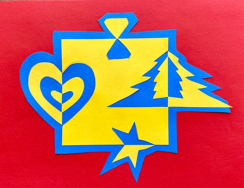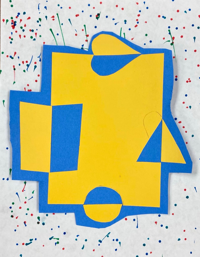 First, we talked briefly about color theory and high contrasting colors. Then they picked their middle squares and backgrounds. I demoed how to draw 4 basic shapes out of their squares. Then you flip each cut out shape and glue it so the negative space and the positive space of the notan work together to make something new.