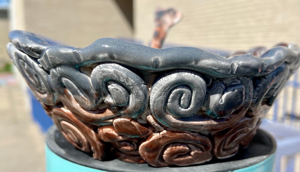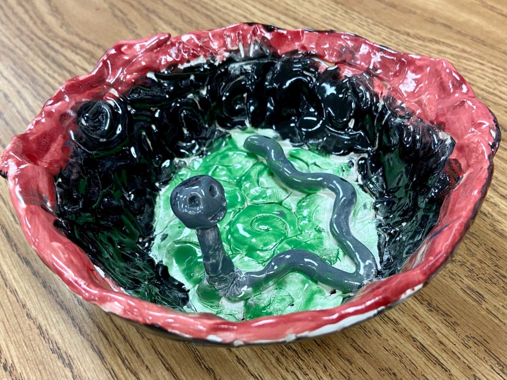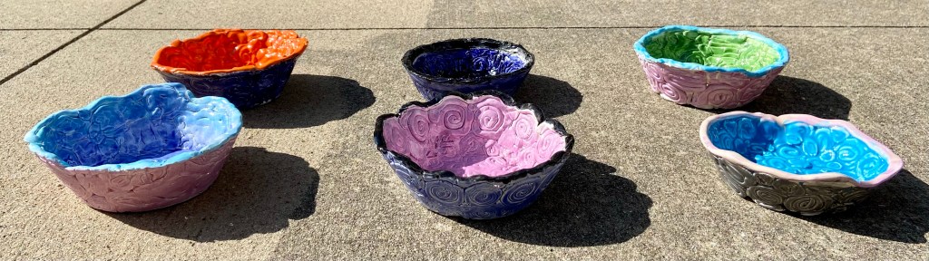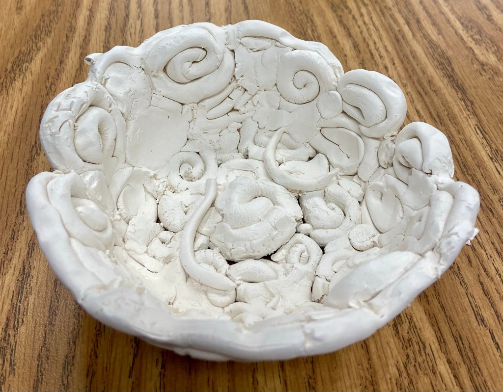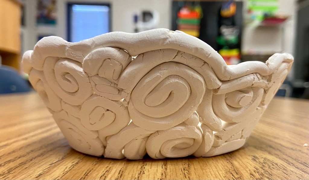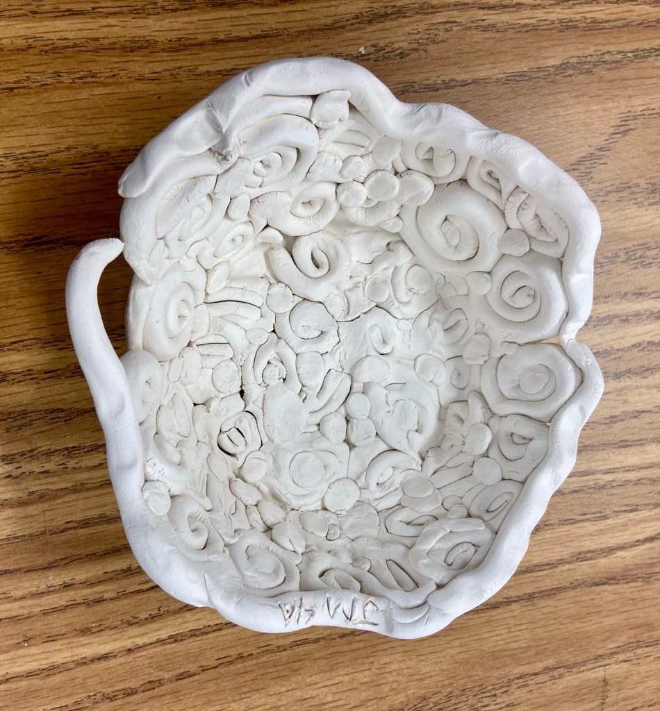 We have students from West Africa in Nigeria from the Yoruba, the Igbo, and the Mandinka tribes at our school. For this project, we focused on how the Igbo and Yoruba tribes’ clay historical vessels influenced our coiled clay bowls. We focused on the symbol-rich patterns of Adire fabric design for the Mandinka tribe in another project.