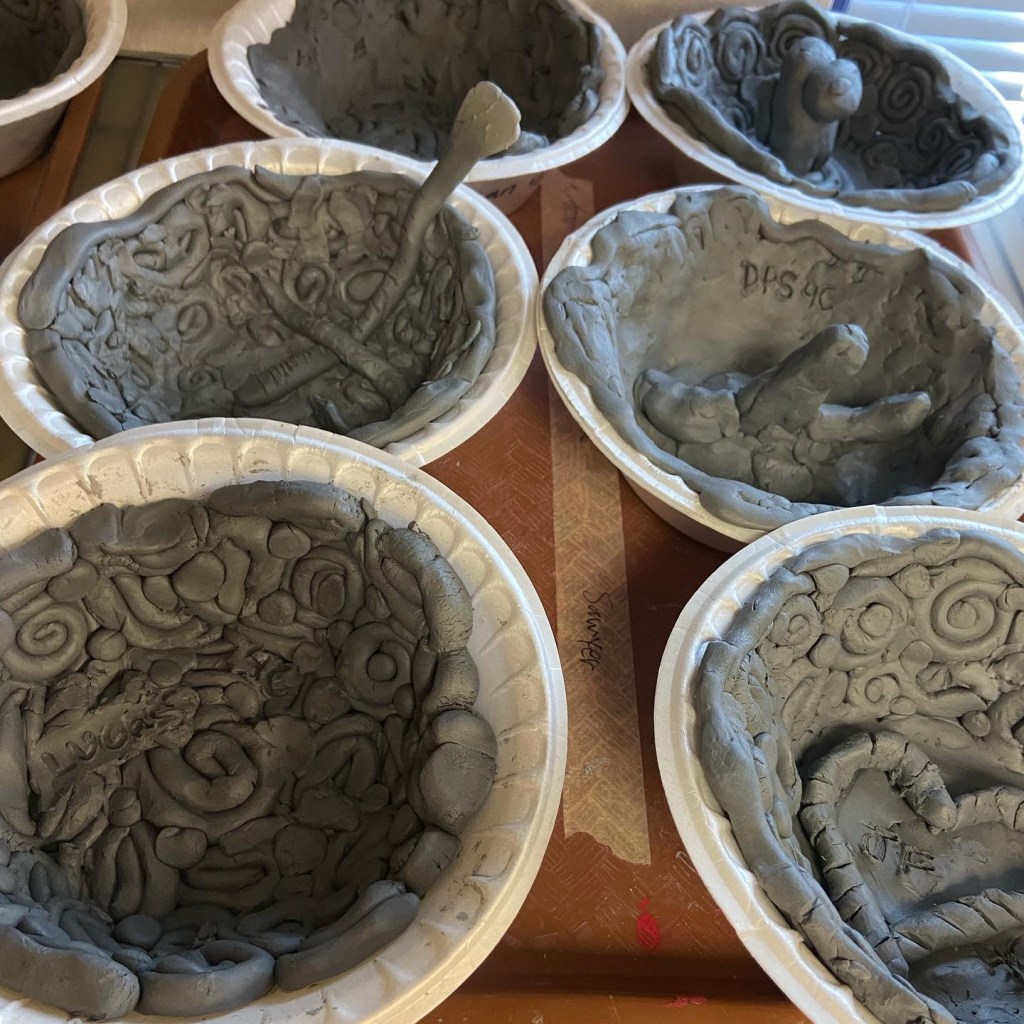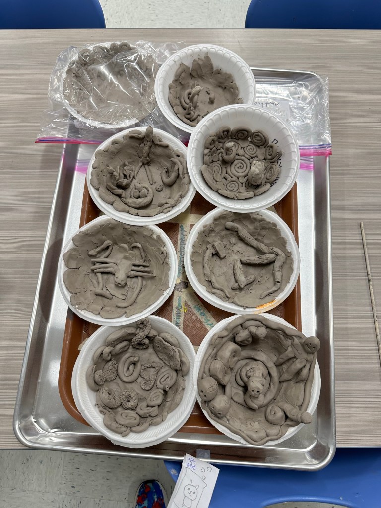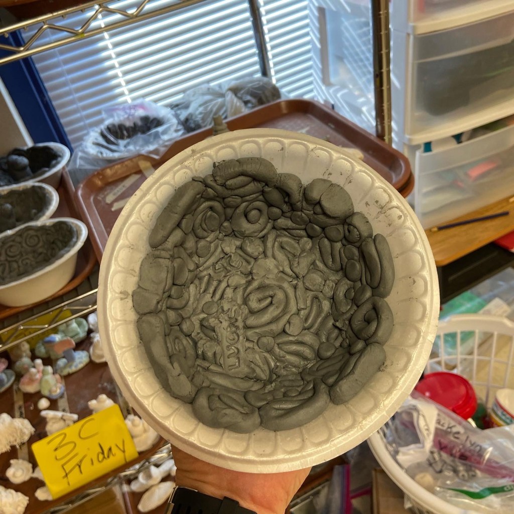 Each class was creating coils in their labeled Styrofoam bowls. We all started out smoothing the coils together for strength until one student asked if we had to smooth the inside. This was where I learned that you should either smooth the inside of the coiled bowls or really super tightly pack the coils together. How did I discover it was necessary for this process…?