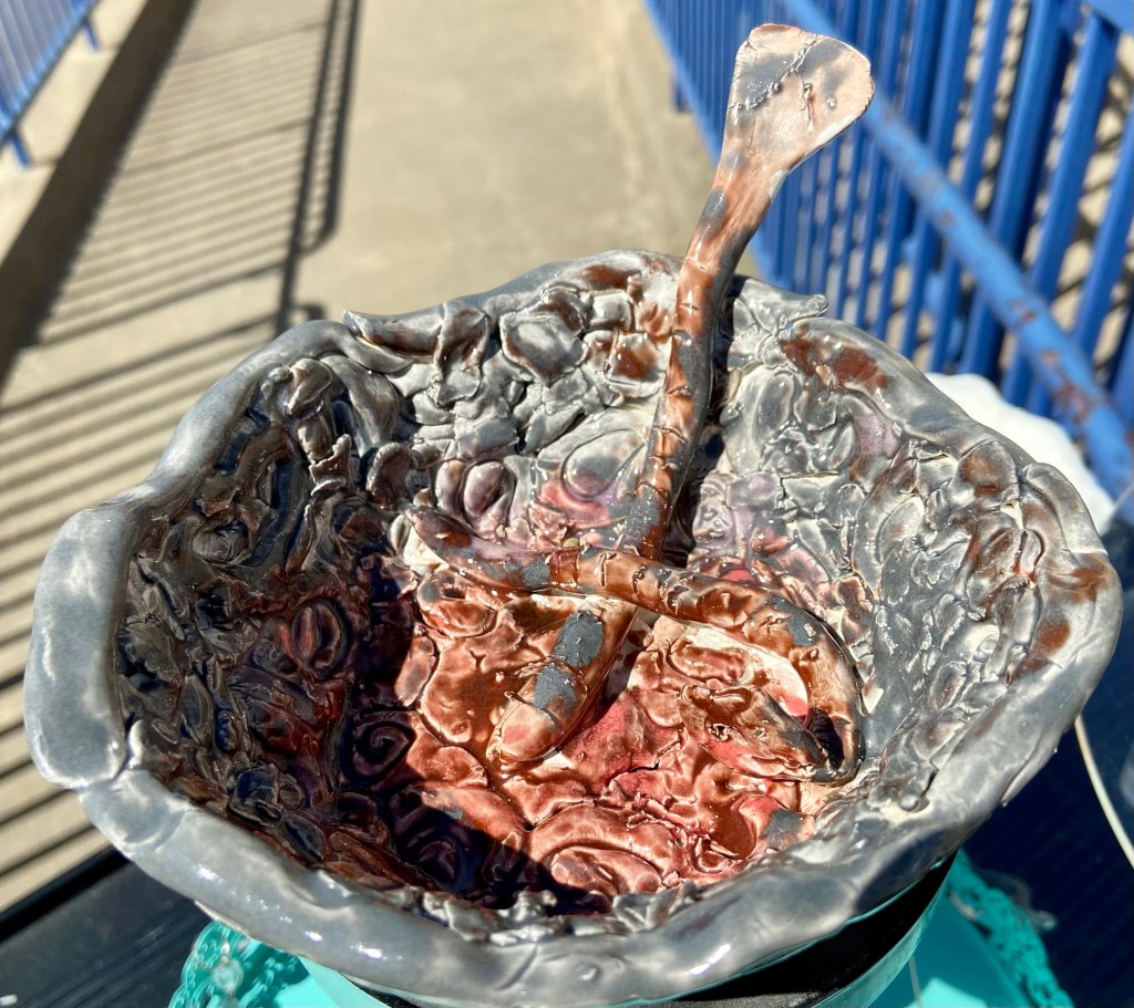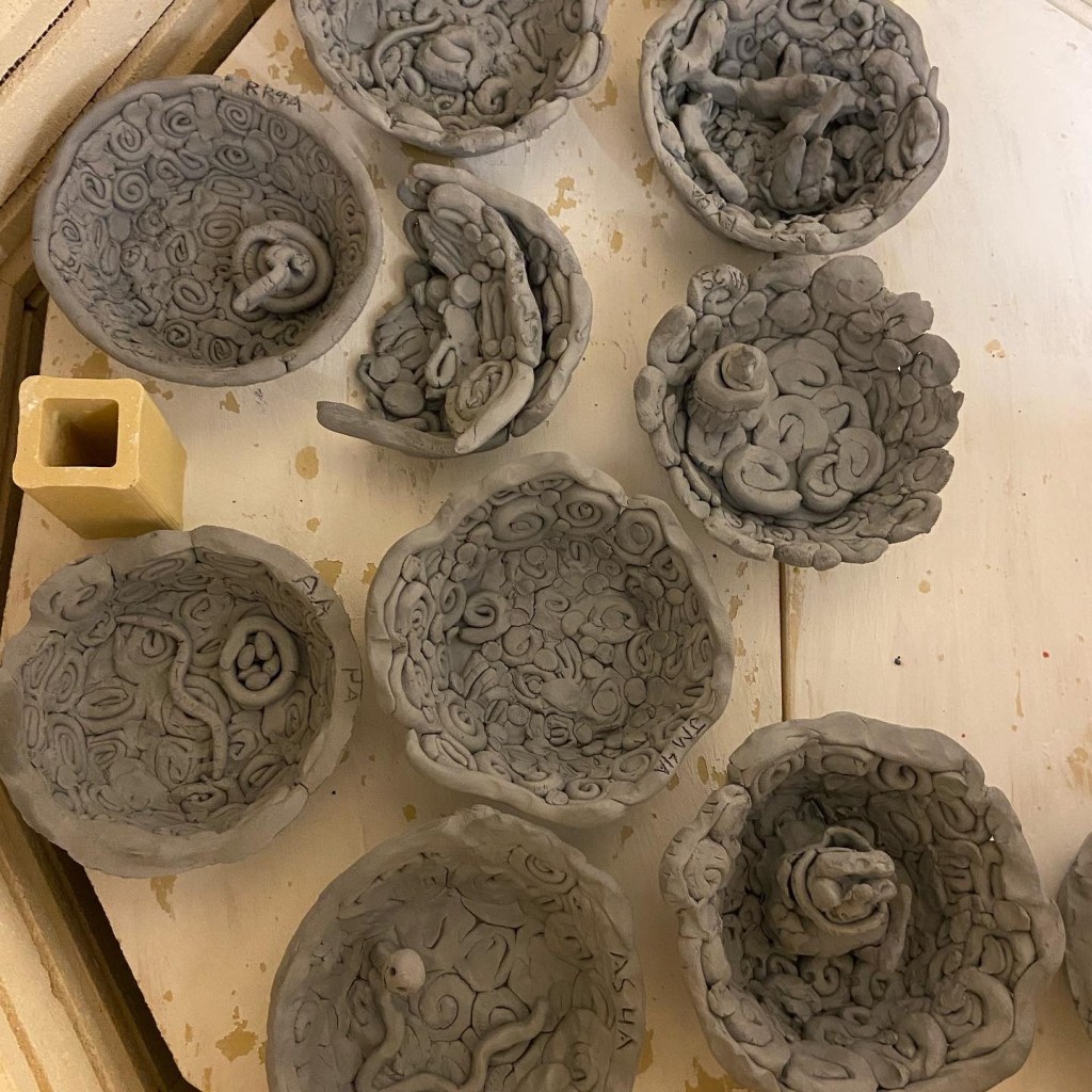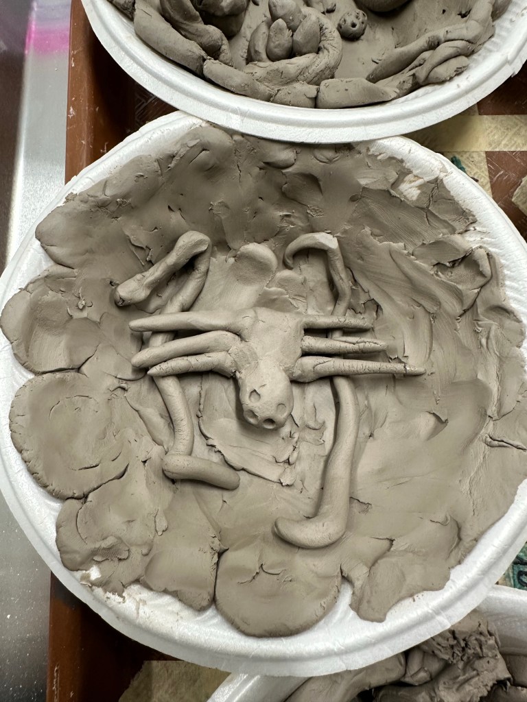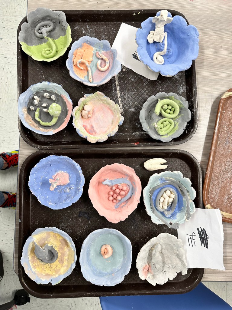 Each class was creating coils in their labeled Styrofoam bowls. We all started out smoothing the coils together for strength until one student asked if we had to smooth the inside. This was where I learned that you should either smooth the inside of the coiled bowls or really super tightly pack the coils together. How did I discover it was necessary for this process…?