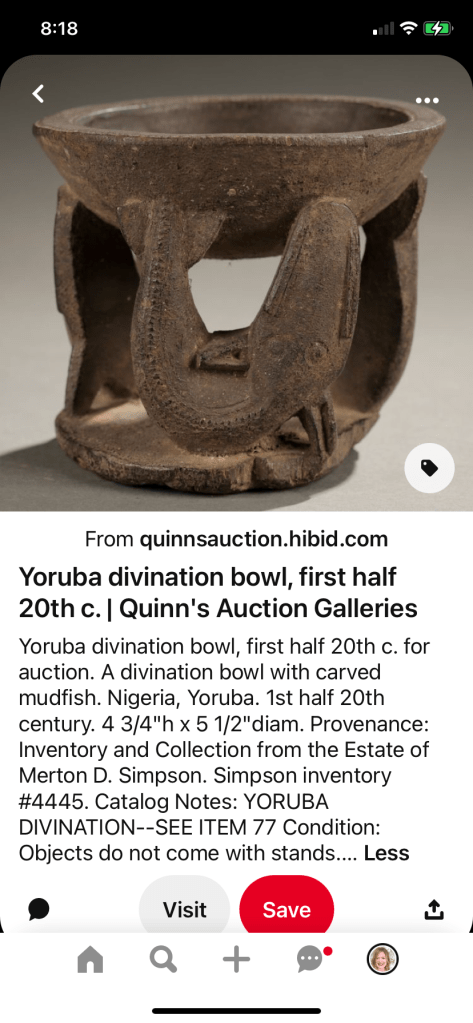 We also looked at how Yoruba pottery artists hand-formed clay mud fish, etc. from nature as the base for a clay bowl. (Pic from Quinn’s Auction Galleries)
