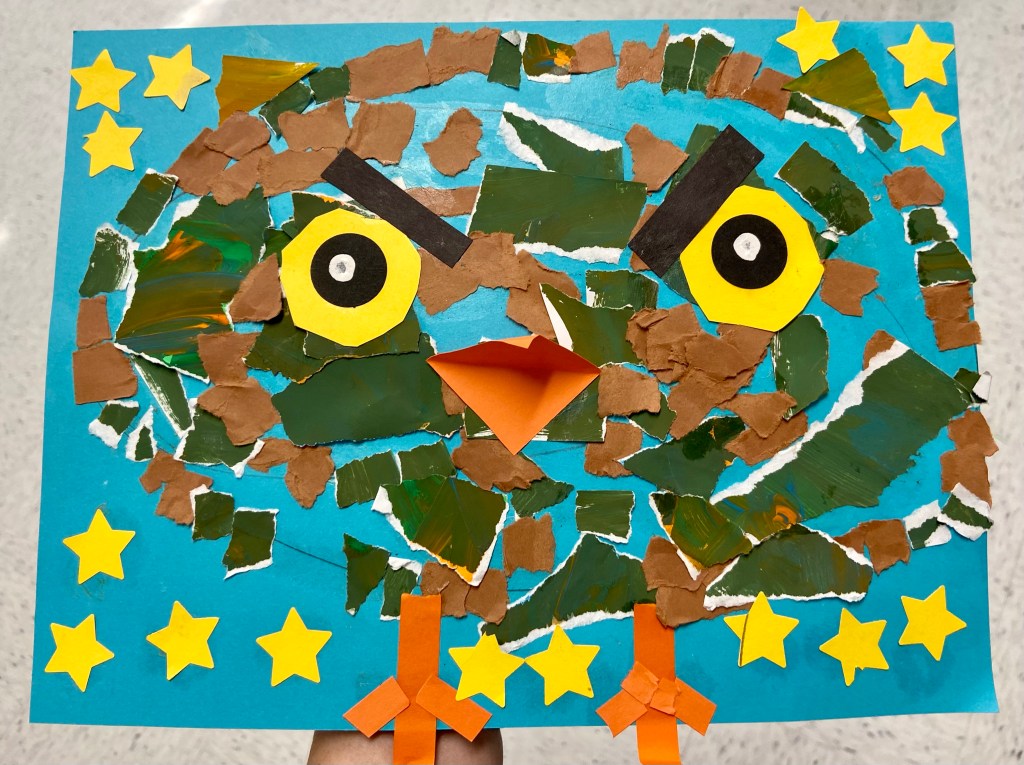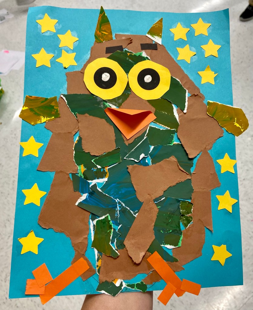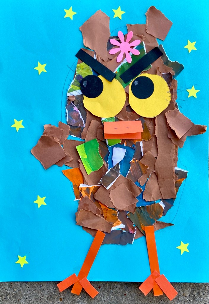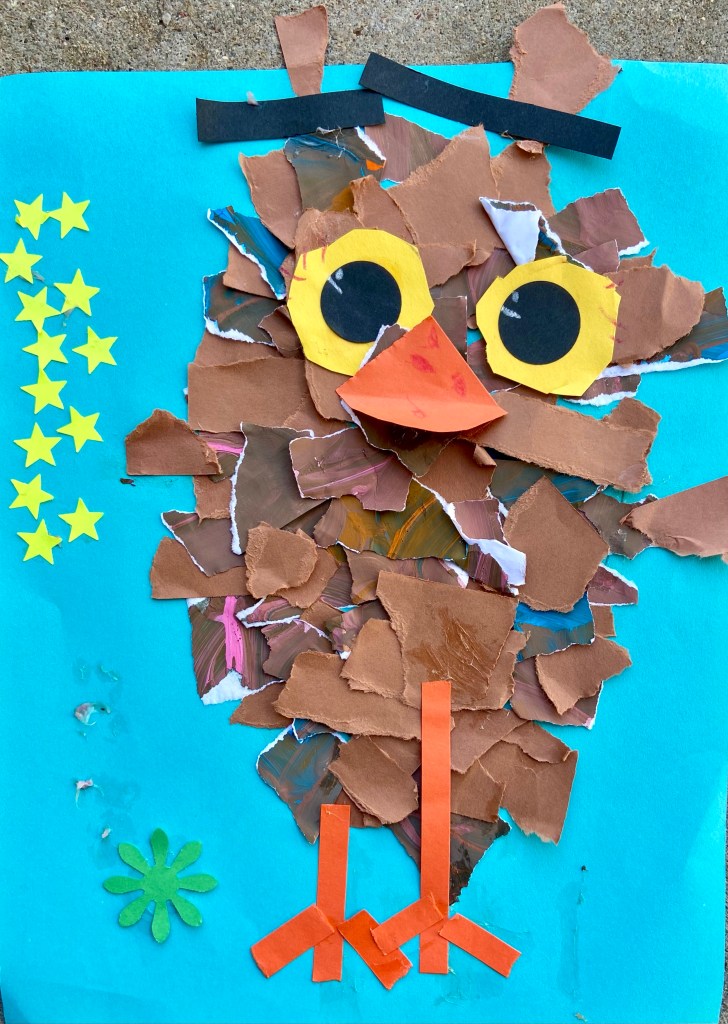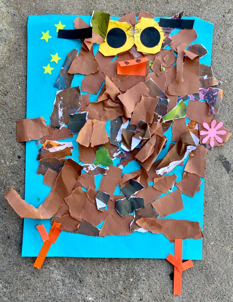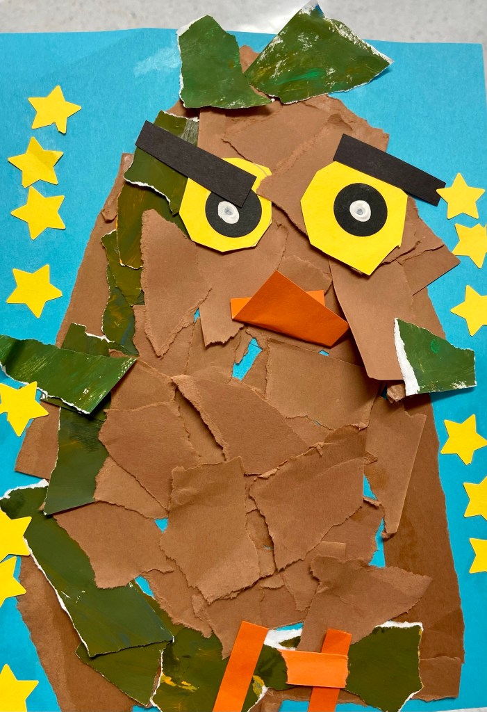 I’m so grateful to have discovered this gem of an art project from Mr. Giannetto. It’s a good project for drawing shapes, tearing paper, cutting, gluing, and creating owl personalities.