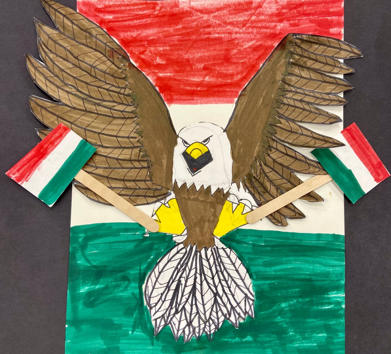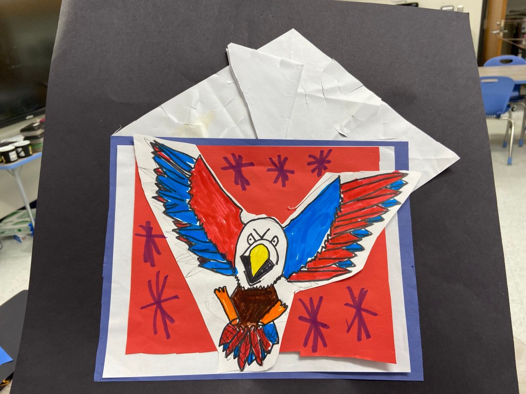 This year I wanted each grade level to create art to be displayed for Veteran’s Day. So each grade level worked on a different project. We tried to learn how to draw the American Coat of Arms, but it was way too advanced for 4th grade. So much complaining and frustration, no thanks. We changed our goal to draw only a majestic eagle at the beginning and go from there.