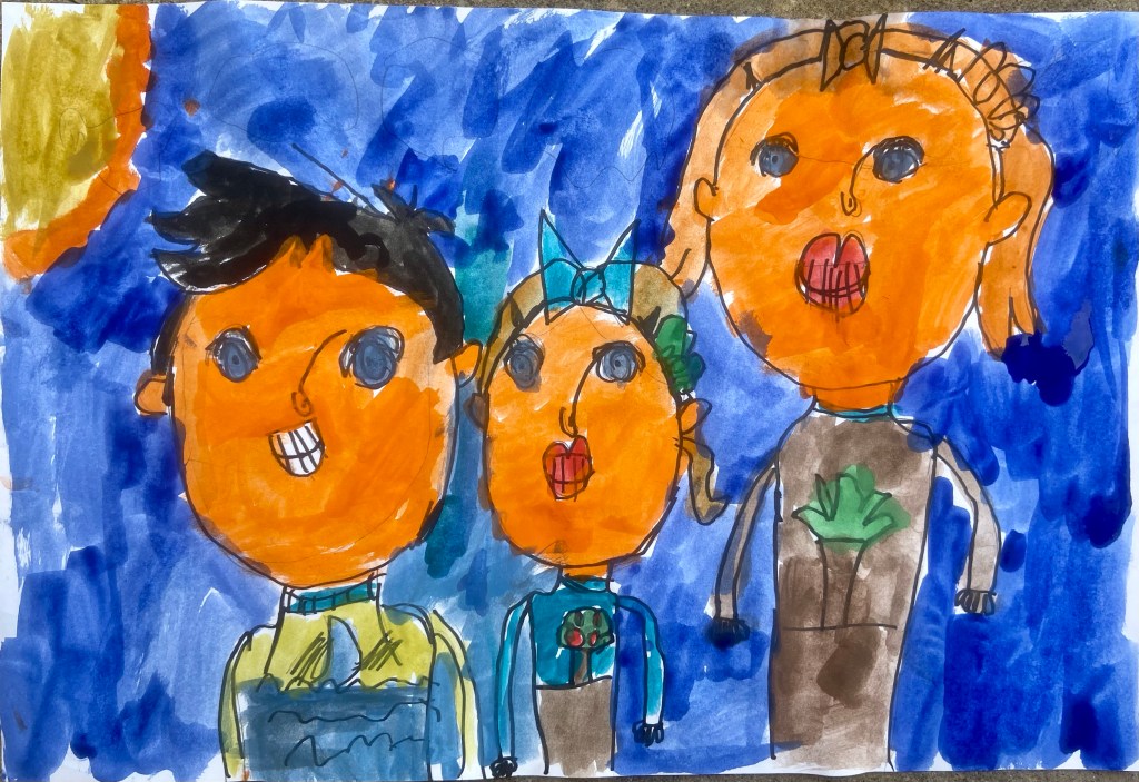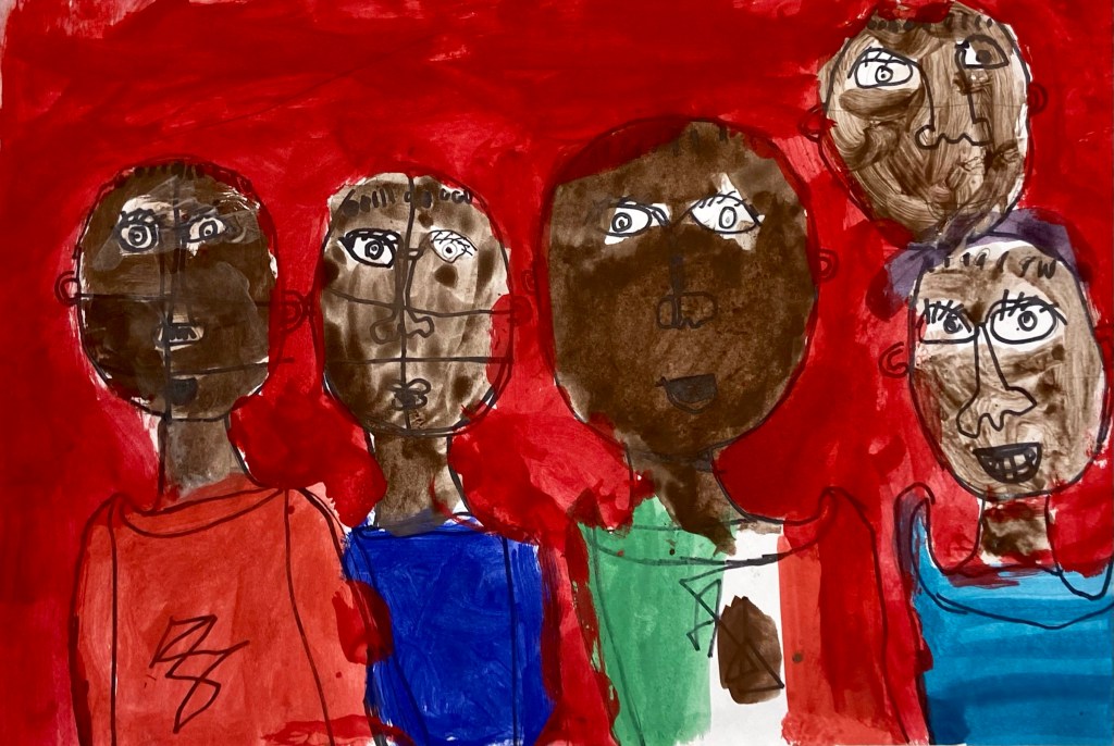 Getting the skin tone was a challenge. I ordered the Crayola Skin Tone Colors of the World Skin Tone Markers but all 5 boxes disappointingly arrived dried out. I also ordered Crayola Skin Tone Colors of the World Skin Tone washable paint with better effect. It was a little cakey/smeary on the paper’s surface but was okay overall.