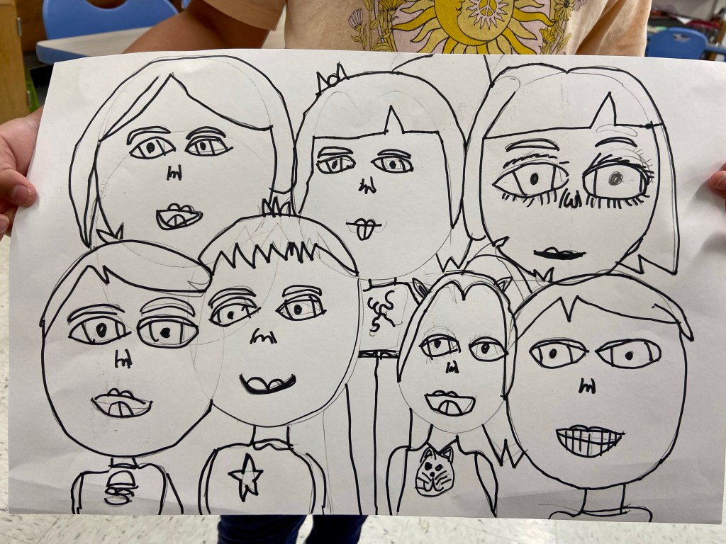 We looked at our faces and our classmates’ faces to see the facial features in real life. Then I would demo how to draw each feature and they would draw their own.