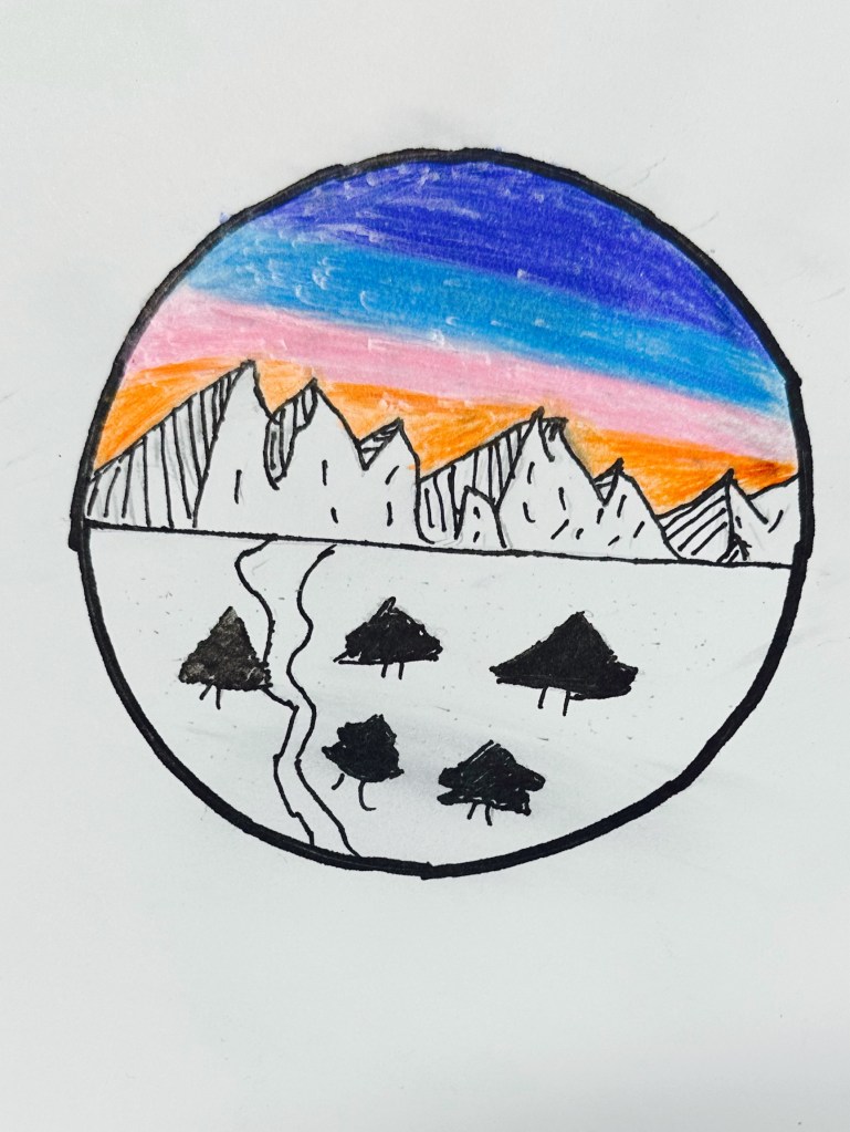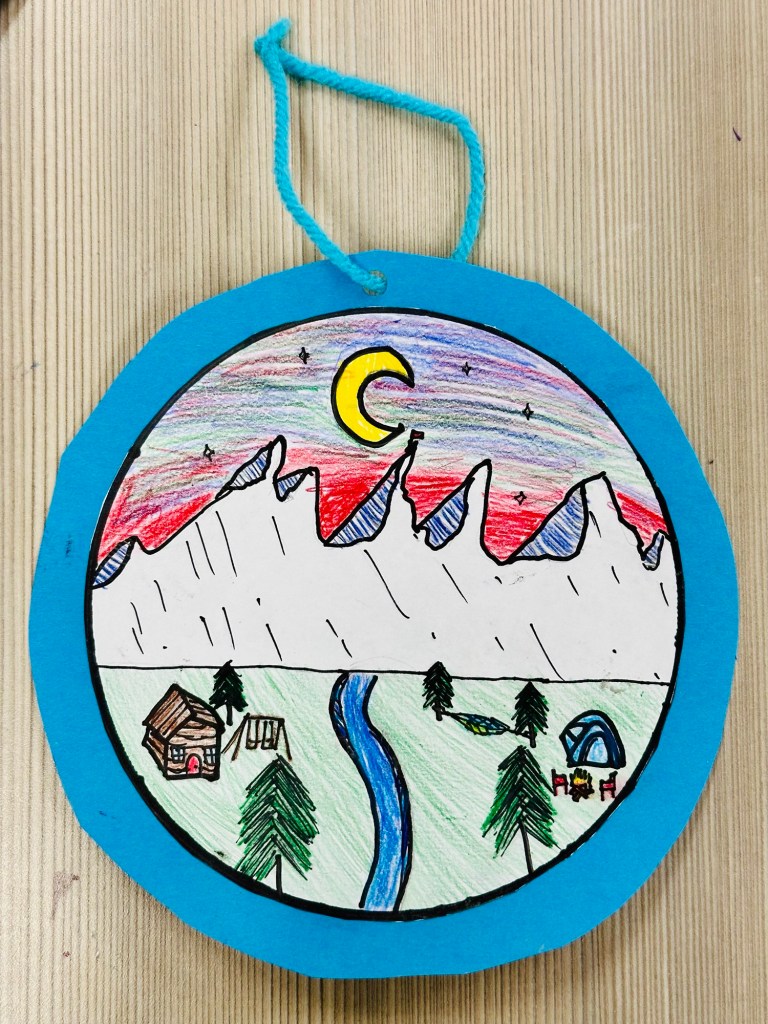 Her art features the great outdoors with snowy areas and mountains along with streams, tents, trees, and being outdoorsy.