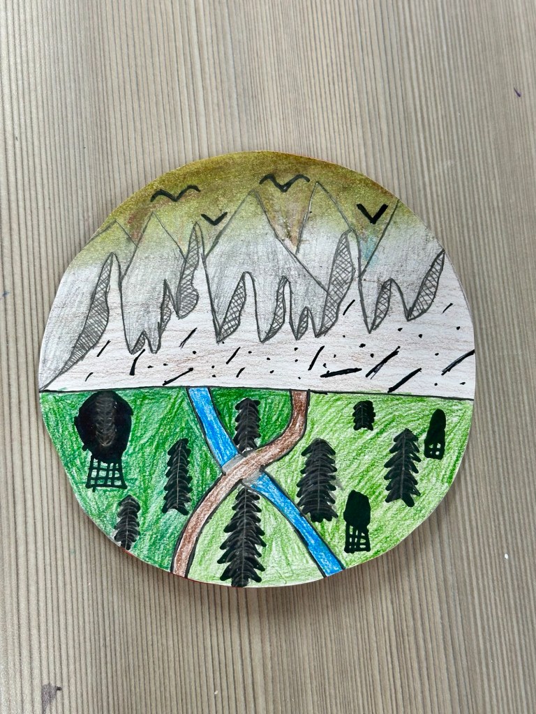 5th grade had recently come back from camp when we started this project. I asked them what they liked doing at camp (hoping their answers would loosely follow what Jen Aranyi draws about and paints.)