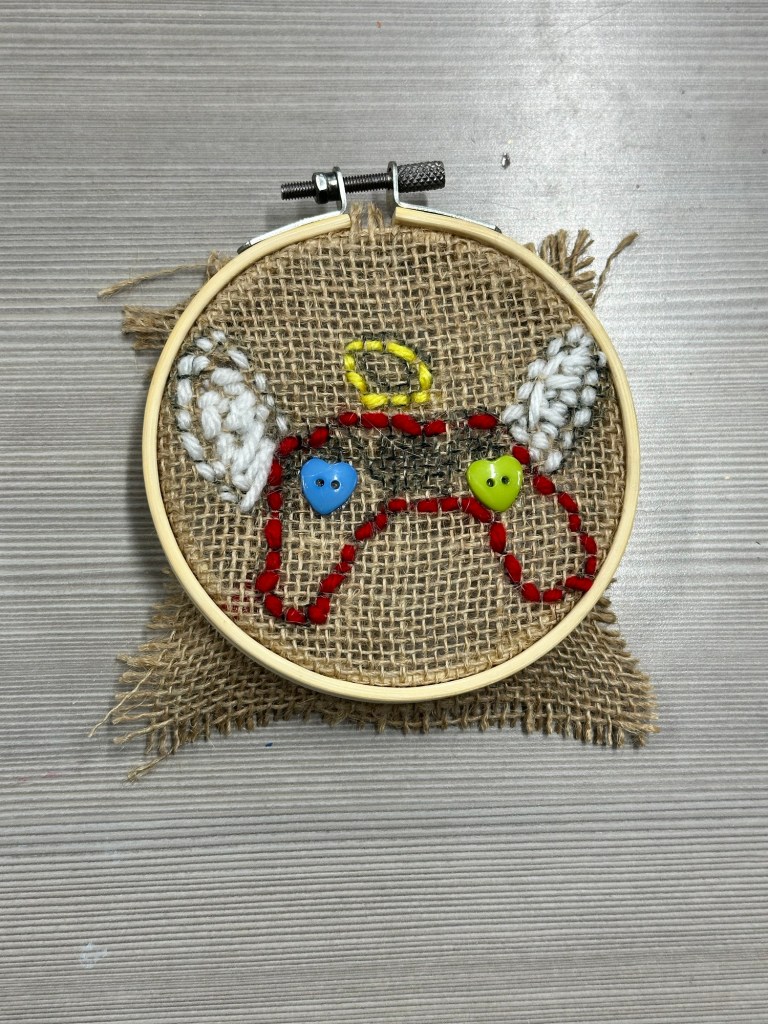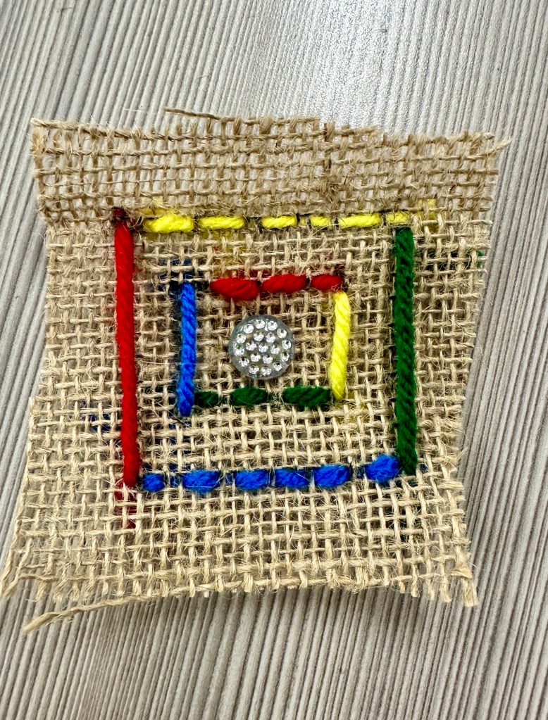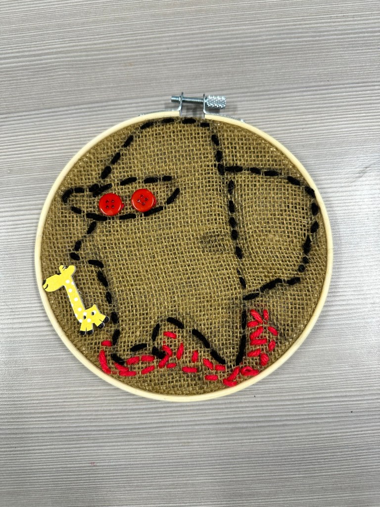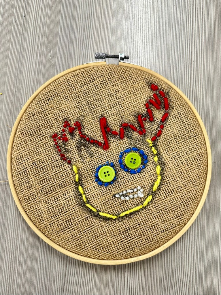 I originally thought that the goals of this project would be to learn how to stitch a design with at least 2 colors of thread and to learn how to sew on a button. My button’s holes were too small for our mega needles so I bought a smaller metal set and a class set of needle threaders. The logistics of threading everyone’s needles for just the button plus the fact that somehow I bought some novelty buttons without holes created an easier solution of me hot gluing their buttons/nonbuttons onto their stitched design.